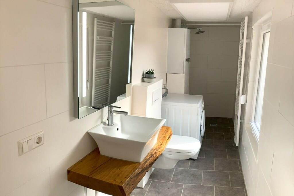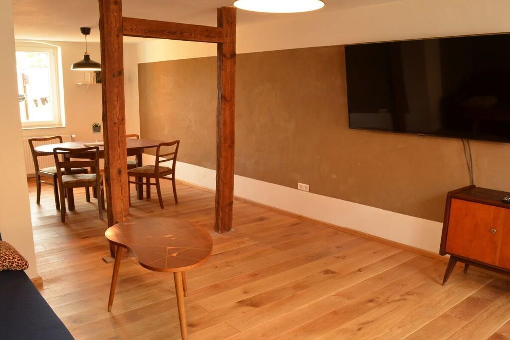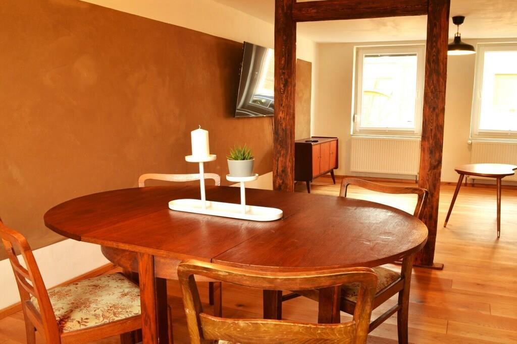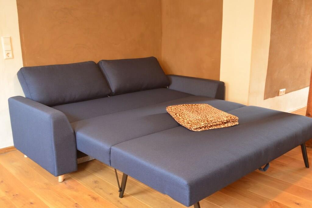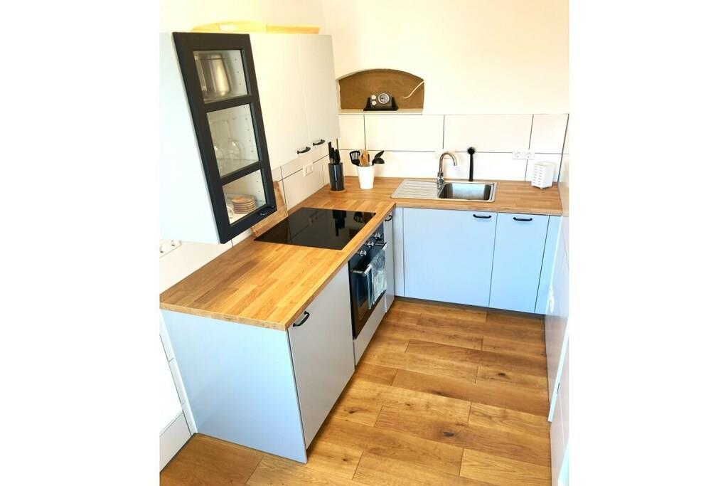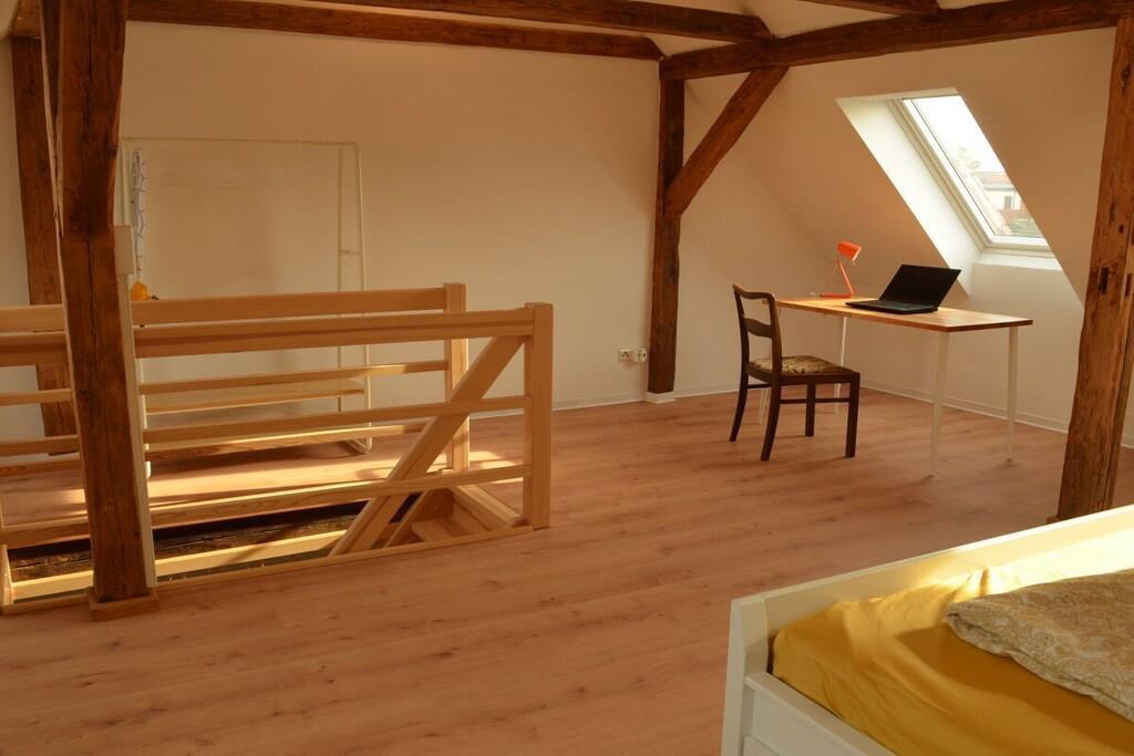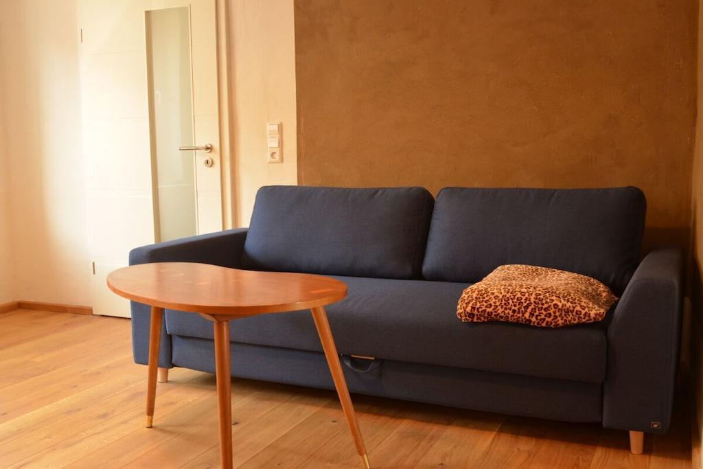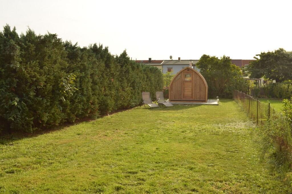 Im Erdgeschoss des 85 qm großen Reihenhauses befinden sich der Wohn- und Essbereich, die kleine Küche und das Bad. Das geräumige Wohnzimmer verfügt über ein Schlafsofa, das Platz für zwei Personen bietet, einen 65-Zoll-Fernseher mit Smart-TV und einen Essbereich. Dort kommen die im Haus verbauten Naturwerkstoffe, wie beispielsweise die Echtholzdielenböden und die Lehmwände, besonders zur Geltung und sorgen für eine gemütliche Atmosphäre. Die Küche enthält einen Kühlschrank inkl. Gefrierfach, einen Backofen mit Induktionskochplatten und einen Spülbereich. Die vorhandene Auswahl an Küchenutensilien ermöglicht die Zubereitung verschiedener Speisen. Das Badezimmer ist mit einer ebenerdigen Regendusche, einer Toilette, einem Waschtisch und einer Waschmaschine ausgestattet. Das Dachgeschoss ist durch eine offene Treppe nach oben begehbar. Dort befindet sich das Schlafzimmer mit einem bequemen Doppelbett (200 x 180 cm), einer Garderobe und einem Schreibtisch. Das lichtdurchflutete Zimmer kann mit Hilfe von Hitzeschutzmarkisen kühl gehalten werden. Verdunkelungsrollos begünstigen ein langes Ausschlafen im Urlaub, bis der Hahn am späten Morgen kräht. Im Garten bietet eine überdachte Terrasse Gelegenheit sich nach draußen zu setzen und zu grillen. Über die Rasenfläche gelangt man zur mit Holz beheizten Iglu-Sauna, die zum Entspannen einlädt. In wolkenlosen Nächten empfiehlt es sich dabei auf den Gartenliegen gen Himmel zu schauen und die Sterne anzusehen. Falls Interesse besteht die Umgebung zu erkunden, können die hauseigenen Fahrräder ebenfalls ohne Aufpreis verwendet werden. Als mögliche Ziele wären hier unter anderem die nächstgelegenen Badeseen oder die Hansestadt Stendal zu nennen, auf dem Elberadweg gelangt man flussabwärts zur Aussichtsplattform Arneburg.