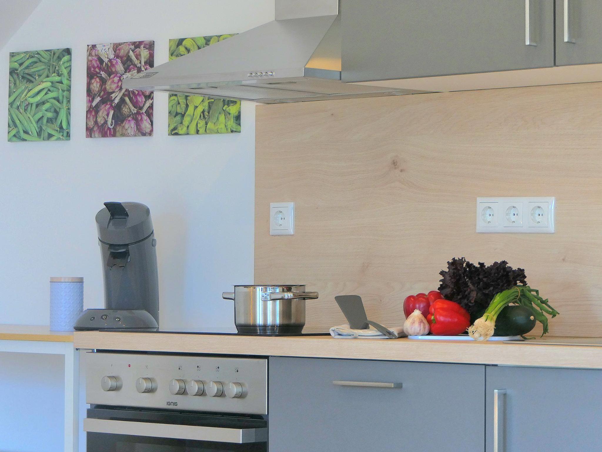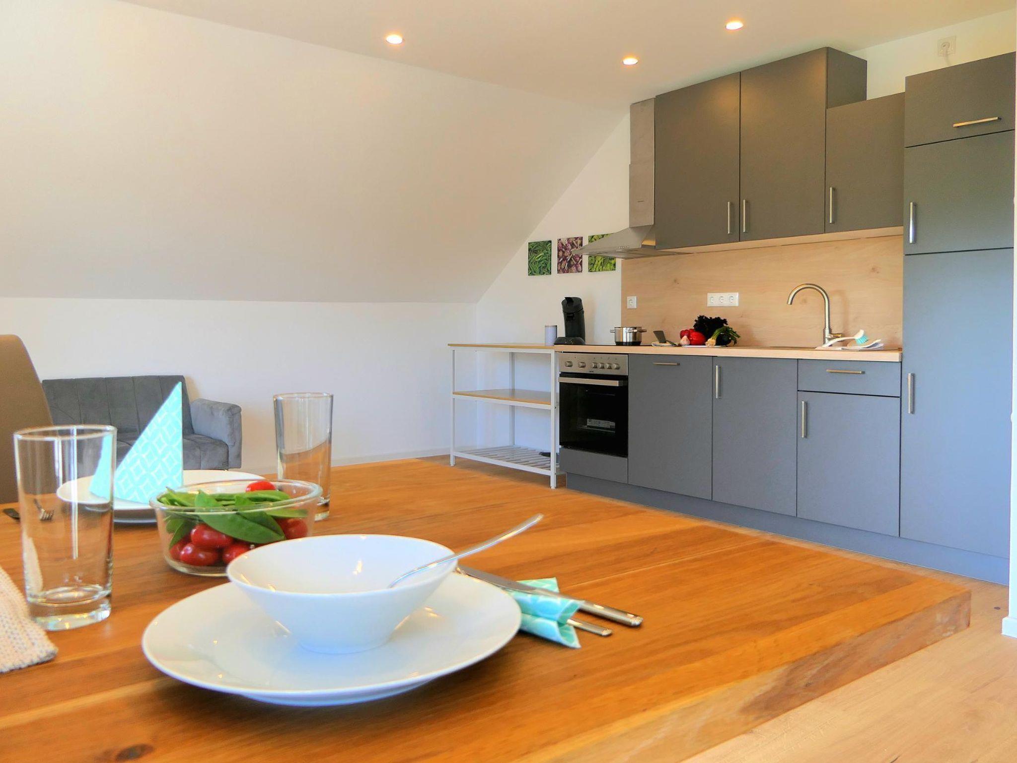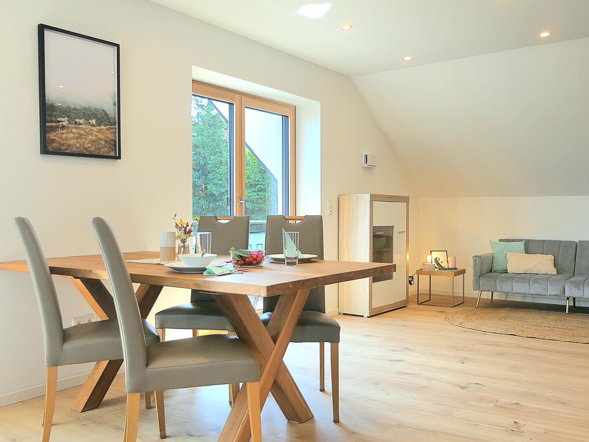 Gemütliche 70?m² große Ferienwohnung mit 1 Schlafzimmer, 1 komfortables Bad mit Regenwalddusche sowie einem großzügigen Wohn-Essbereich mit offener Küche. Das Schlafzimmer ist mit einem komfortablen Doppelbett (200×200?cm, ohne Fußteil) ausgestattet. Im Wohnbereich stehen zwei Schlafcouches für je eine Person zur Verfügung – ideal für Familien oder kleine Gruppen.