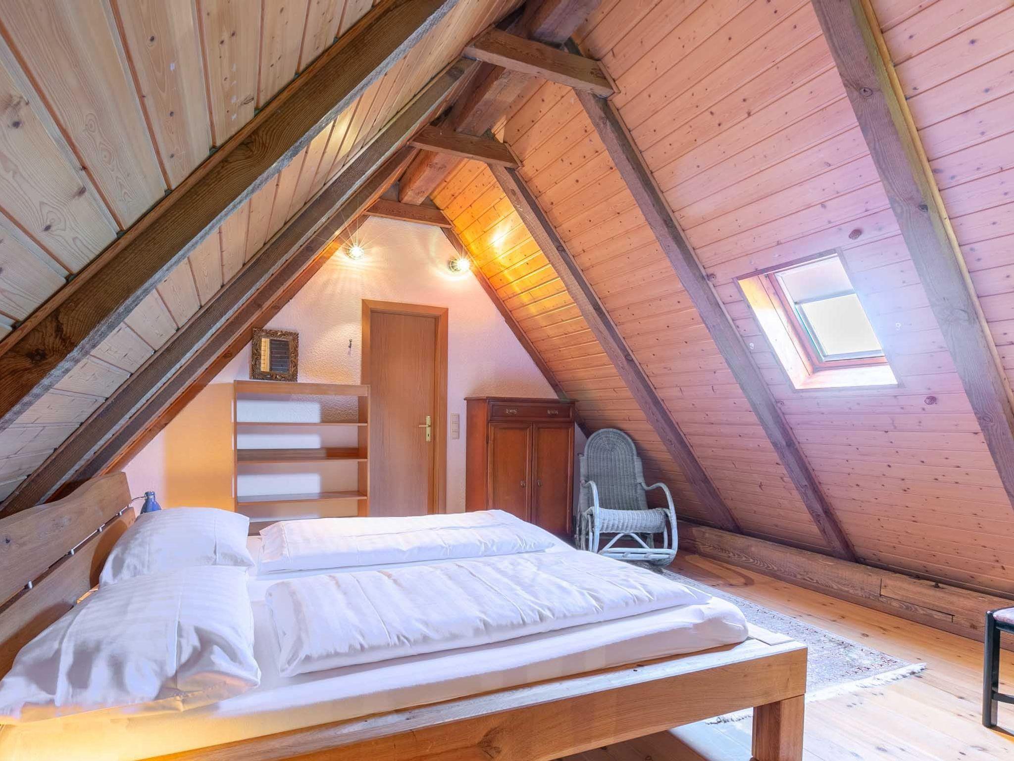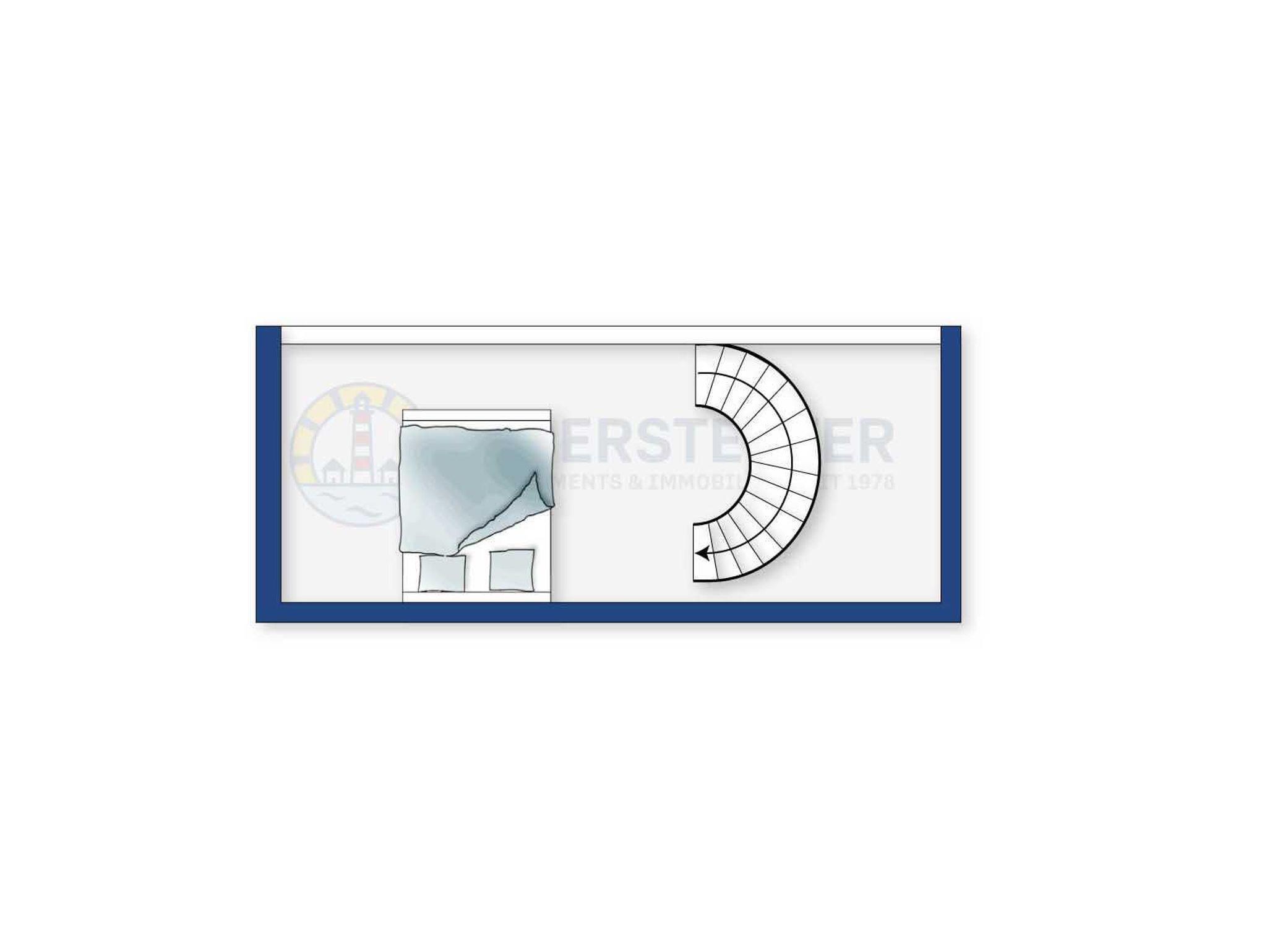 2. Schlafzimmer mit Doppelbett (180x200cm), zwei Stühlen, einem Korbsessel und Kommodenschrank. Dieses Schlafzimmer ist galerieartig offen zum Wohnzimmer und über eine Wendeltreppe aus dem Wohnzimmer erreichbar.