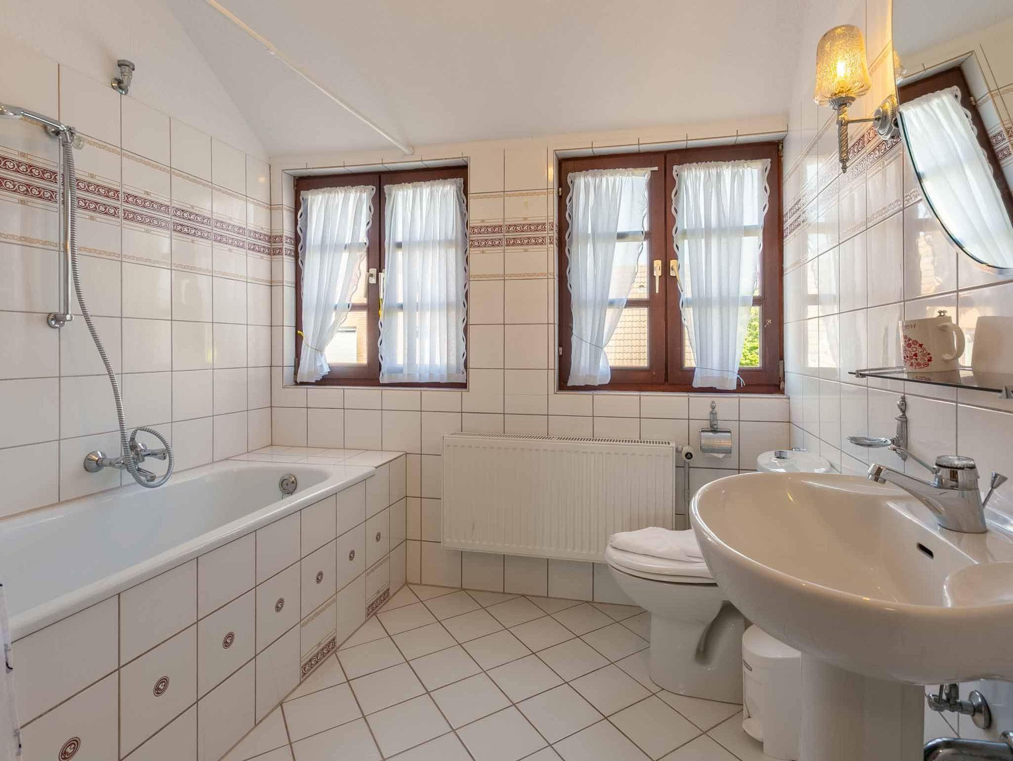 Badezimmer (Wannenbad) mit Badewanne mit Duschhandstück, WC und Tageslicht.