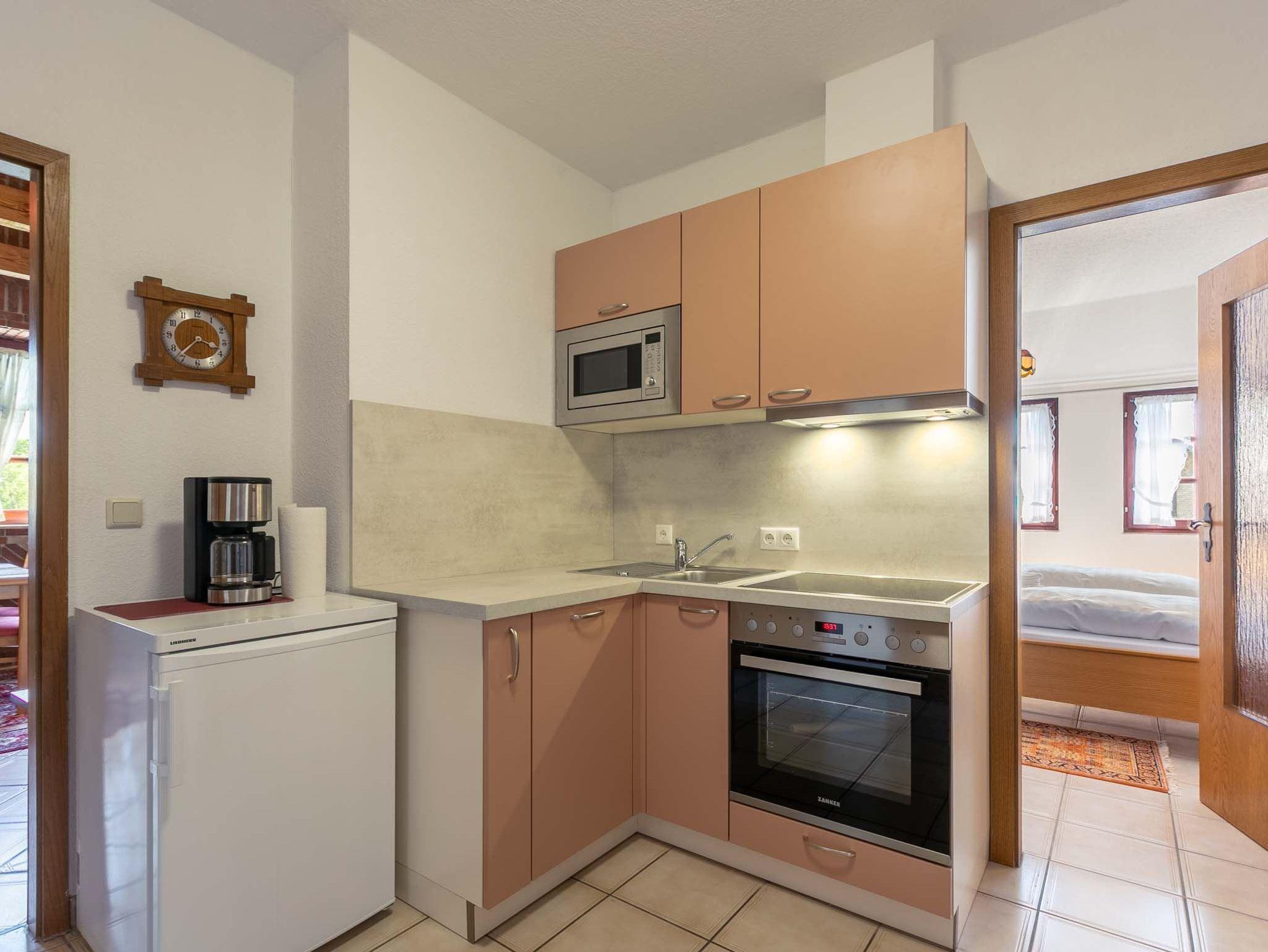 Separate Küche im Eingangsbereich mit Backofen, Geschirrspüler und Kühlschrank mit Gefrierfach. Abstellraum mit Staubsauger.