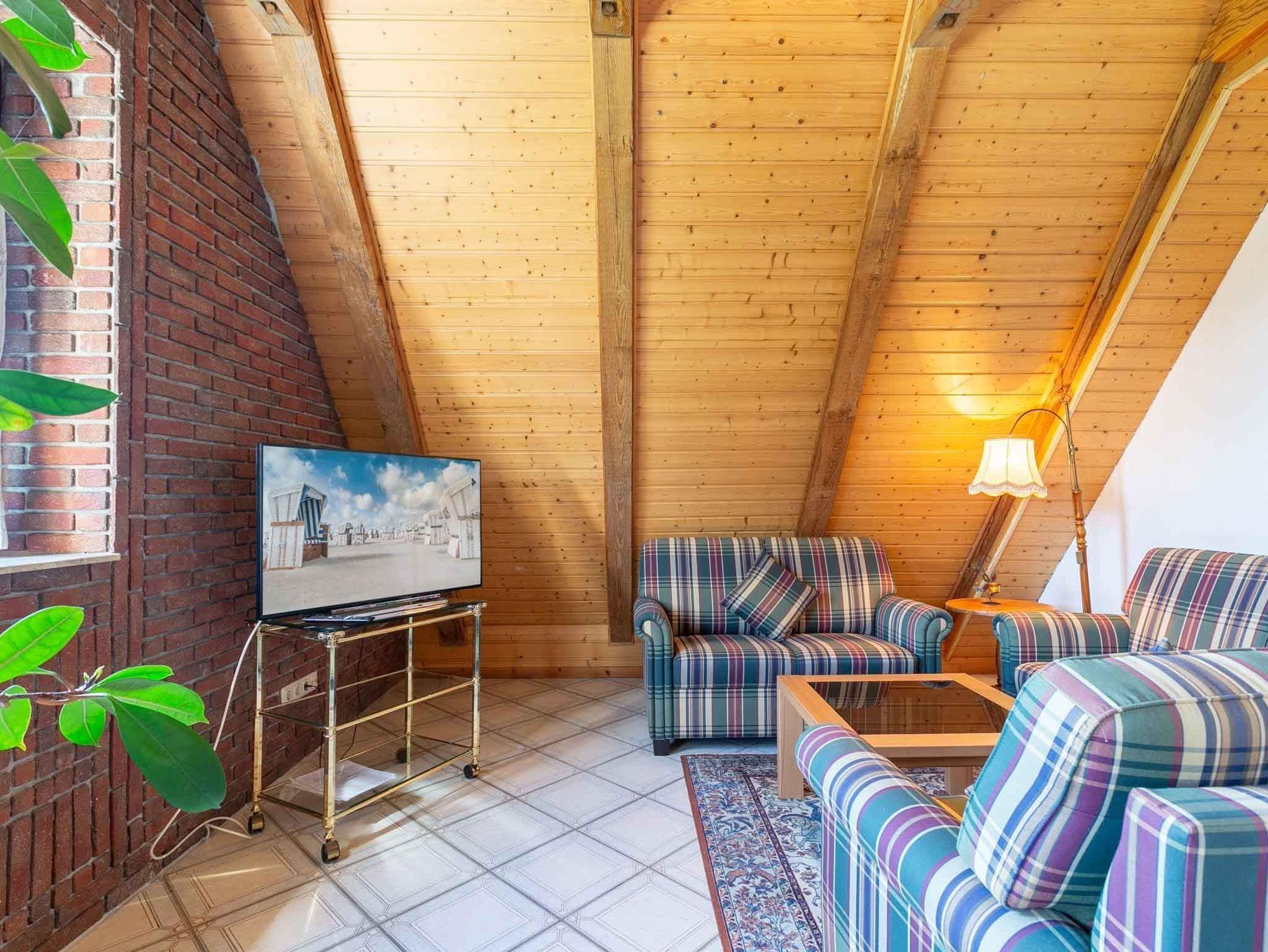 Wohnzimmer mit zwei Sofas für 2-3 Personen, einem Sessel, TV (Sat) und Esstisch mit 4 Stühlen.