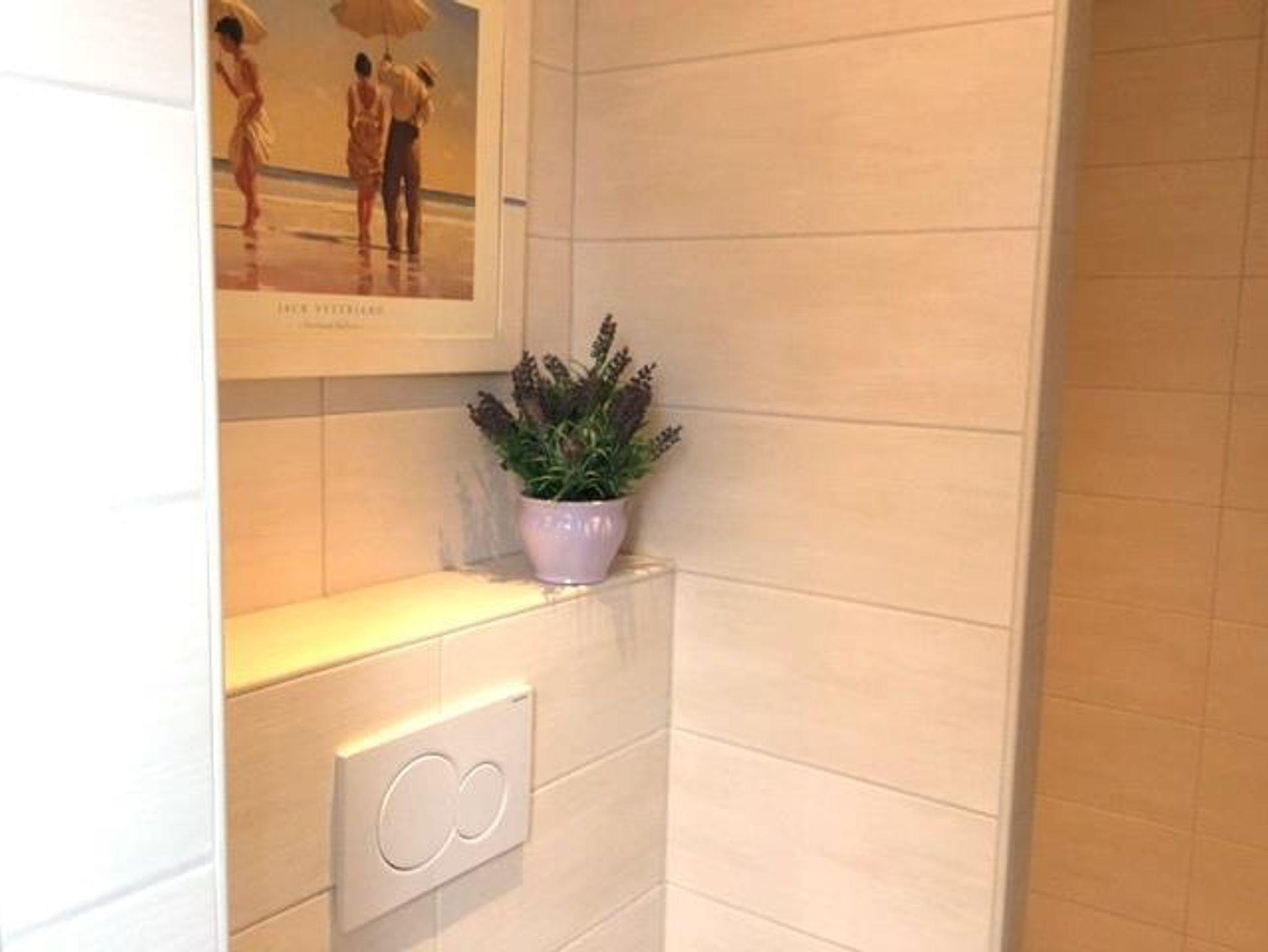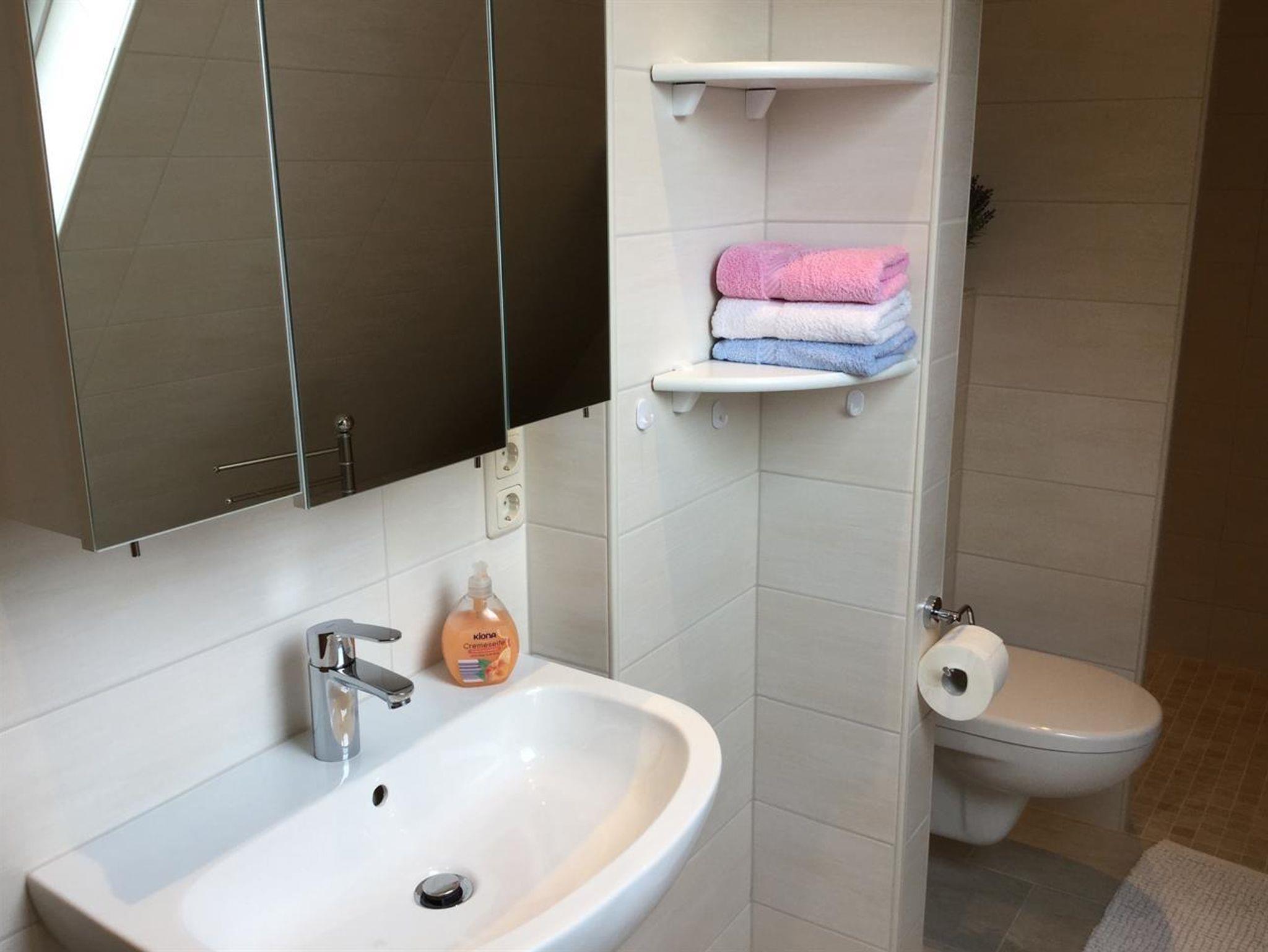 mit Spiegelschrank, Fön, Kosmetikspiegel, WC und ebenerdiger Dusche zur Verfügung.