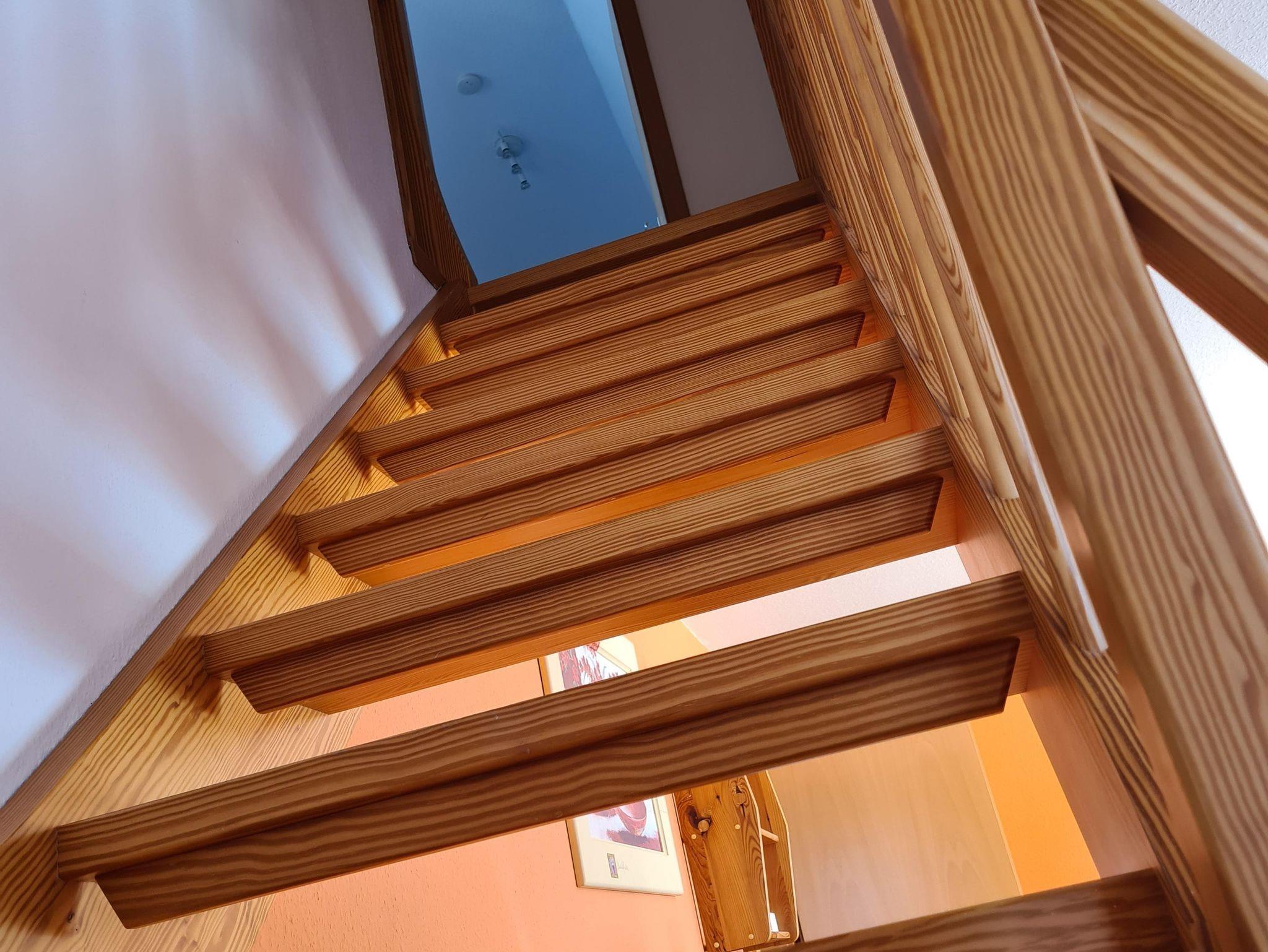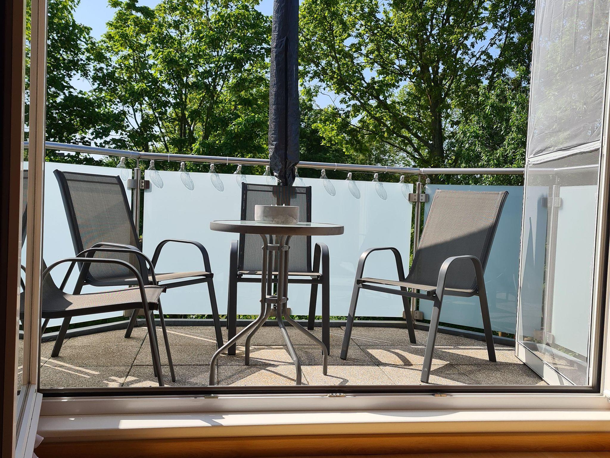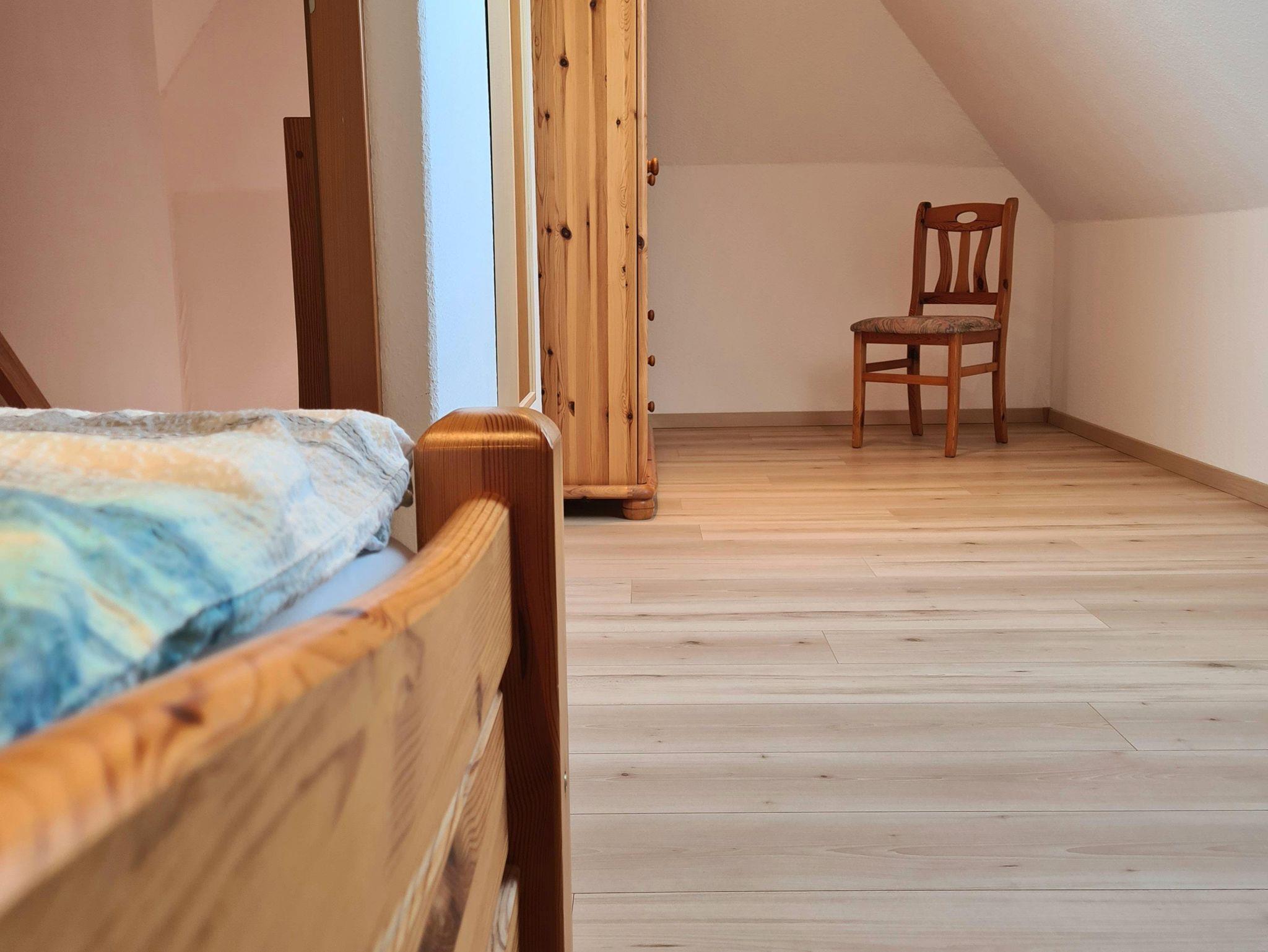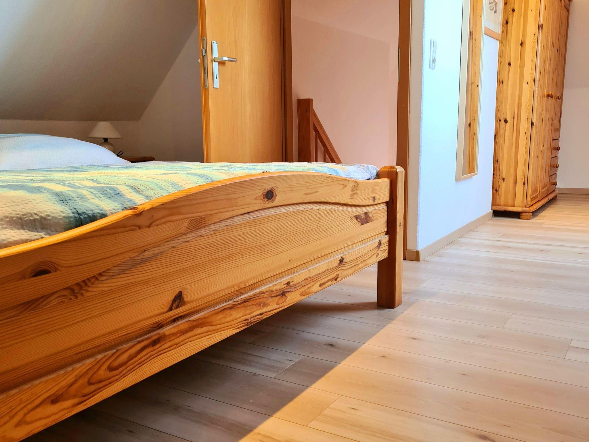 Unsere 70 qm große Ferienwohnung liegt im ersten Obergeschoss unseres Einfamilienhauses und bietet Ihnen einen nach Süden gelegenen möbilierten Balkon.