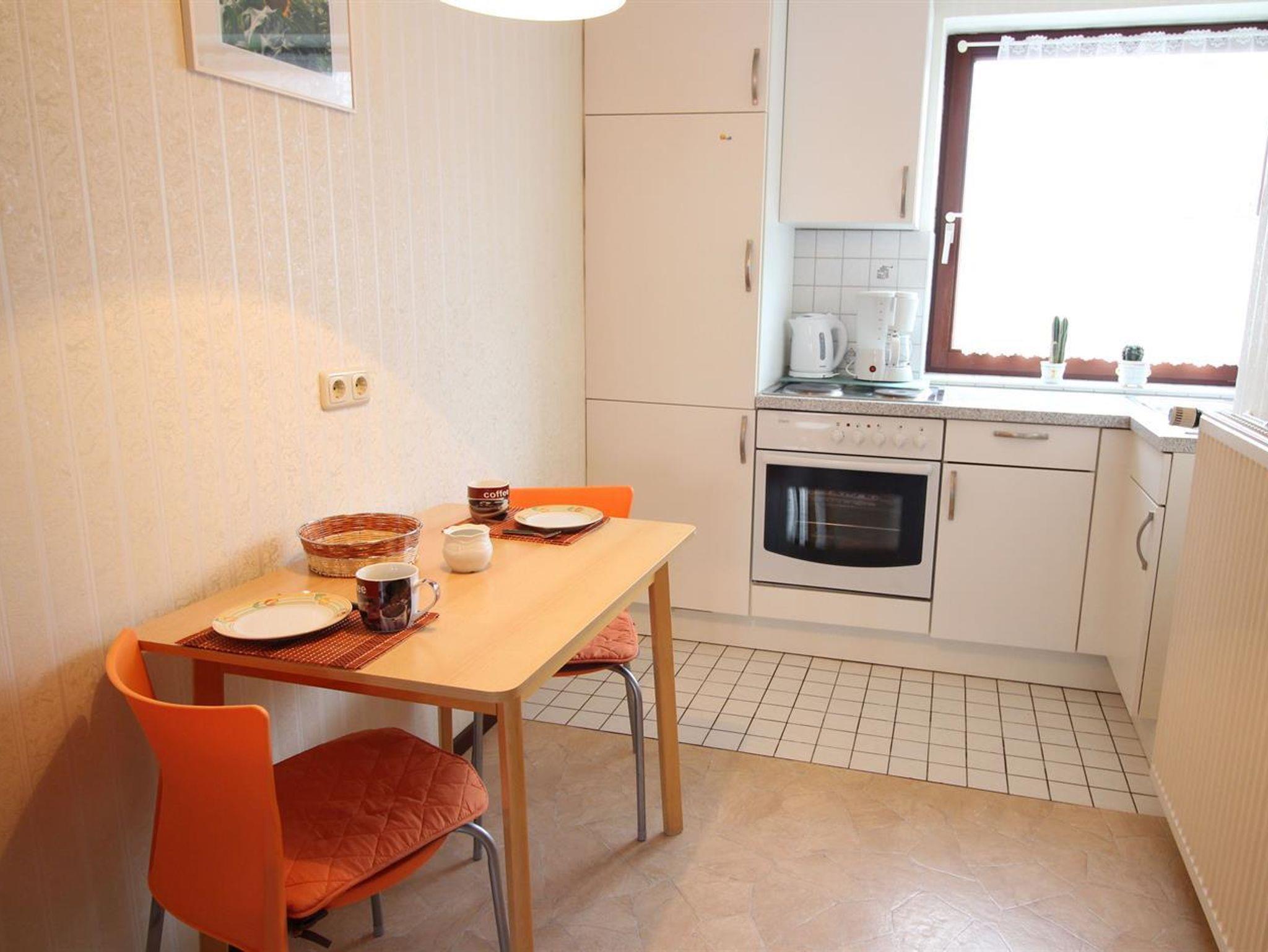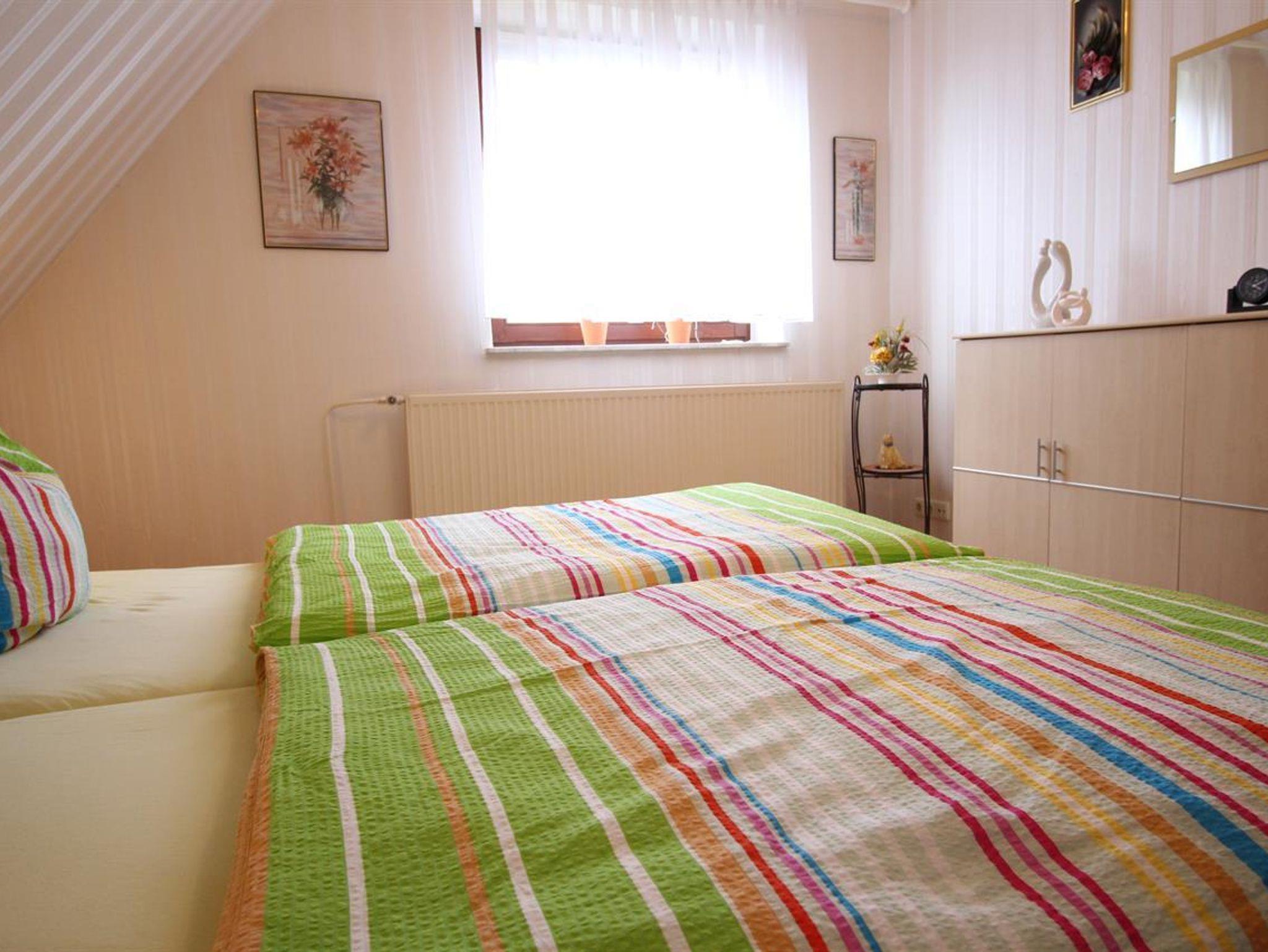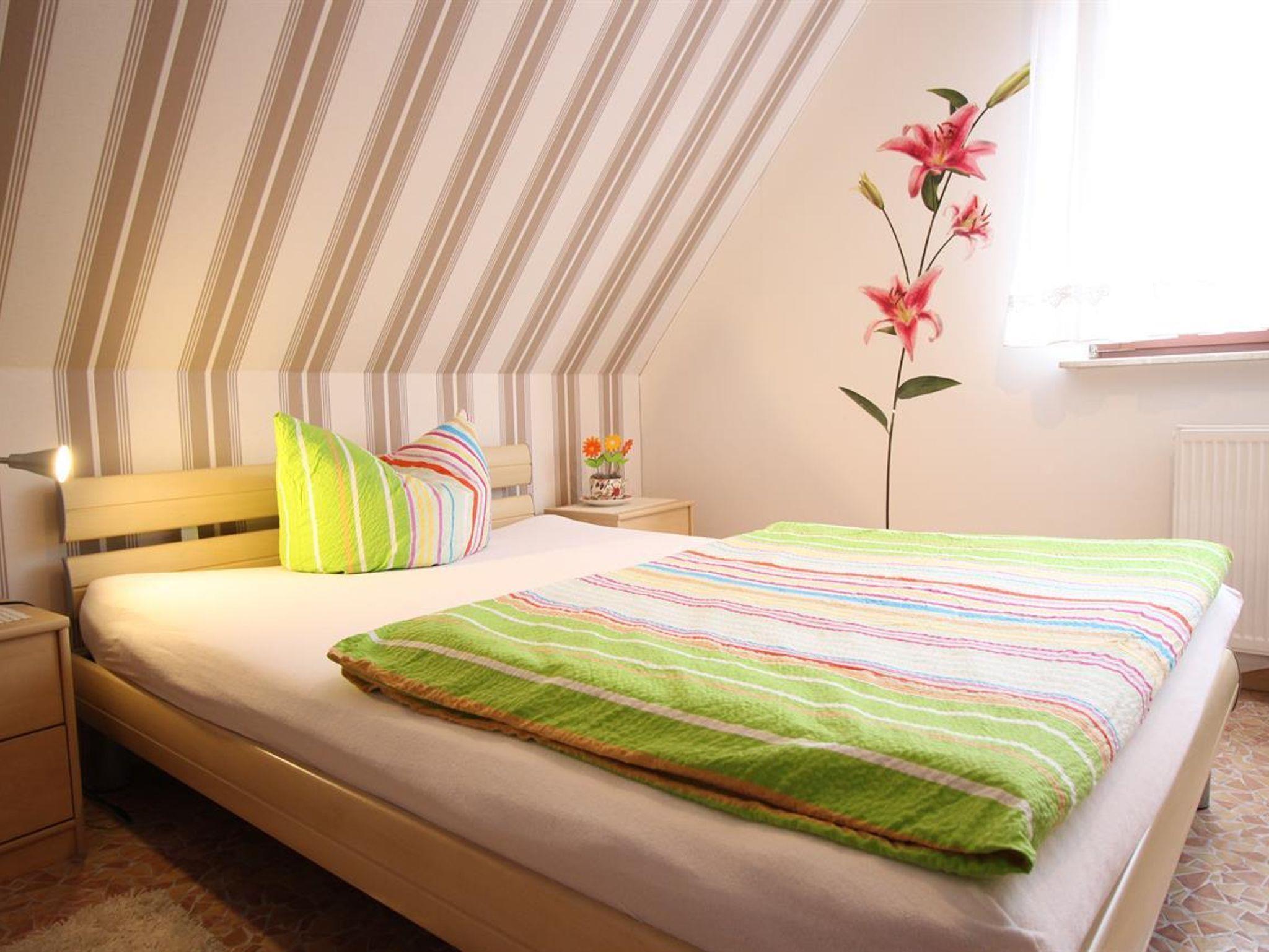 Ferienwohnung mit einer Größe von ca. 40 qm für bis zu 3 Personen, im Obergeschoss eines Familenhauses. Ausgestattet mit einem Wohnraum mit Sitzgruppe u. SAT-TV, Schlafzimmer mit Doppelbett, ein weiteres Schlafzimmer mit einen Einzelbett (Breite 1,40 m). Separate komplett ausgestattet Küche. Helles, freundliches Tageslichtbad mit Dusche und WC.