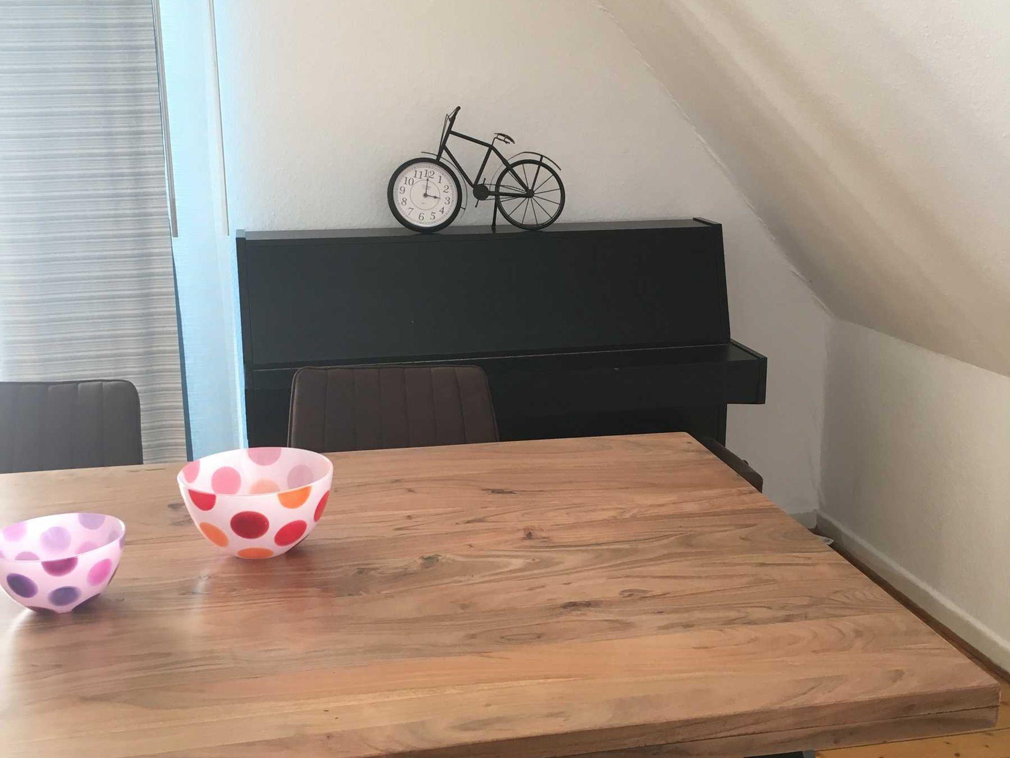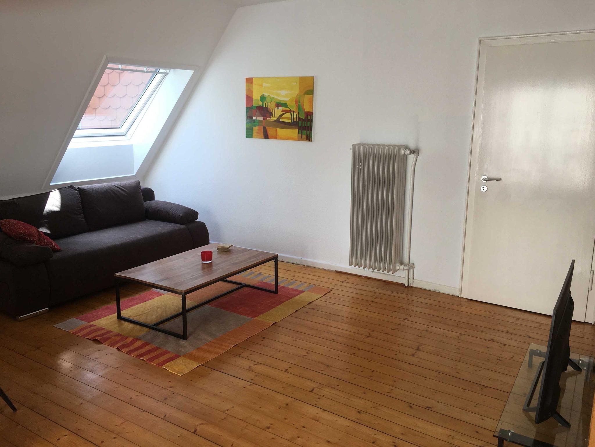 Die Ferienwohnung 2 ist etwa 70 qm groß, verfügt ebenfalls über einen Flur, ein neues Badezimmer mit Dusche, eine Küche sowie ein Schlaf- und ein Wohnzimmer. Im Wohnzimmer, das auf einer Seite eine Dachschräge hat, befinden sich ein Schlafsofa und ein Esstisch mit vier Stühlen. Der Zugang zur Wohnung erfolgt über die Küche. Die Wohnung verfügt einen Balkon, auf dem Sie die Abendsonne genießen können.