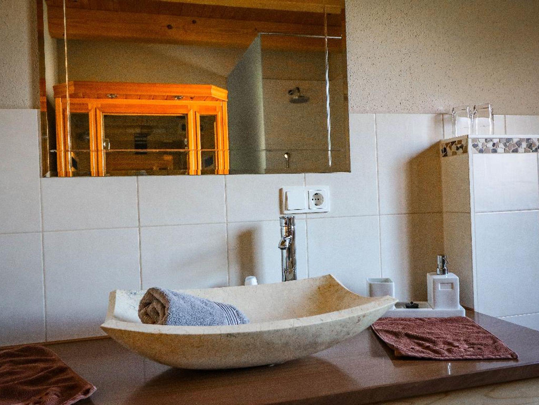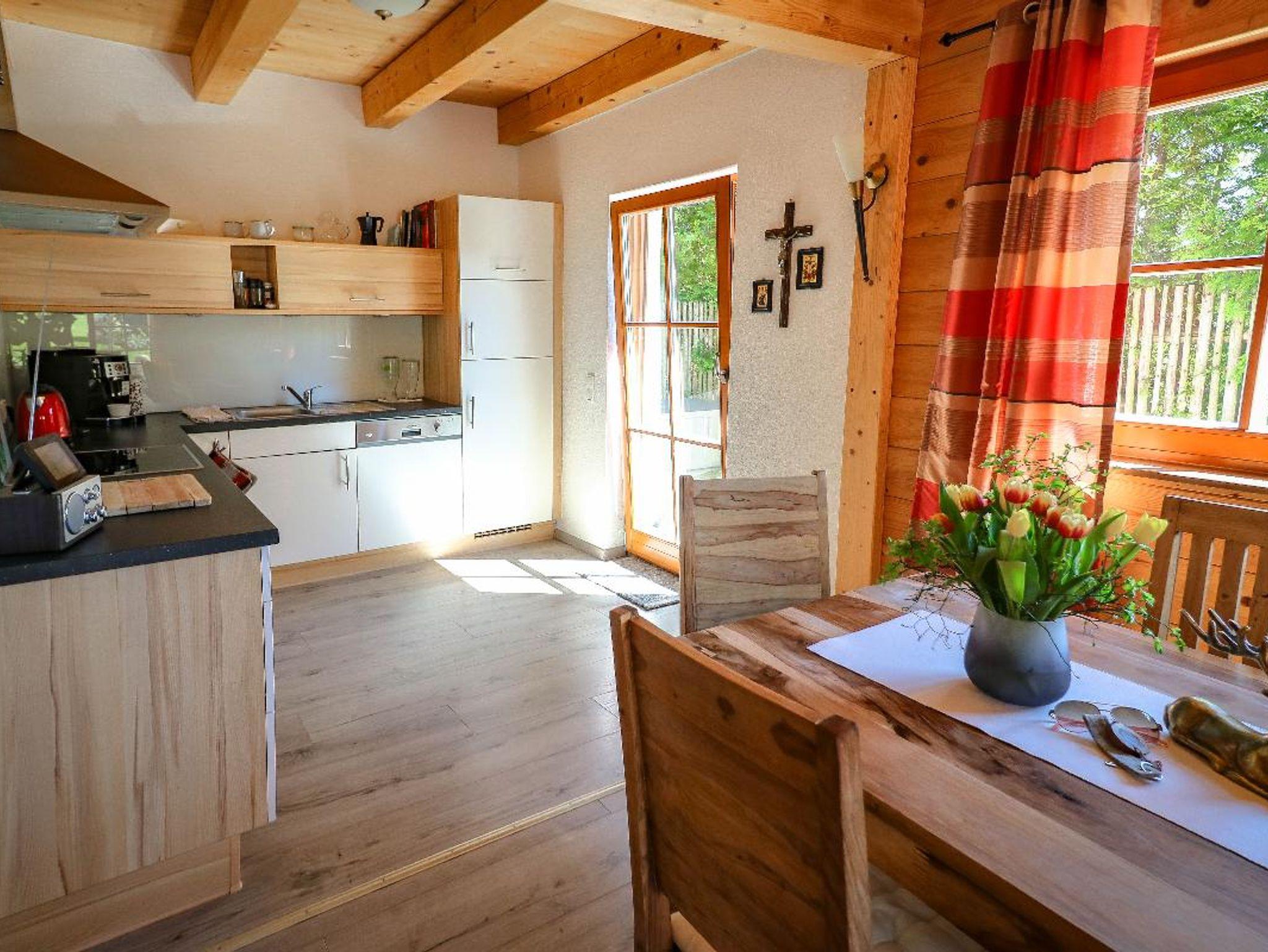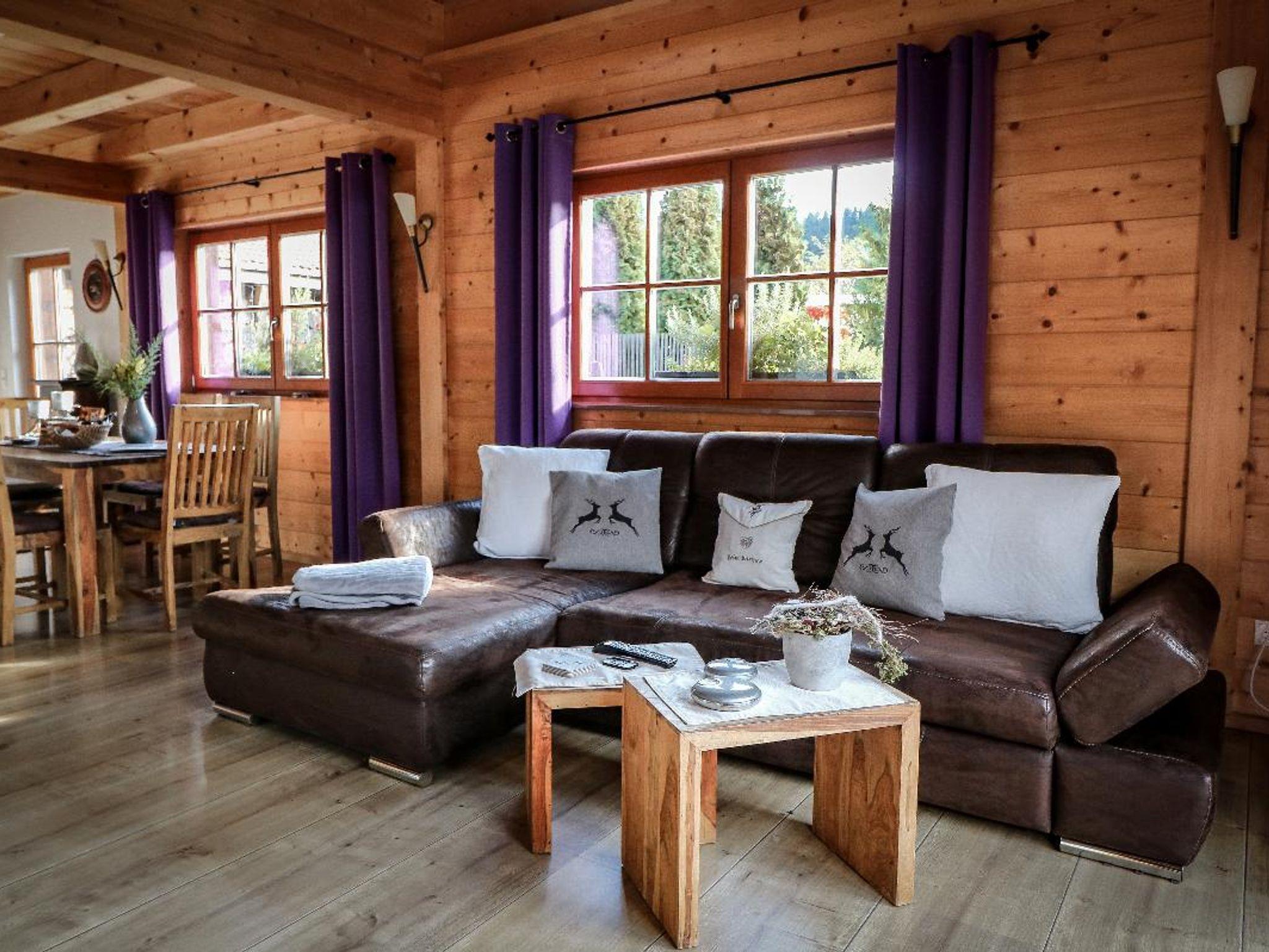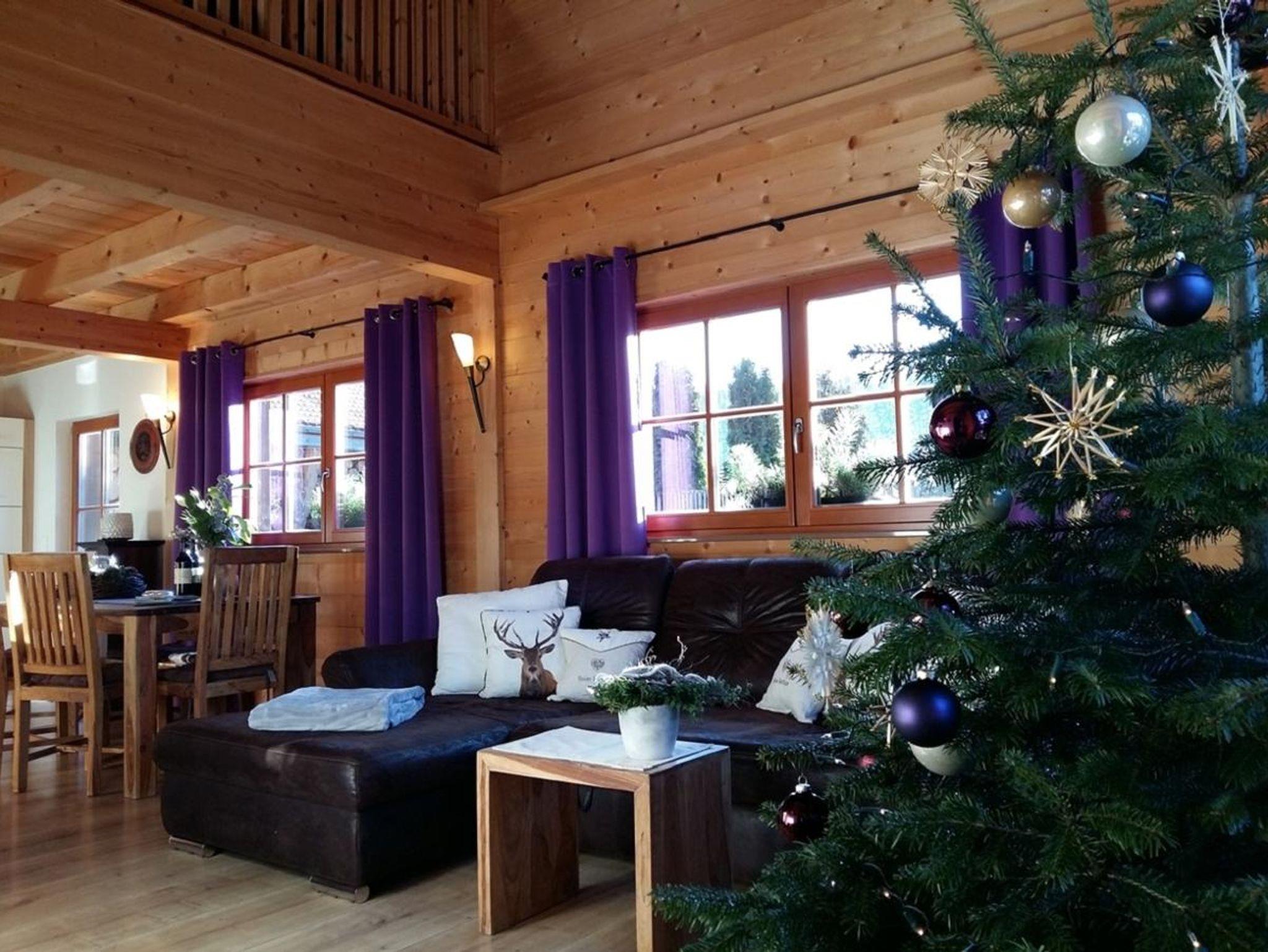 Chalet mit drei Schlafzimmer (, zwei Bäder, große Wohnstube mit Küche-Essen-Wohnen und Kaminofen. EG barrierefrei gestaltet mit Schlafzimmer, Bad mit begehbarer Dusche, Infrarot-Kabine im Bad.