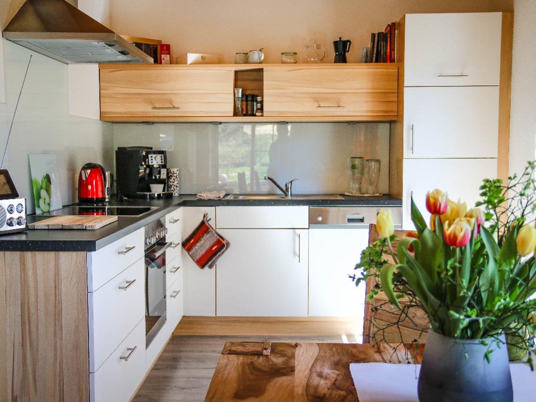 Küche voll ausgestattet: Kaffee Vollautomat, Bio Tee, Weinkühlschrank
