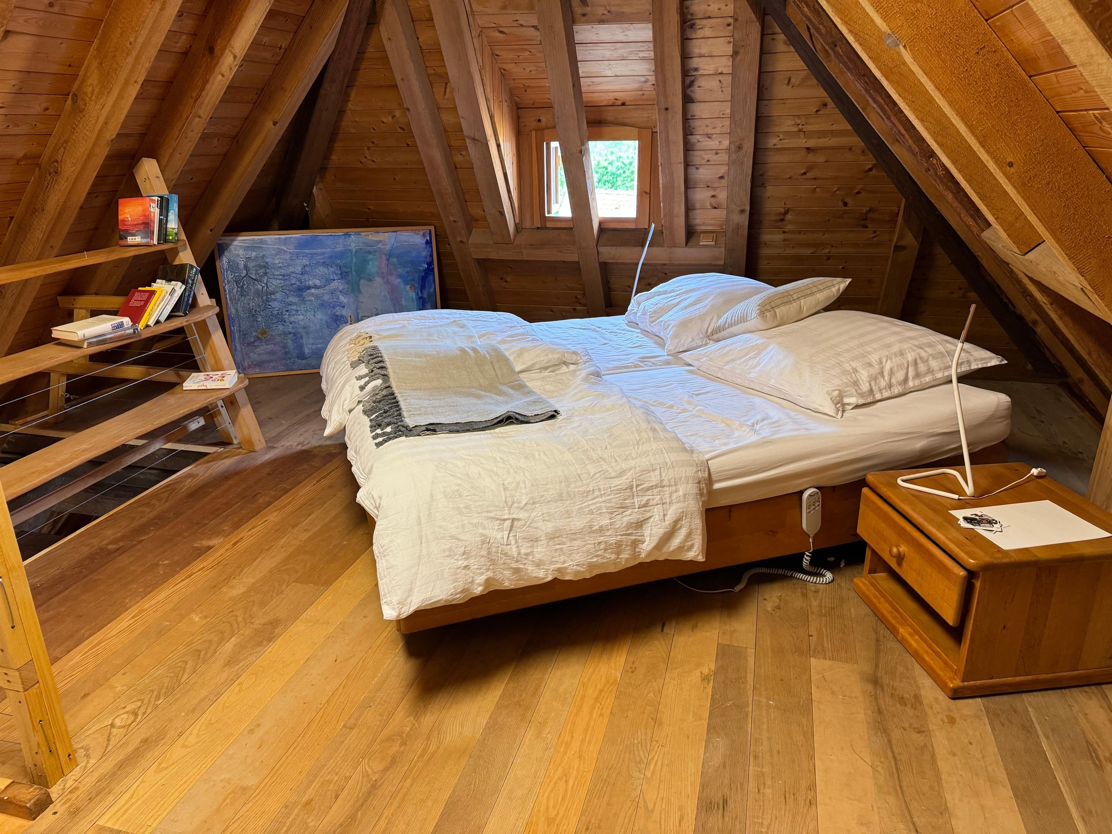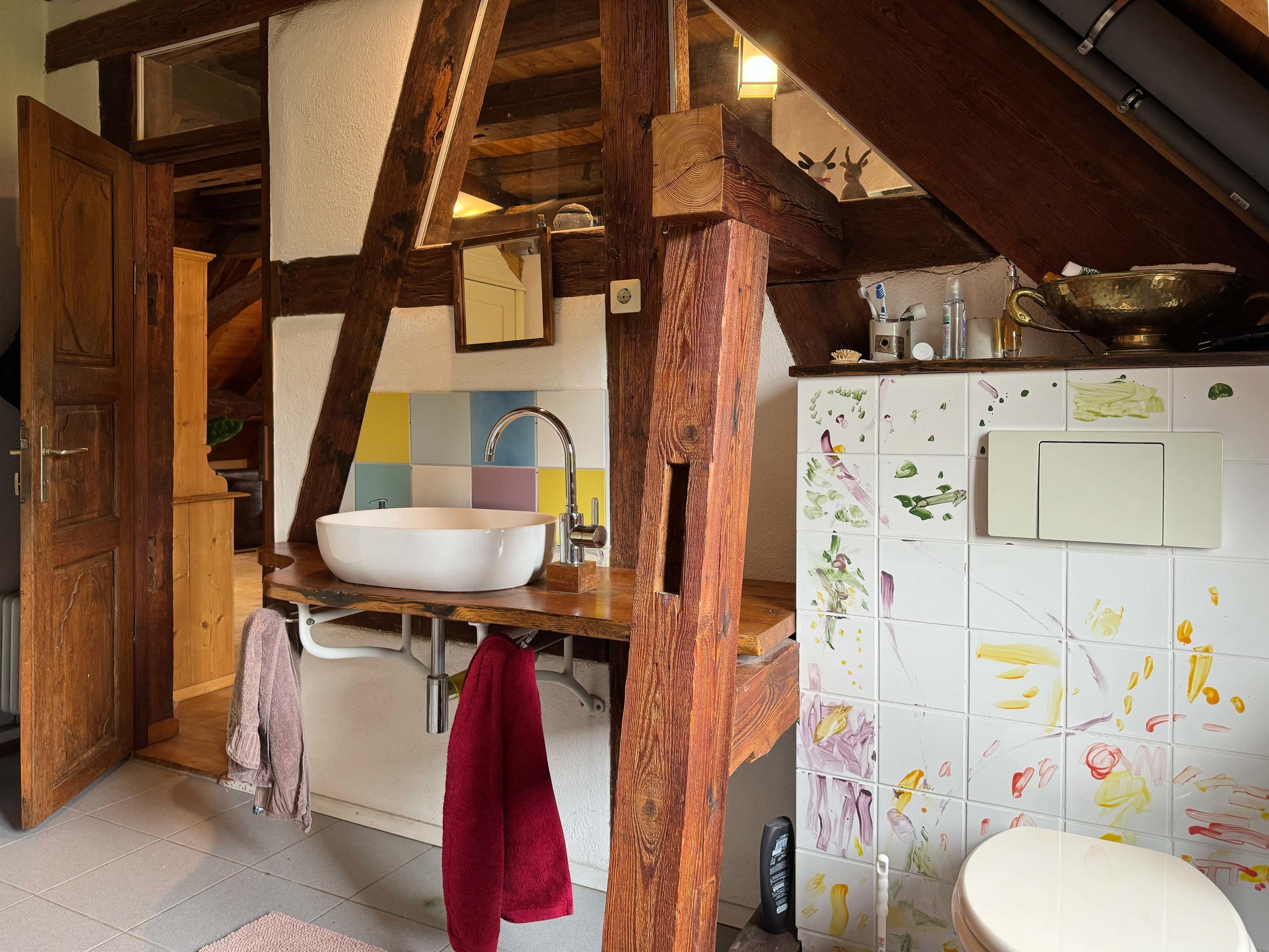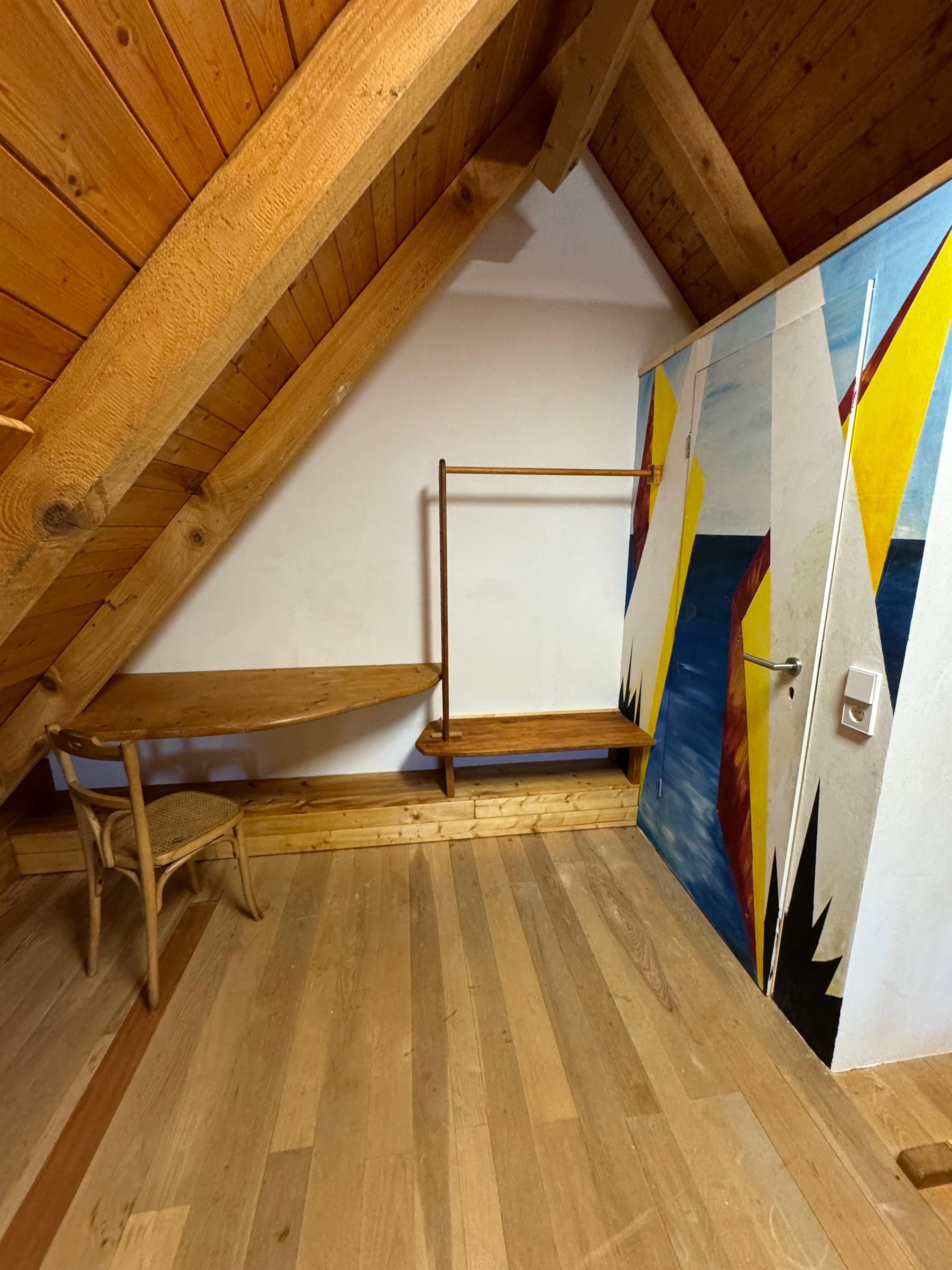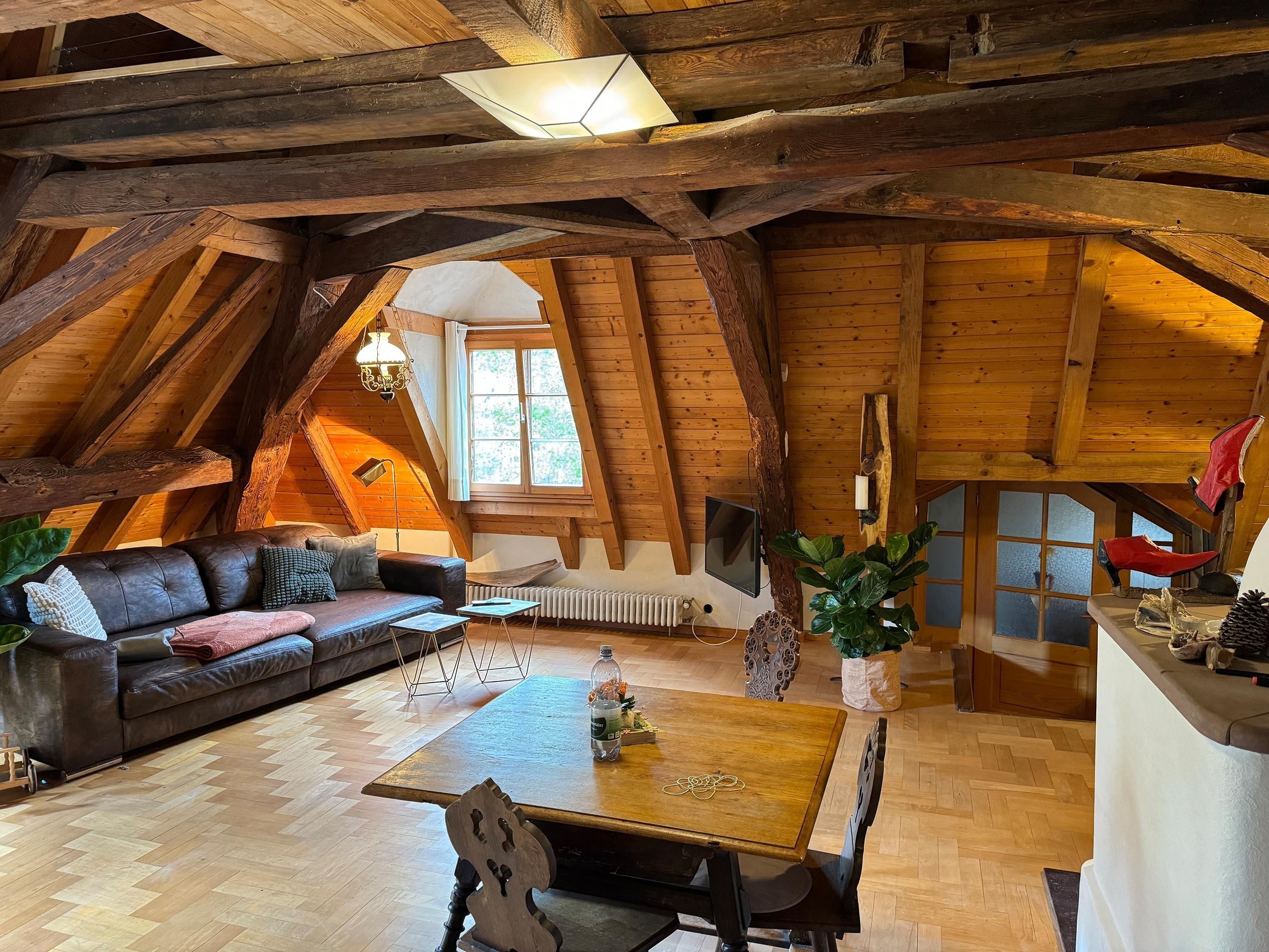 0815 ist unsere Ferienwohnung sicher nicht. Sie befindet sich im 2. Stock des ehemaligen Gasthofes Löwen. Es wurde 1805 erbaut und ist ein denkmalgeschütztes Gebäude. Im gut erhaltenen und neu gestalteten, alten Dachstuhl ist unsere Wohnung auf 2 Ebenen untergebracht. Liebevoll renoviert zeigt sie sich sehr großzügig und etwas eigenwillig. Durch die offene Bauweise, ist es auch im Sommer angenehm kühl. Im Winter steht für Feuerliebhaber unser Grundofen bereit.