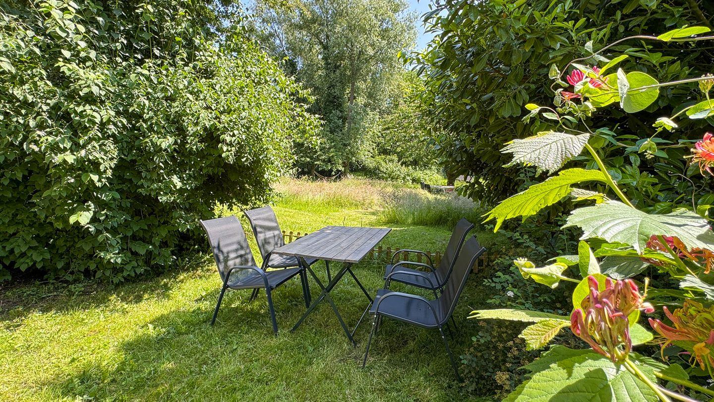 Gartenstühle und ein Gartentisch stehen bereit um flexibel versetzt zu werden.