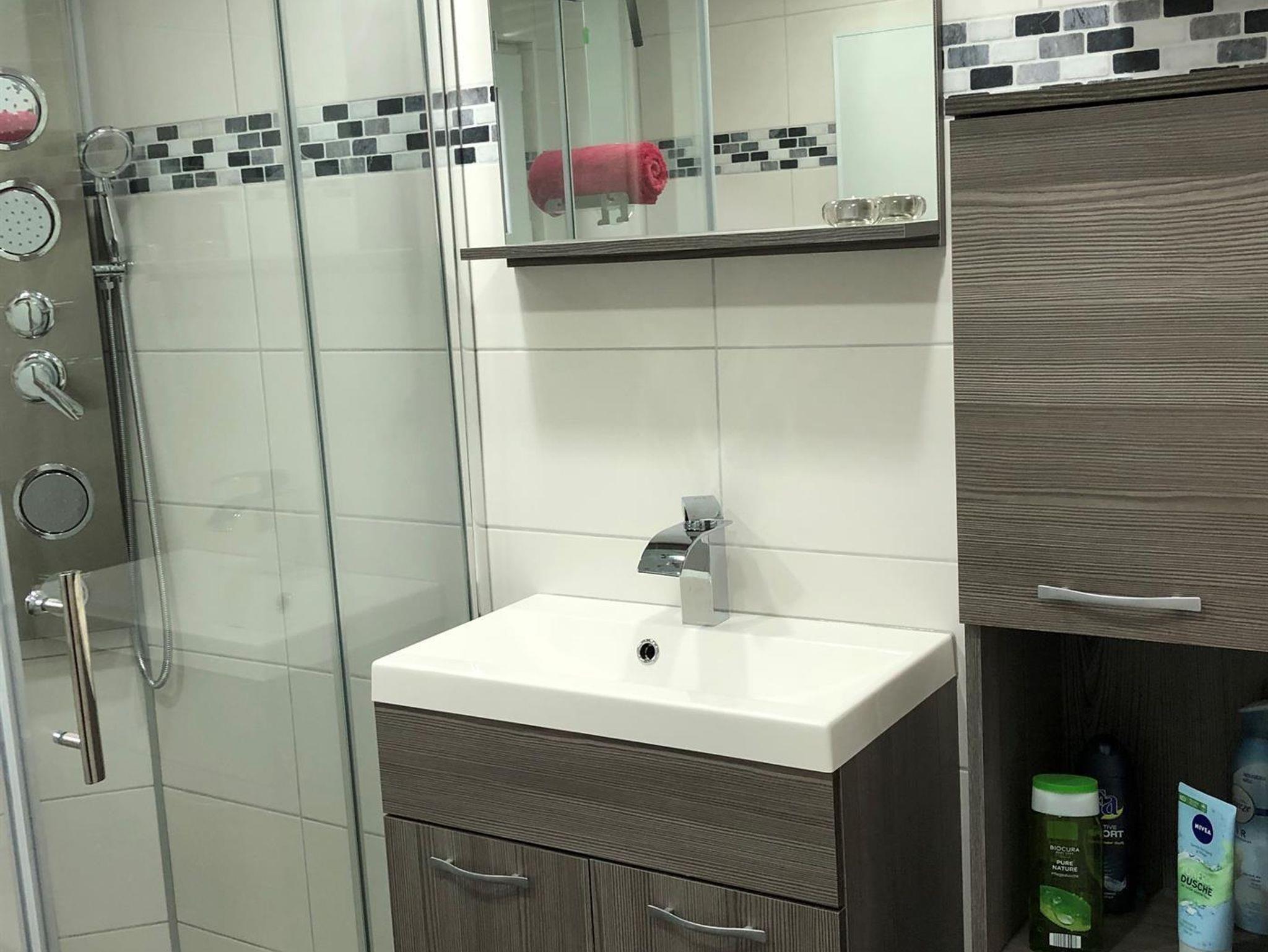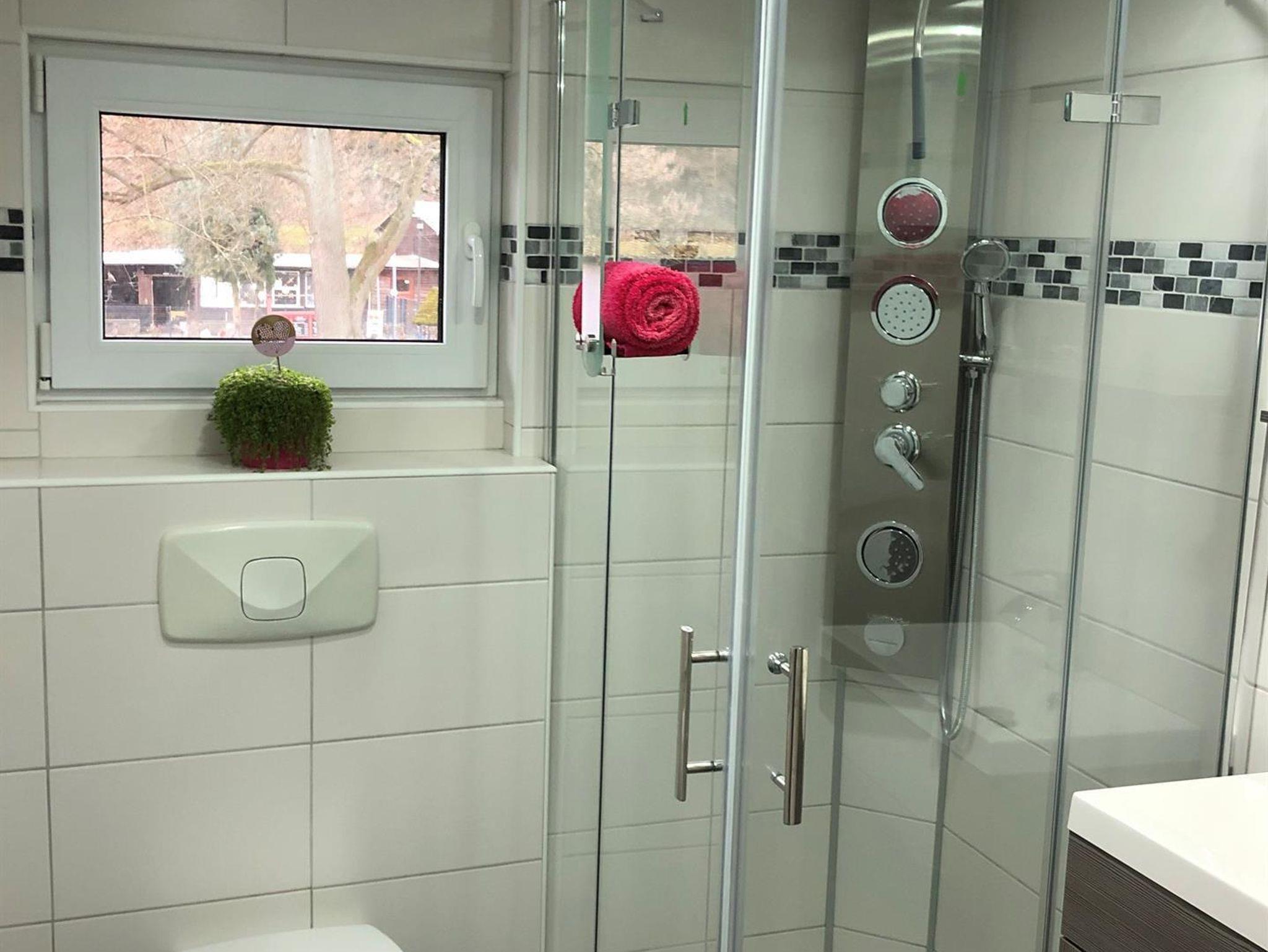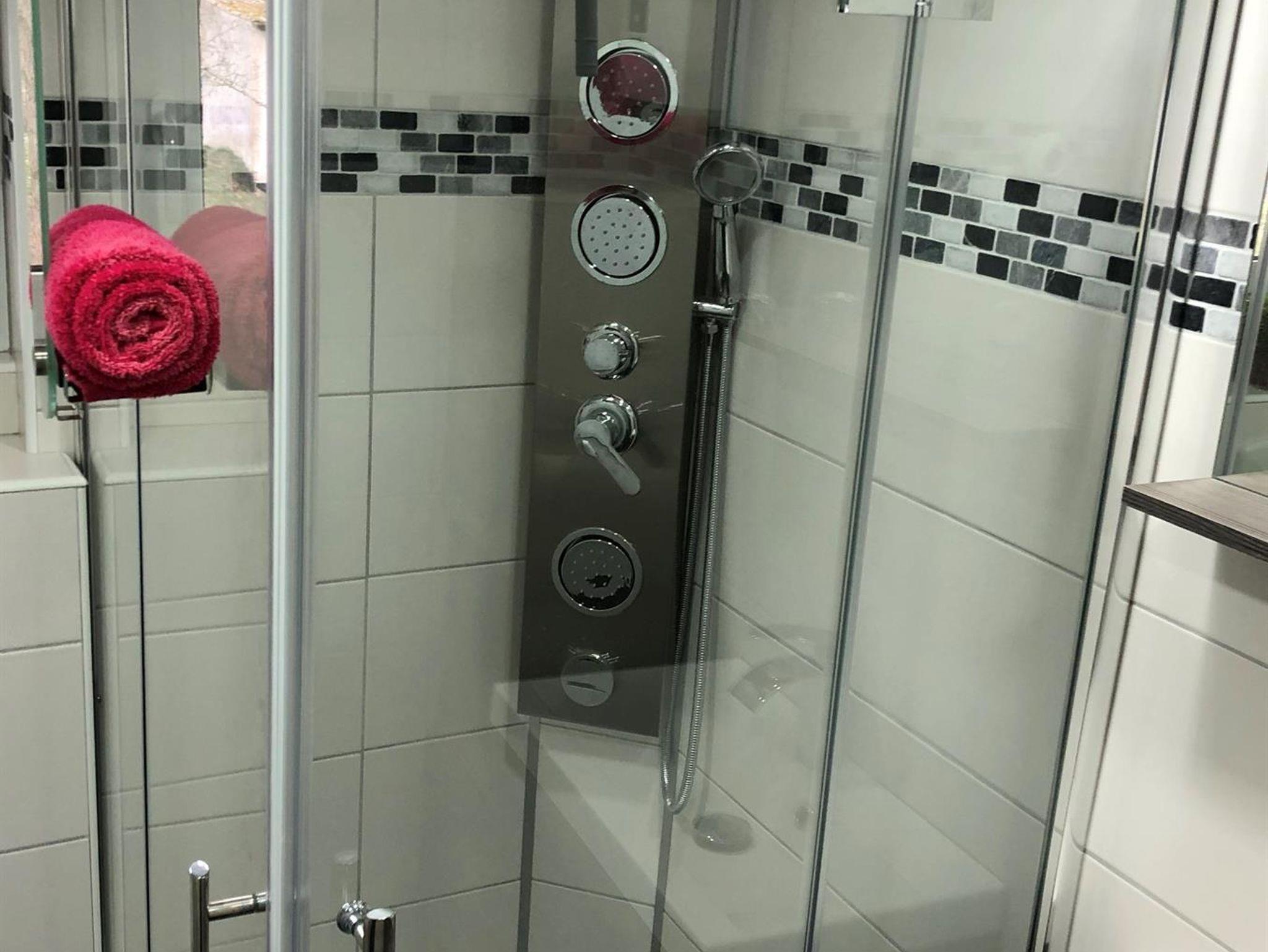 Unser Bad ist klein aber fein. Es wurde mit einer Dusche inkl. Wellnesspaneel sowie einem Infrarotheizkörper ausgestattet. Hierzu haben wir uns entschieden, da der Betrieb einer Infrarotheizung sich durch seine mit einem Sonnenbad vergleichbare Wirkung positiv auf den Menschen auswirkt. Die Wärmestrahlung dringt tief in den menschlichen Körper ein und wärmt von Innen heraus. Diese Tiefenwärme wirkt entspannend und erhöht den Wohlfühlfaktor.