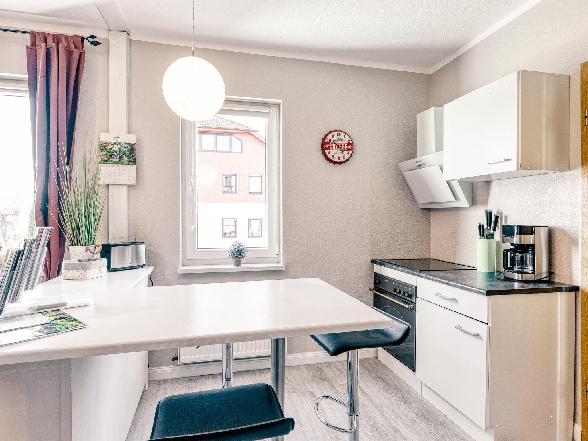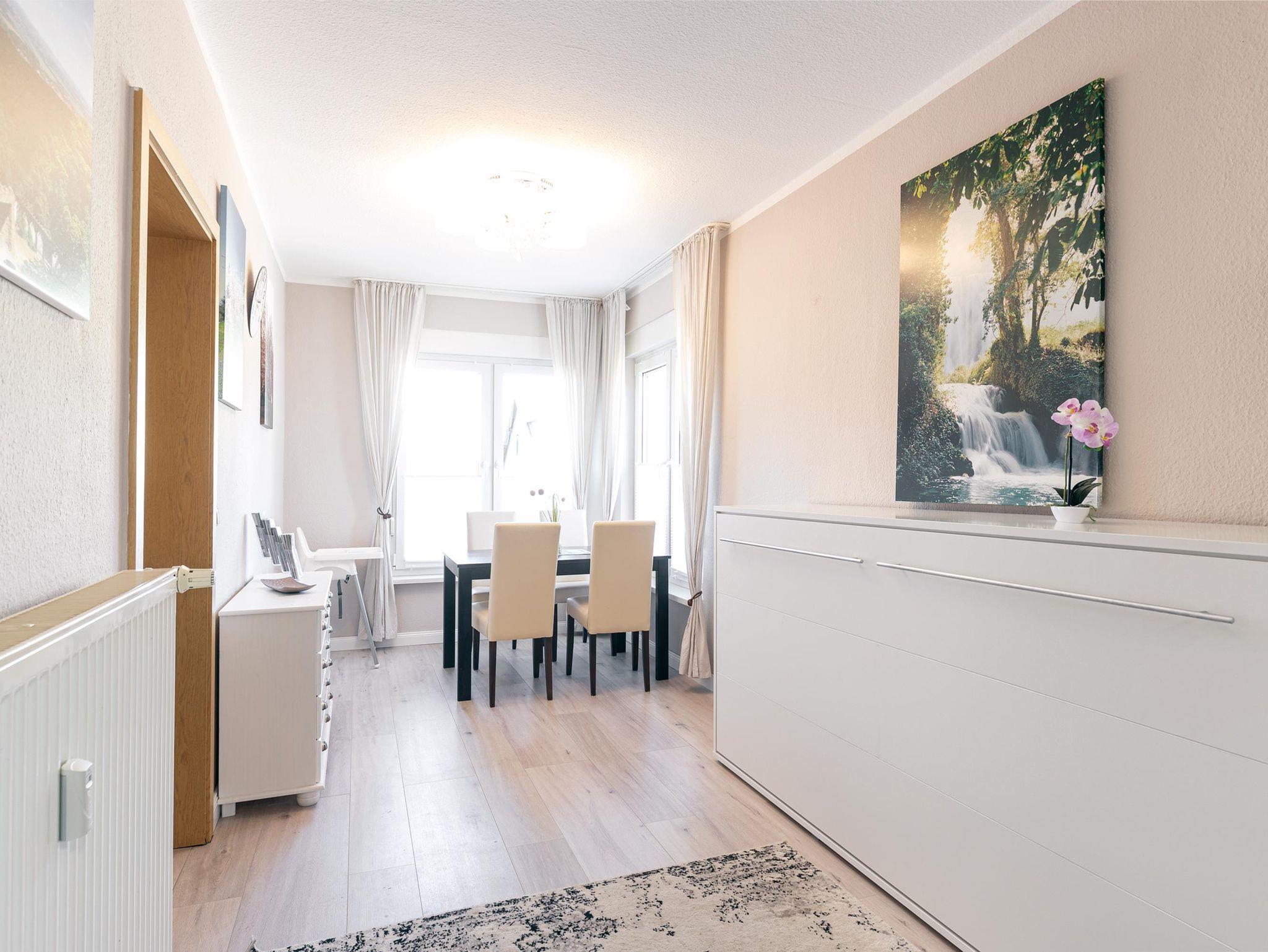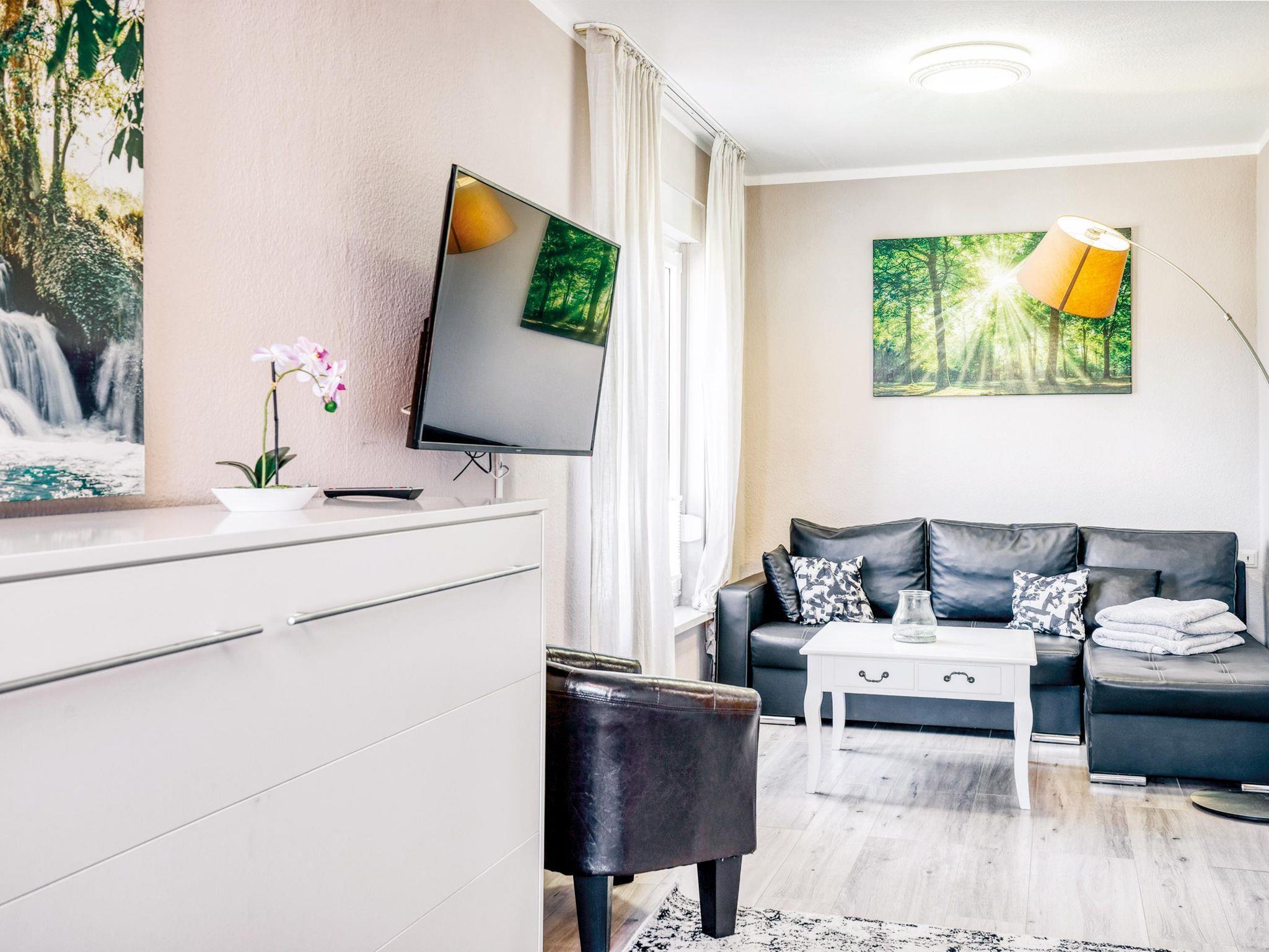 Neu und anspruchsvoll eingerichtete Ferienwohnung im Erdgeschoss. Mobiliar zum Wohlfühlen! Wohn-/Esszimmer mit gemütlicher Sitzecke, SAT-TV und separater Essbereich. Einbauküche mit Geschirrspüler, Backofen, Mikrowelle, E-Herd, Dunstabzugshaube, Kühlgefrierkombination. Küchengeräte: Kaffeemaschine, Wasserkocher, Toaster, Eierkocher. Anspruchsvolles Bad mit Dusche, ebenerdiger Einstieg. Haartrockner vorhanden. Waschmaschine und Trockner auf Anfrage im Keller nutzbar. Ansprechende Flurgestaltung. Außensitzbereich. Parkmöglichkeiten auf der Straße. Bettwäsche/Handtücher in der Erstausstattung vorhanden. Endreinigung, Wasser- und Energiekosten inklusive.