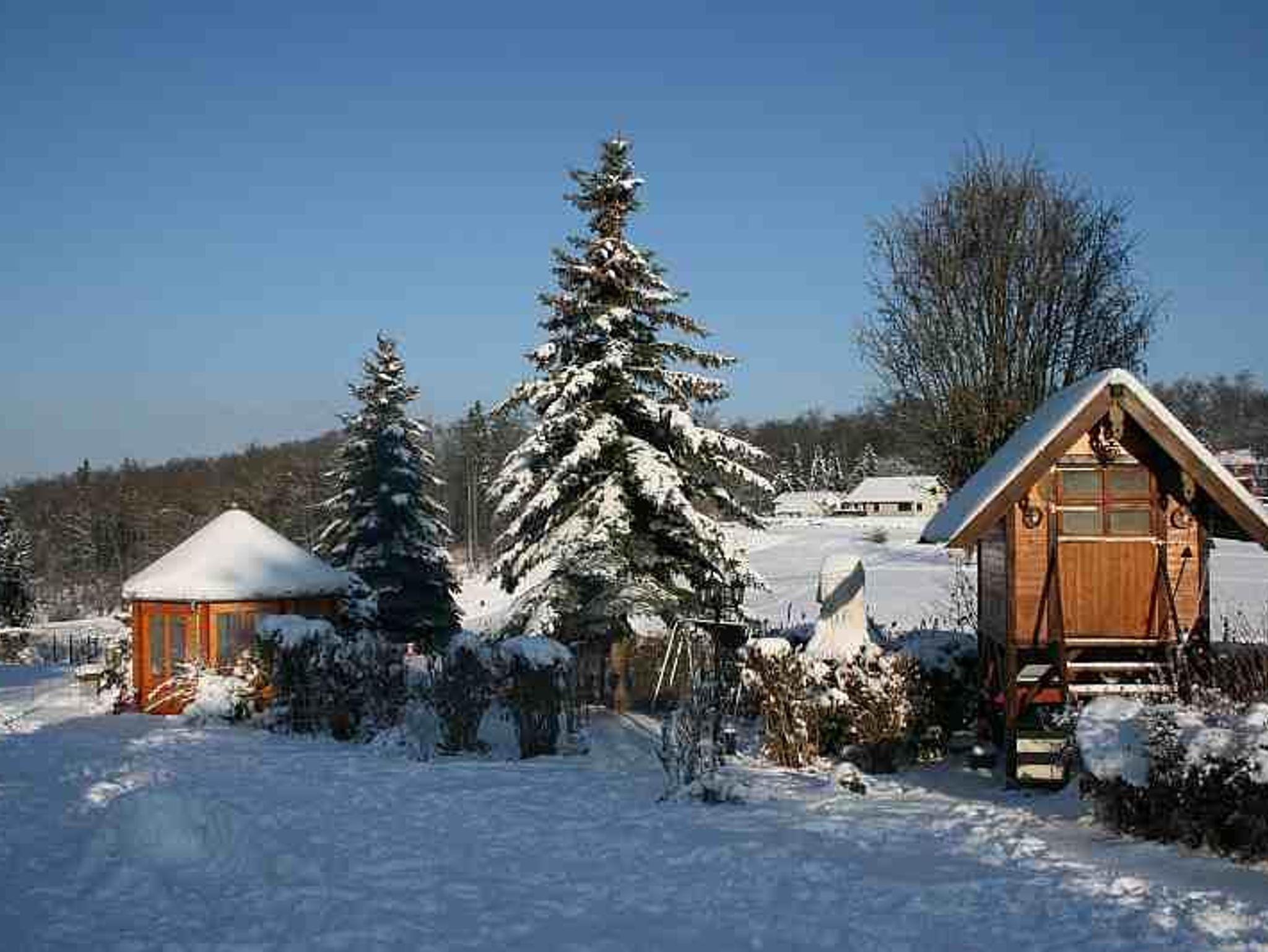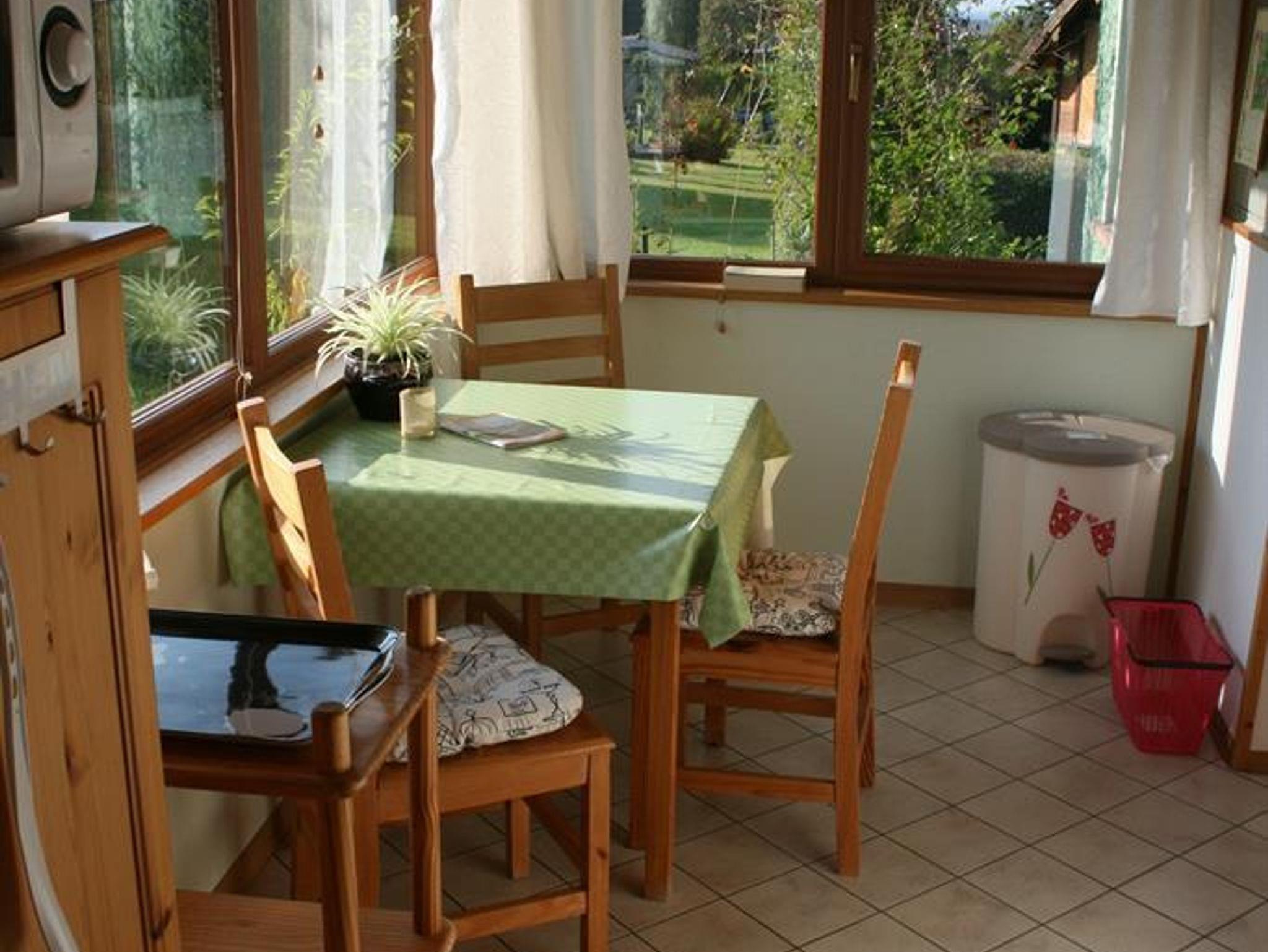 Unser seperates Ferienhaus bietet einen herrlichen Ausblick in unseren Garten. Die ca. 33 m² Wohnfläche ist in ein Wohn- und Schlafzimmer mit Ehebett, Sitzmöglichkeit; Radio- sowie TV- Gerät und dem sich anschließenden wintergartenähnlichen Küchen- und Essbereich (Singleküche mit Kühlschrank und Microwelle) aufgeteilt. Außerdem verfügt das Ferienhaus über ein Bad mit Dusche, Waschbecken und WC. Die gemütliche und komfortable Einrichtung lädt zum Verweilen ein. Wir freuen uns auf Ihren Besuch.