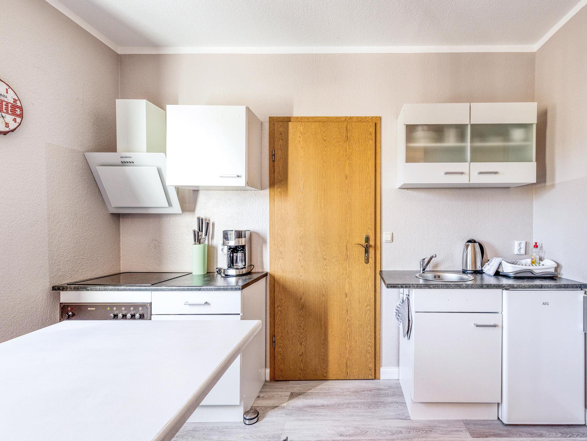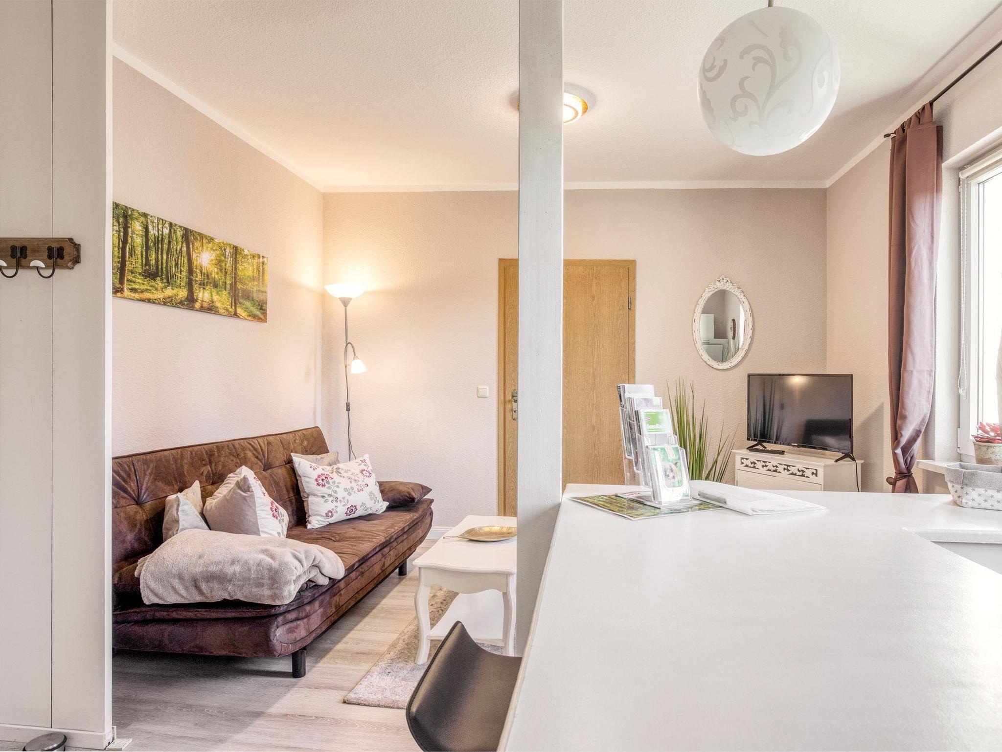 Sie werden eine 35 qm² helle modern eingerichtete Wohnung vorfinden. Das kleine Schlafzimmer mit großen Schrank läßt Sie neue Kräfte für den neuen Tag sammeln. Beachten Sie bitte unsere Bilder, dass das Bett nur einen Eingang hat. Das Wohnzimmer mit Schlafcouch für eine Person lädt zur Planung von Ausflügen aber auch zum Kuscheln oder geselligem Beisammensein ein. Der im Wohnzimmer befindliche Essbereich mit Blick auf die Hauptstraße, läßt Sie den Tag gemütlich beginnen oder ausklingen. Die Küche bietet Ihnen alle Möglichkeiten für die Essenzubereitung. Das Bad mit Fenster und Dusche läßt keine Fragen offen.
