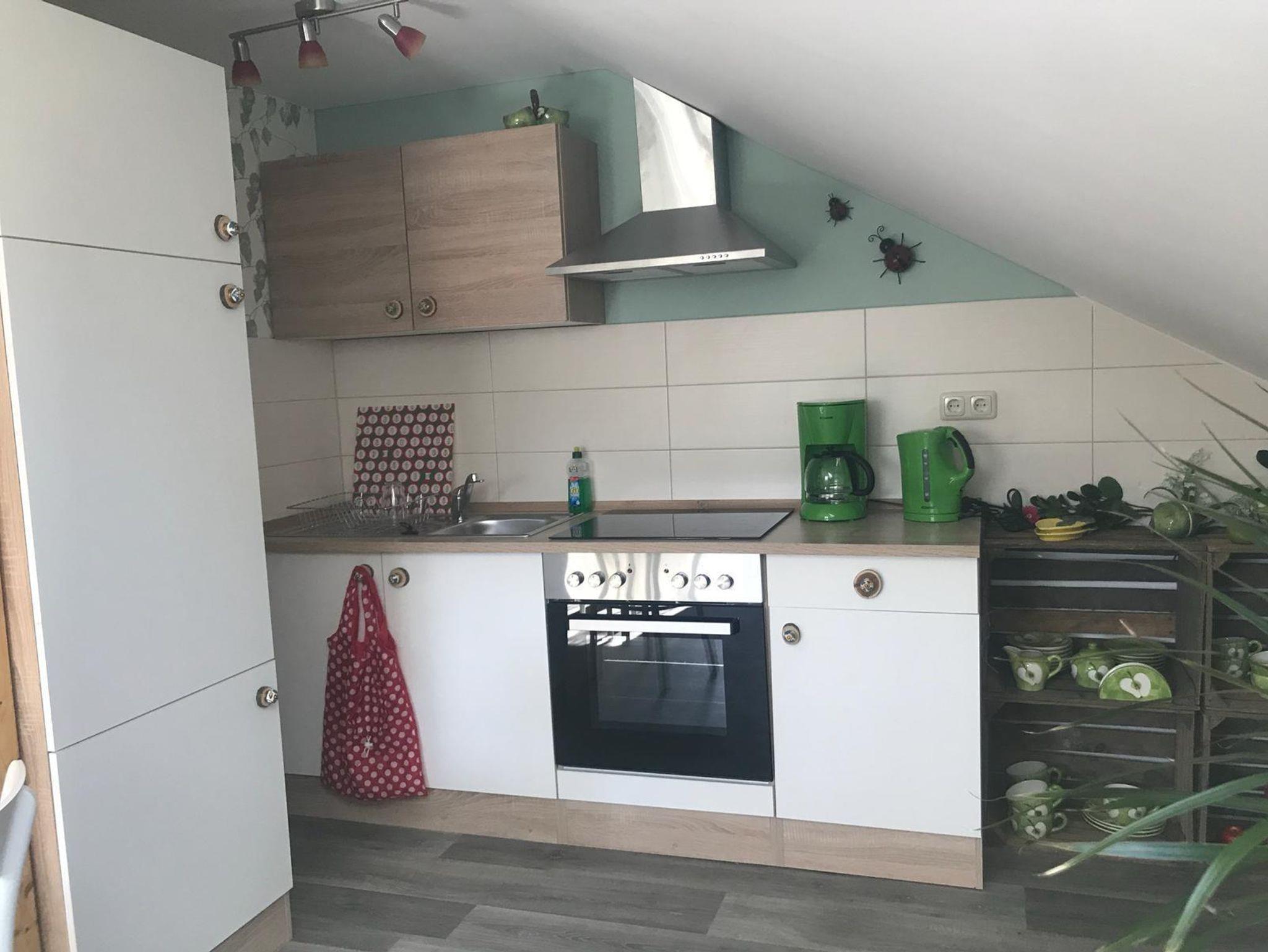 Die Küche besitzt einen Herd mit Backofen und Ceranfeld, , einen Kühlschrankmit Gefrierfach und eine Spüle.
