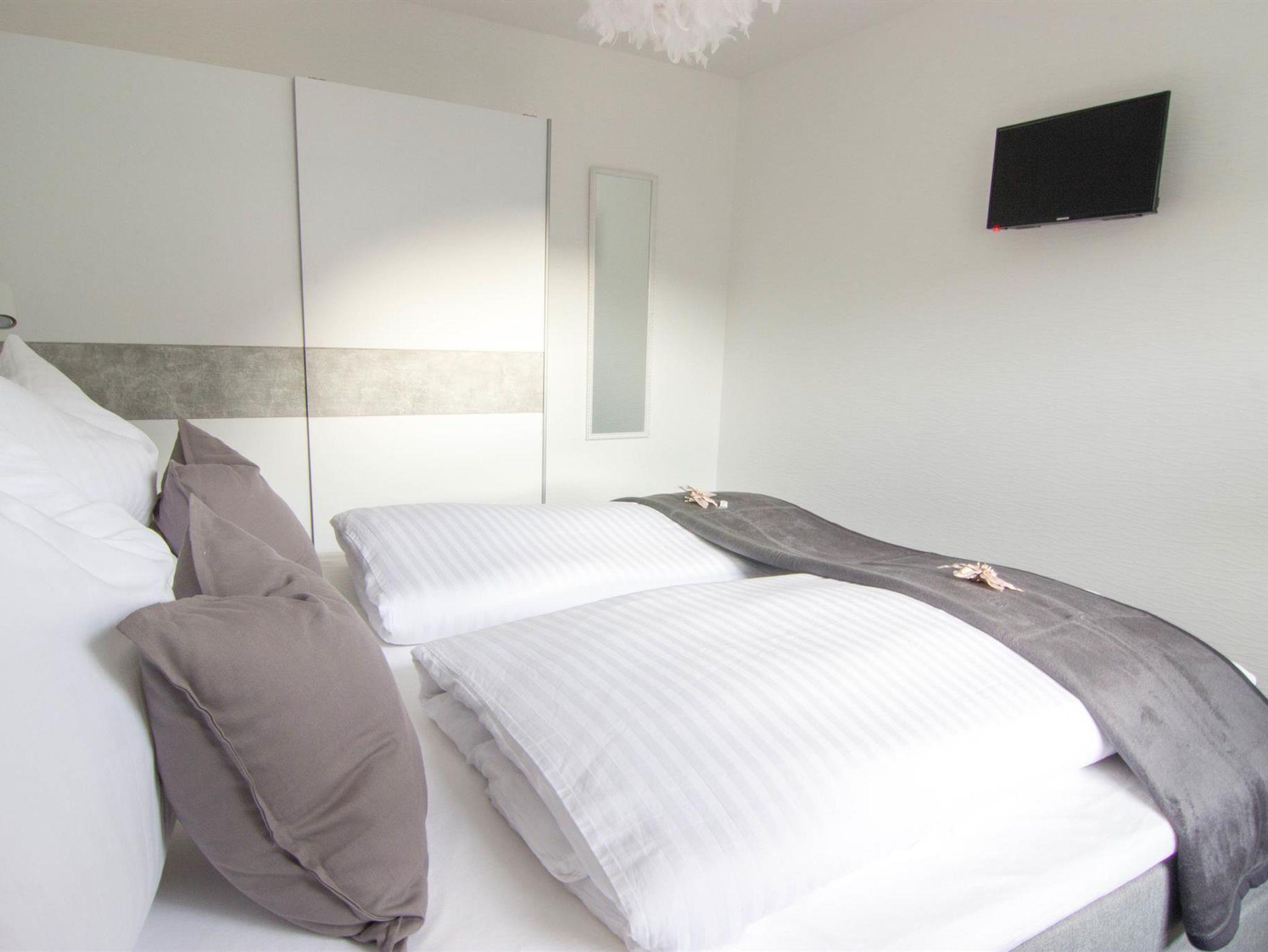 2 separate Schlafzimmer mit TV u Boxspringbetten. Badezimmer mit ebenerdiger Dusche,WC,Fußbodenheizung,Doppelwaschbecken,Fön u integriertem Radio.