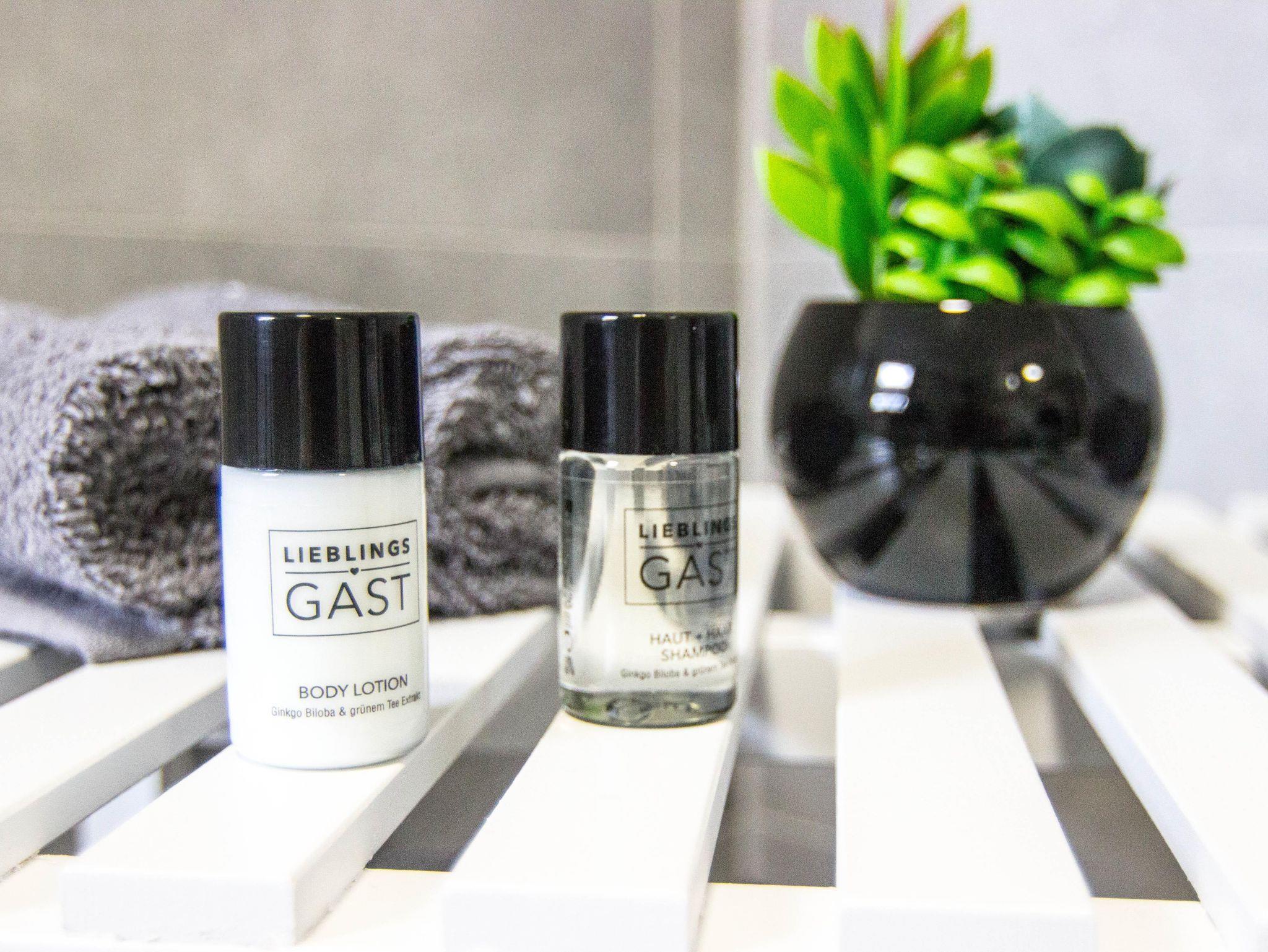 • Badezimmer mit ebenerdiger Dusche, Doppelwaschbecken, Fön, Handtuchheizung und erste Pflegeprodukte