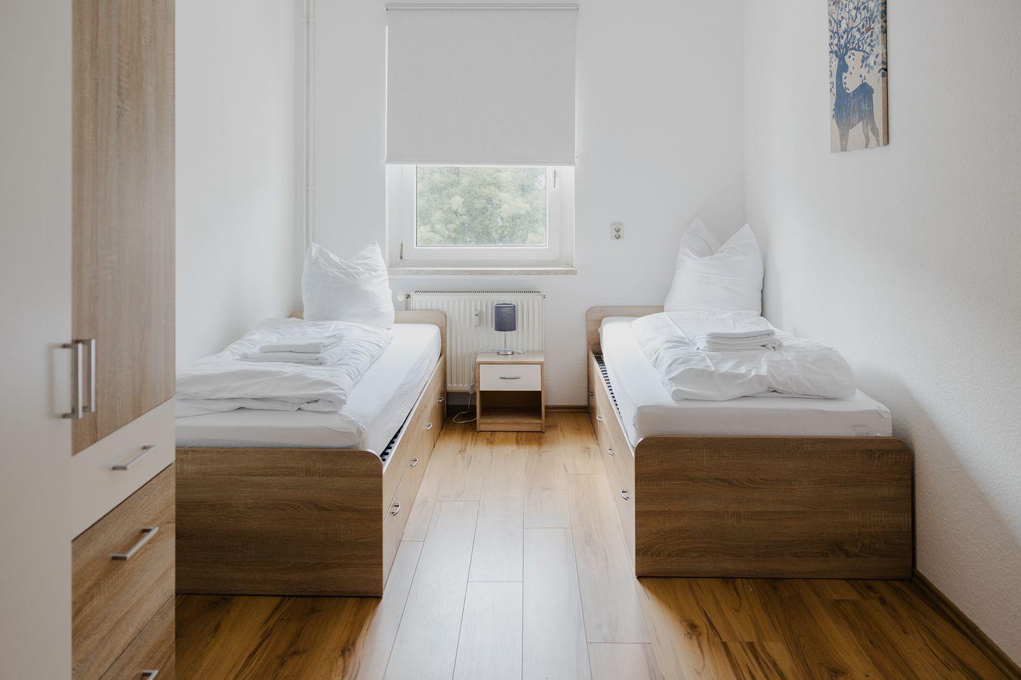 In den Schlafzimmern stehen gemütliche Betten. Ihre Kleidung können sie in die großen Schränke legen.