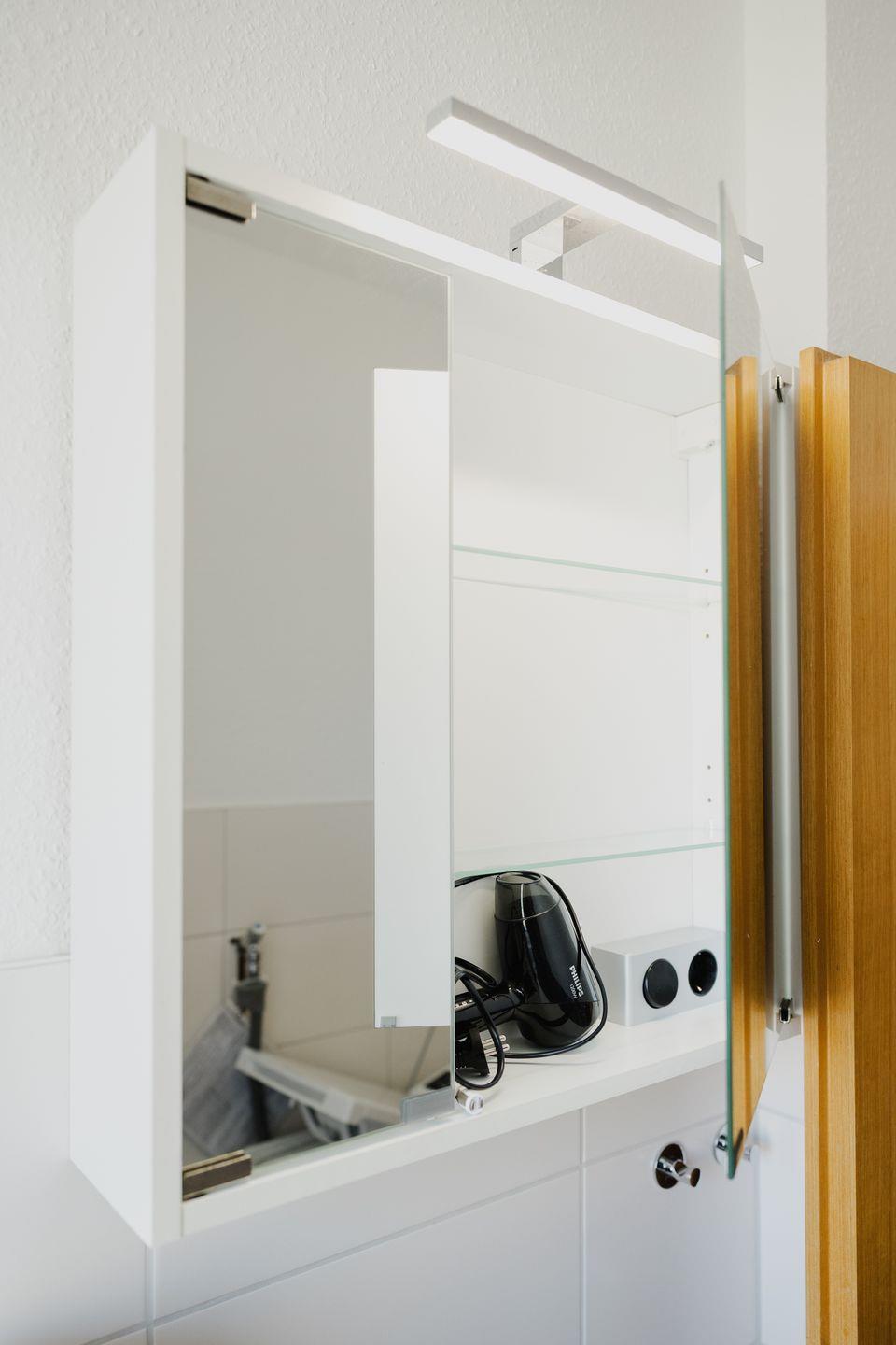 Das Badezimmer ist mit einer Dusche ausgestattet. Eine Waschmaschine, Spiegel und Haartrockner stehen ebenfalls zur Verfügung.