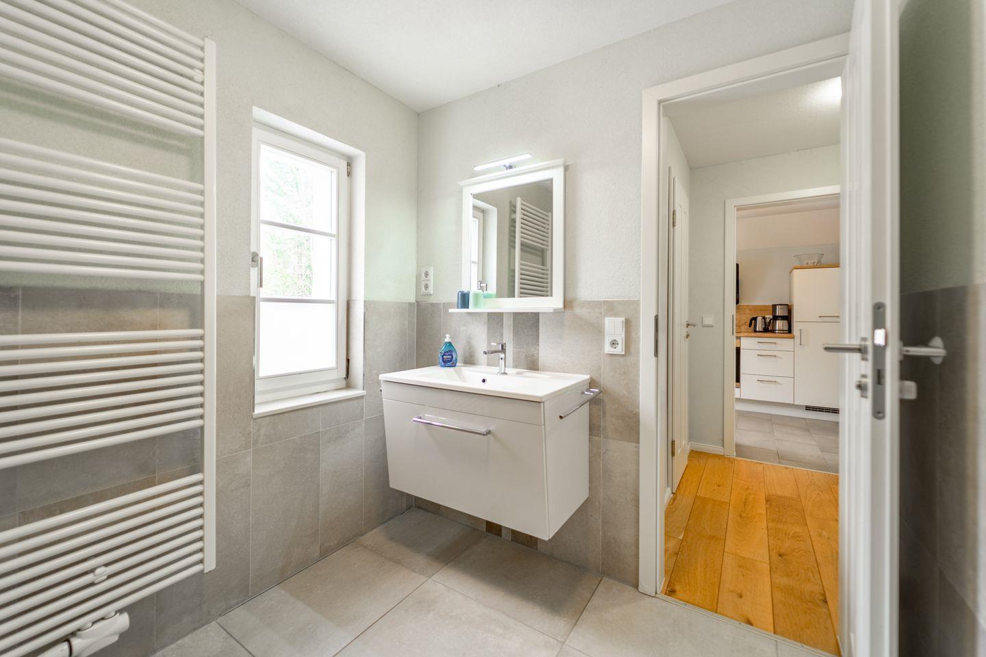 Vom Balkon blickst du direkt ins Grüne – ideal für einen Kaffee am Morgen oder einen Wein am Abend. Das Badezimmer ist hell und funktional mit Dusche und Haartrockner, zusätzlich gibt es ein separates Gäste-WC.
