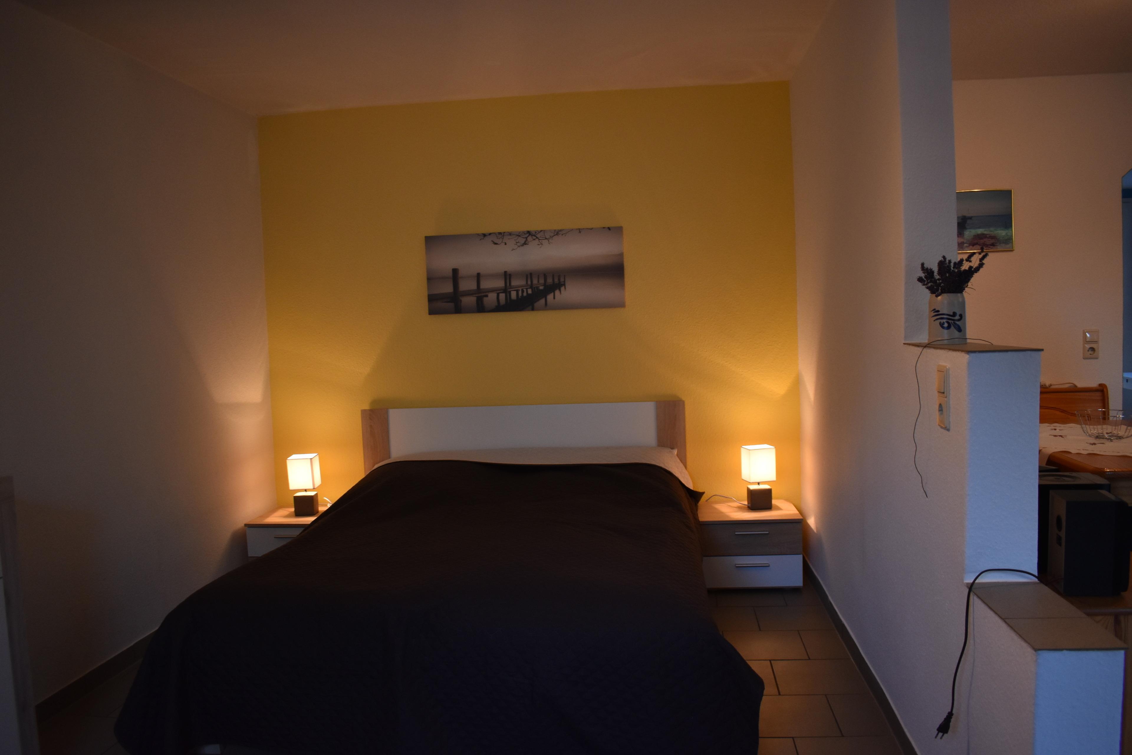 Eine weitere Schlafgelegenheit 160cmx200cm Doppelbett abgetrennt durch einen gemauerten Raumteiler ist im Wohnbereich integriert.