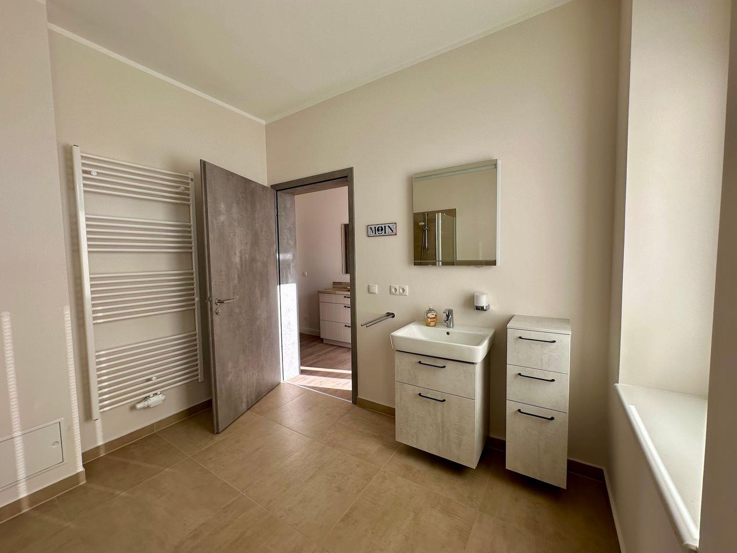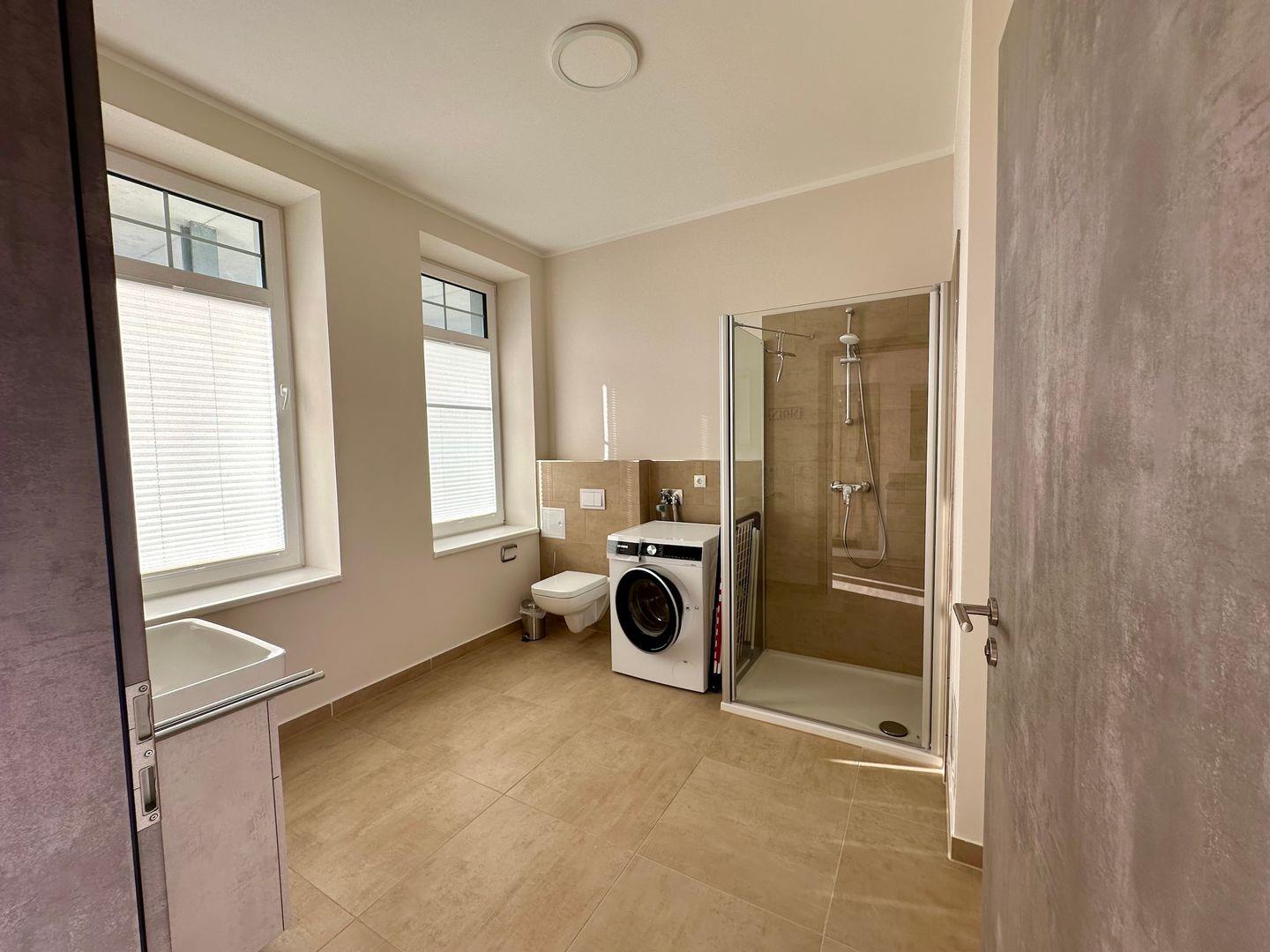 Die ebenerdige Dusche im Bad sorgt für viel Bequemlichkeit . WC, Waschtisch, Fön und eine Waschmaschine ergänzen die Ausstattung. Das Bad verfügt über zwei große Fenster.