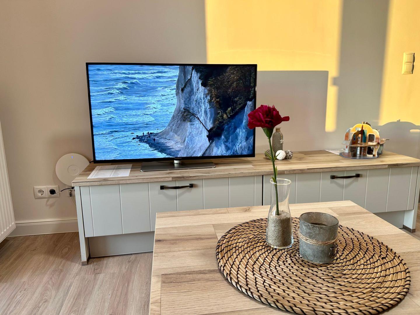 Der großzügige Wohn-/Essbereich verfügt über eine moderne und komplett ausgestattete Küchenzeile mit 4 Zonen-Induktionsfeld und Backofen , Geschirrspüler, Kühlschrank mit Gefrierfach, Mikrowelle, Wasserkocher, Toaster, Kaffeemaschine sowie diversen Küchenutensilien. Angrenzend befindet sich ein Esstisch mit vier Stühlen. Der gemütliche Wohnbereich ist mit einem Flachboard mit großem Fernsehr, einer bequemen Schlafcouch und einem Couchtisch ausgestattet. Angrenzend erreichen Sie den großzügigen Balkon mit einem Tisch, zwei Stühlen und einer Holzbank.