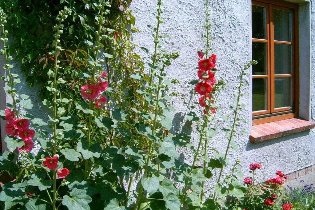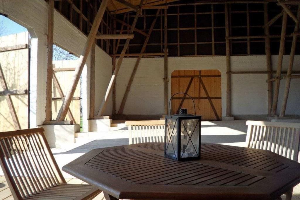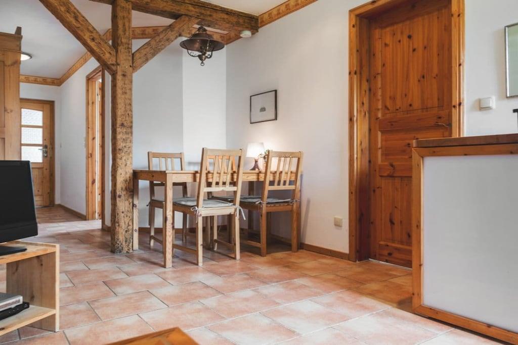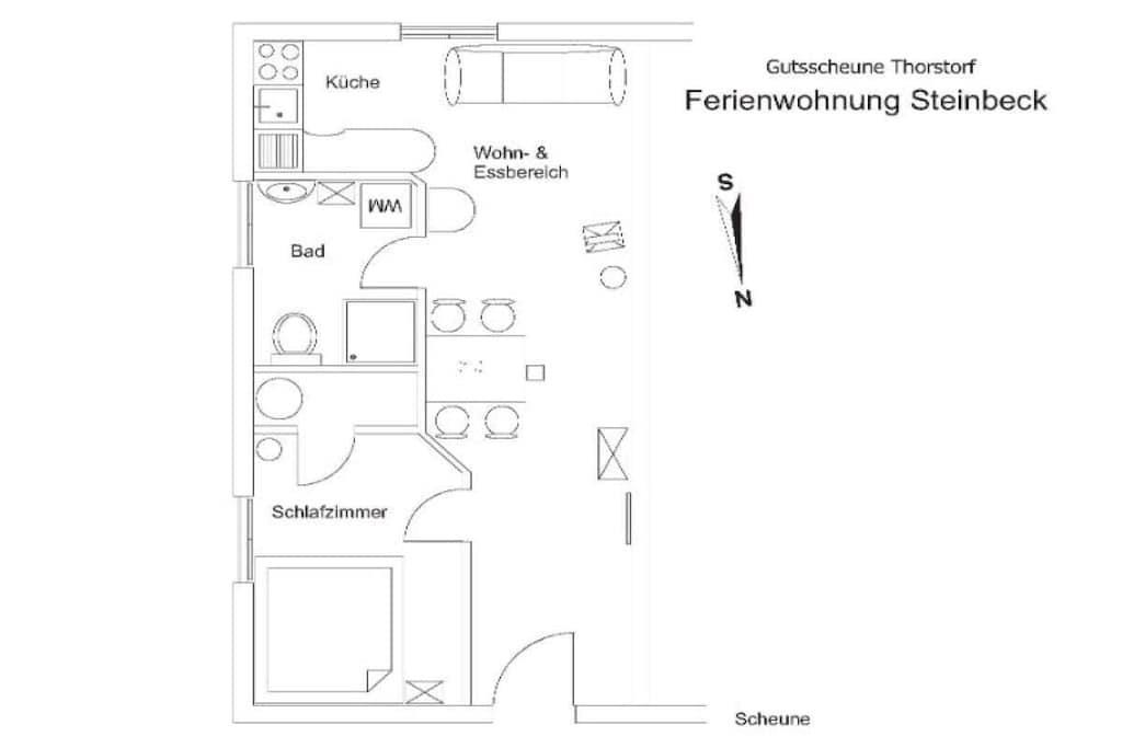 Spend your vacation in a unique three-aisled barn just 5 km from the Baltic Sea. The Steinbeck apartment on the ground floor offers approximately 40 m² of living space, including a bedroom for two people and a sofa bed in the living area that can accommodate two additional guests. Wake up to the morning sun, enjoy the view from the bathroom window, and listen to the birds chirping in the grapevines on the house wall. The old beams have been lovingly restored, their natural beauty now gracing the apartment, while the drawings of Mecklenburg motifs give it a distinctive character. Additional space is provided by the 5000 m² property and the 400 m² barn.