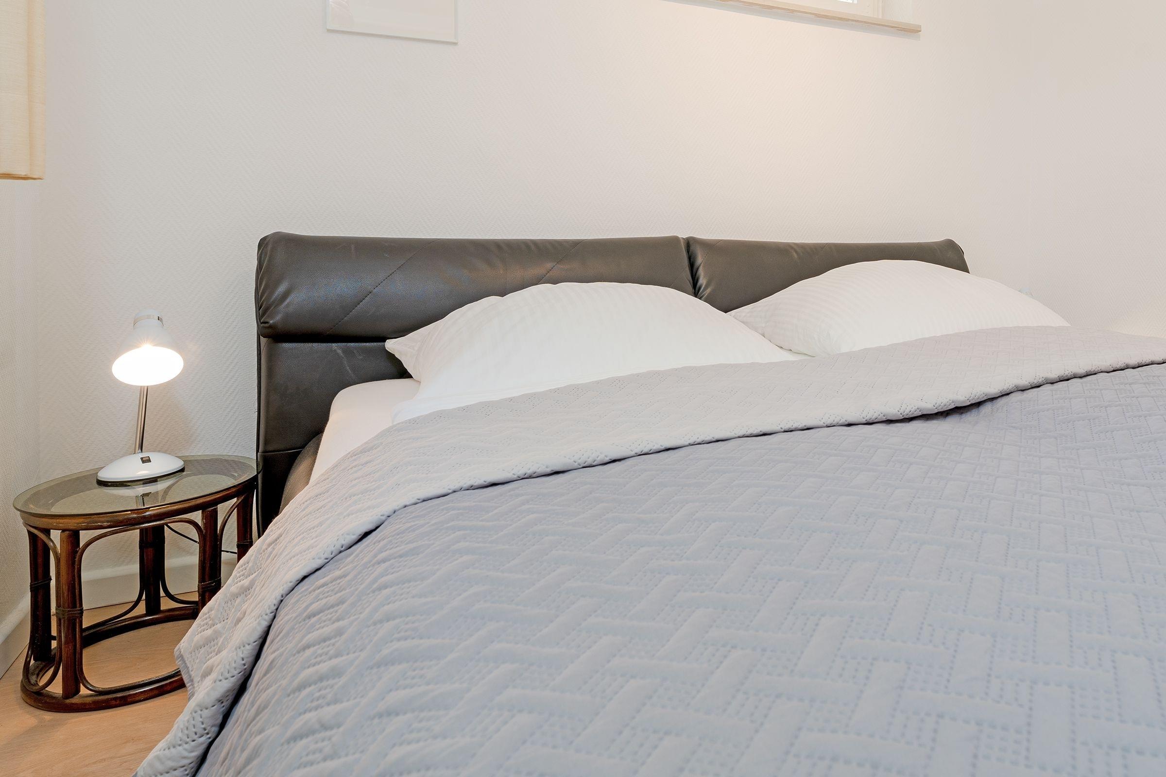Schlafzimmer: 1 Boxspringdoppelbett (180x200 cm), Kleiderschrank im Flur, Sichtschutz (Gardine), kein Platz für Kinderreisebett vorhanden