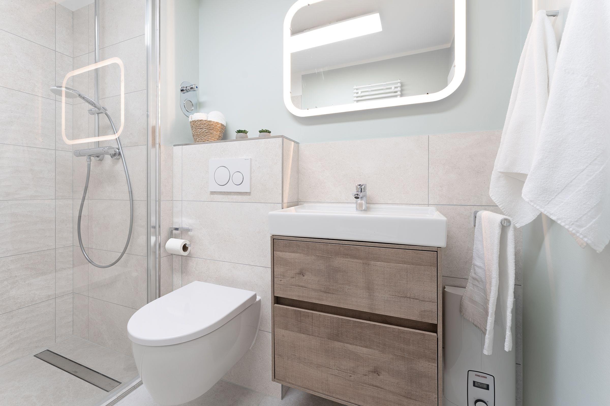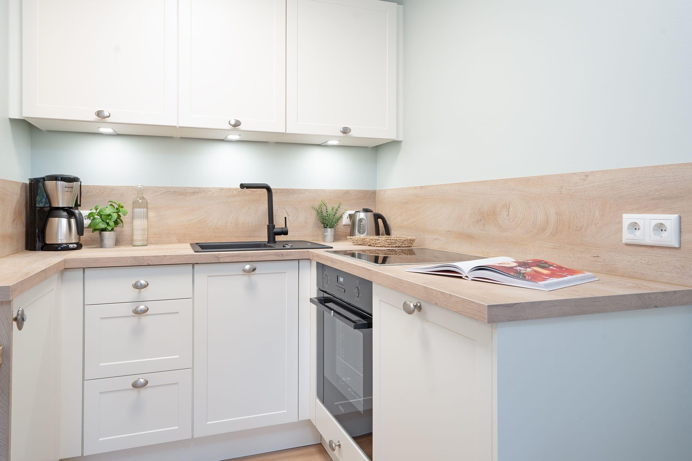 Beim Betreten dieser gemütlichen Ferienwohnung gelangen Sie direkt in den offenen Wohnbereich. Das Wohnzimmer bietet einen bequemen TV-Bereich mit Zugang zu Streaming-Diensten wie Netflix und Amazon Prime (eigene Accounts erforderlich), ideal für entspannte Abende nach einem Tag am Meer. Für die Nacht lässt sich das Schlafsofa in einen bequemen Schlafplatz umwandeln (120x200 cm). Der angrenzende Balkon ist nach Osten ausgerichtet und bietet den idealen Ort für ein Frühstück in der Morgensonne. Ein Grillplatz steht im Gemeinschaftsgarten ebenfalls zur Verfügung, falls Sie den Tag mit einem Barbecue ausklingen lassen möchten. In der integrierten Küche mit Induktionsherd, Kühl-Gefrier-Kombination und Kaffeemaschine finden Sie alles, um sich kulinarisch zu verwöhnen. Das Hauptschlafzimmer verspricht mit einem komfortablen Boxspringbett (160x200 cm) kuschelige Nächte. Im modernen Badezimmer mit komfortabler Handtuchheizung starten Sie erfrischt in Ihre Urlaubstage. Als weiteres Highlight steht Ihnen im Nachbarhaus eine Gemeinschaftssauna (Münzbetrieb) zur Verfügung.
