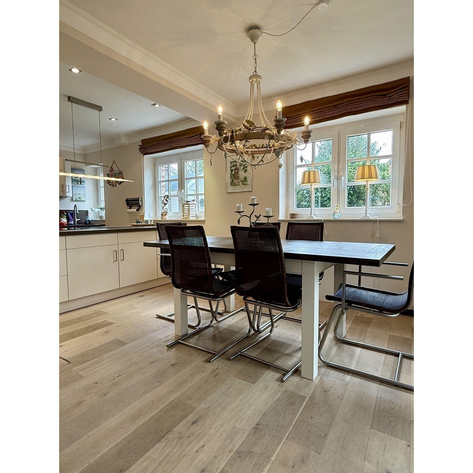 Ein modernes Badezimmer mit Dusche sorgt für Komfort, während das Herzstück dieser Etage das großzügige Wohn- und Esszimmer ist. Dieser Raum ist offen gestaltet und bietet eine behagliche Atmosphäre, die durch die angrenzende, hochwertig ausgestattete Küche der Marke Miele unterstützt wird. Hier können Sie kulinarische Genüsse zaubern und Ihre Zeit in vollen Zügen genießen.