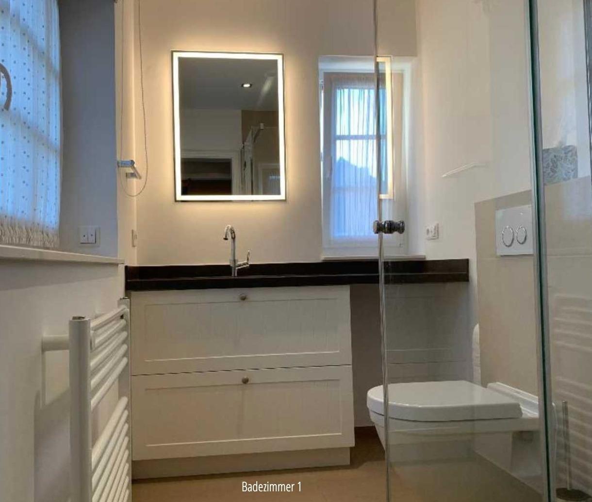 Ein weiteres Badezimmer mit Dusche rundet das Obergeschoss ab und ist zusätzlich mit einer Waschmaschine und einem Trockner der Marke Miele ausgestattet, die Ihnen den Alltag erleichtern.