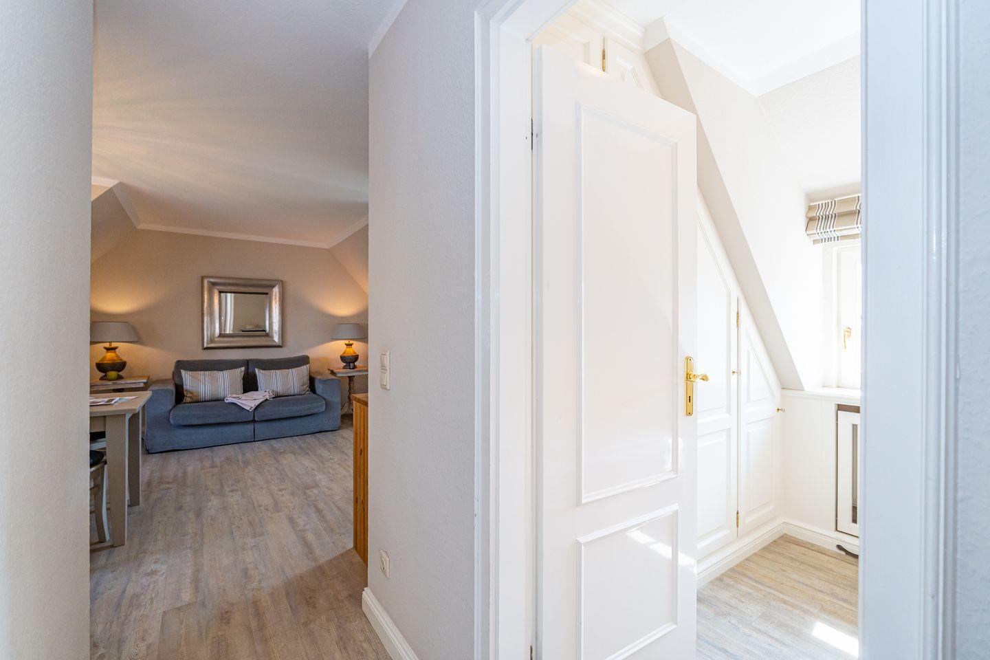 Diese 2-Zimmer-Ferienwohnung Roseneck (ca. 45 qm, im 1. OG) befindet sich im schönen Alt-Westerland und bietet Platz für bis zu zwei Personen. Durch ihre Dachschrägen hat sie einen ganz besonderen Charme. Die offen gestaltete, kleine Pantryküche (Nespresso, Cerankochfeld, Spülmaschine, Filterkaffeemaschine) grenzt an den Esstisch mit Stühlen. Das helle Wohnzimmer verfügt über ein Sofa und TV. Das Bad (ebenfalls mit Schrägen) verfügt über eine Wannen-Dusch-Kombination. Im kleinen Schlafzimmer sind ein Doppelbett (160 x 200 cm) und weiße Einbauschränke vorhanden. Zu dieser Ferienwohnung gehören eine Sonnenkuhle und ein Pkw-Stellplatz, direkt hinter dem Haus. Bitte beachten Sie, dass dies eine Nichtraucherwohnung ist und es kein WLAN gibt.
