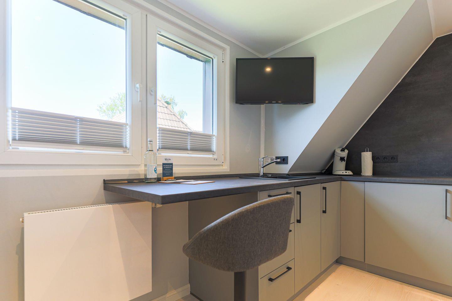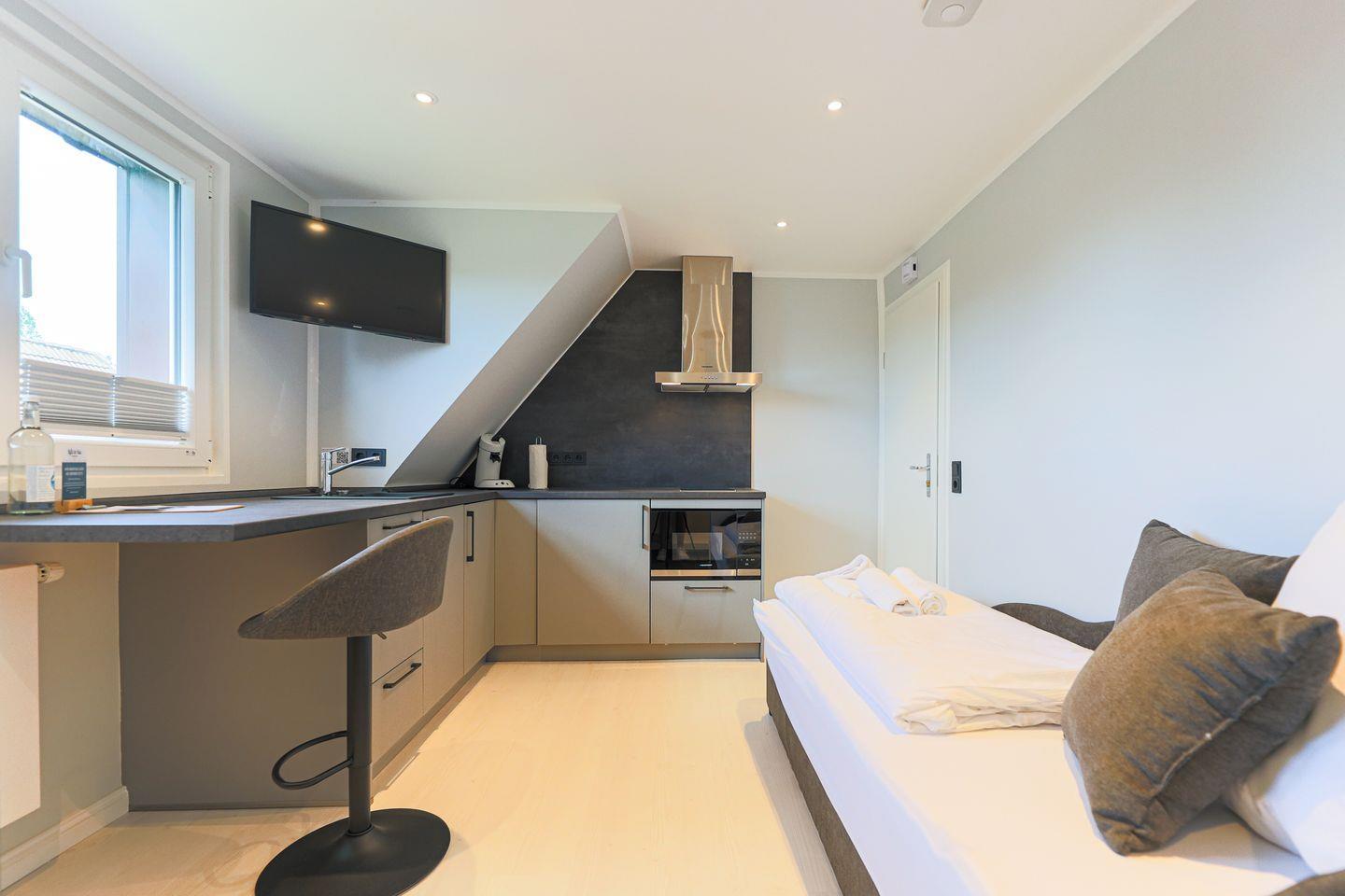 Der Wohnraum vereint ein bequemes Schlafsofa und eine relativ große, offene Küchenzeile, die noch genügend Platz für eine kleine "Ess-Ecke" bietet.