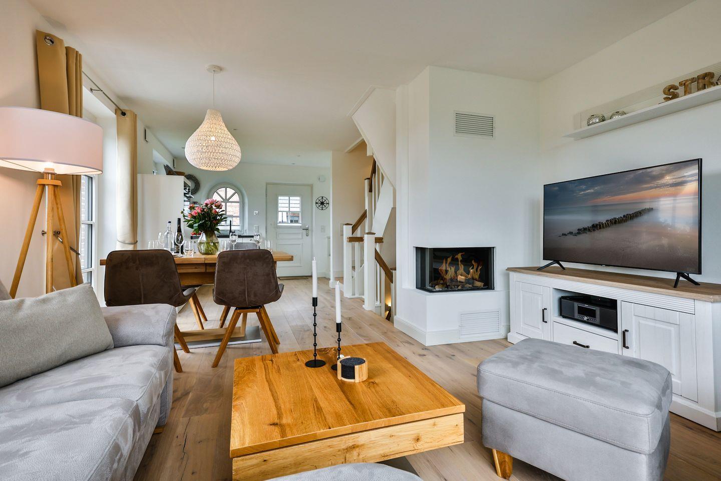mit komfortabler Sofaecke, Gaskamin und großem Esstisch. Vom Wohnbereich haben