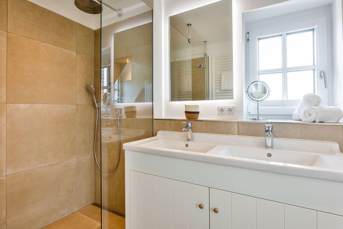 Doppelbett und TV. Zwei komfortable Vollbadezimmer sorgen für einen entspannten