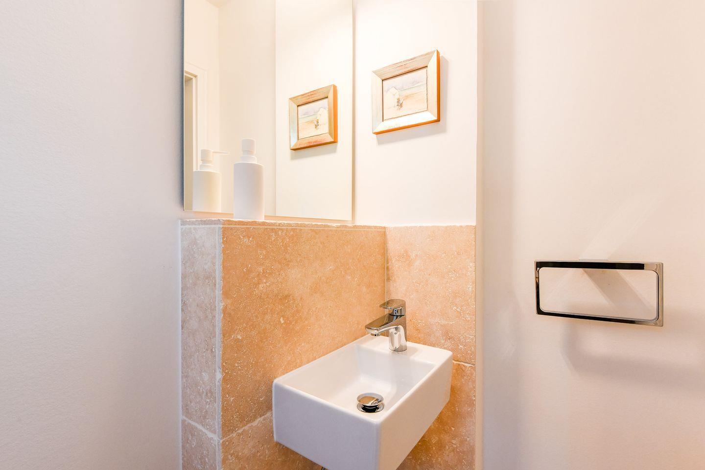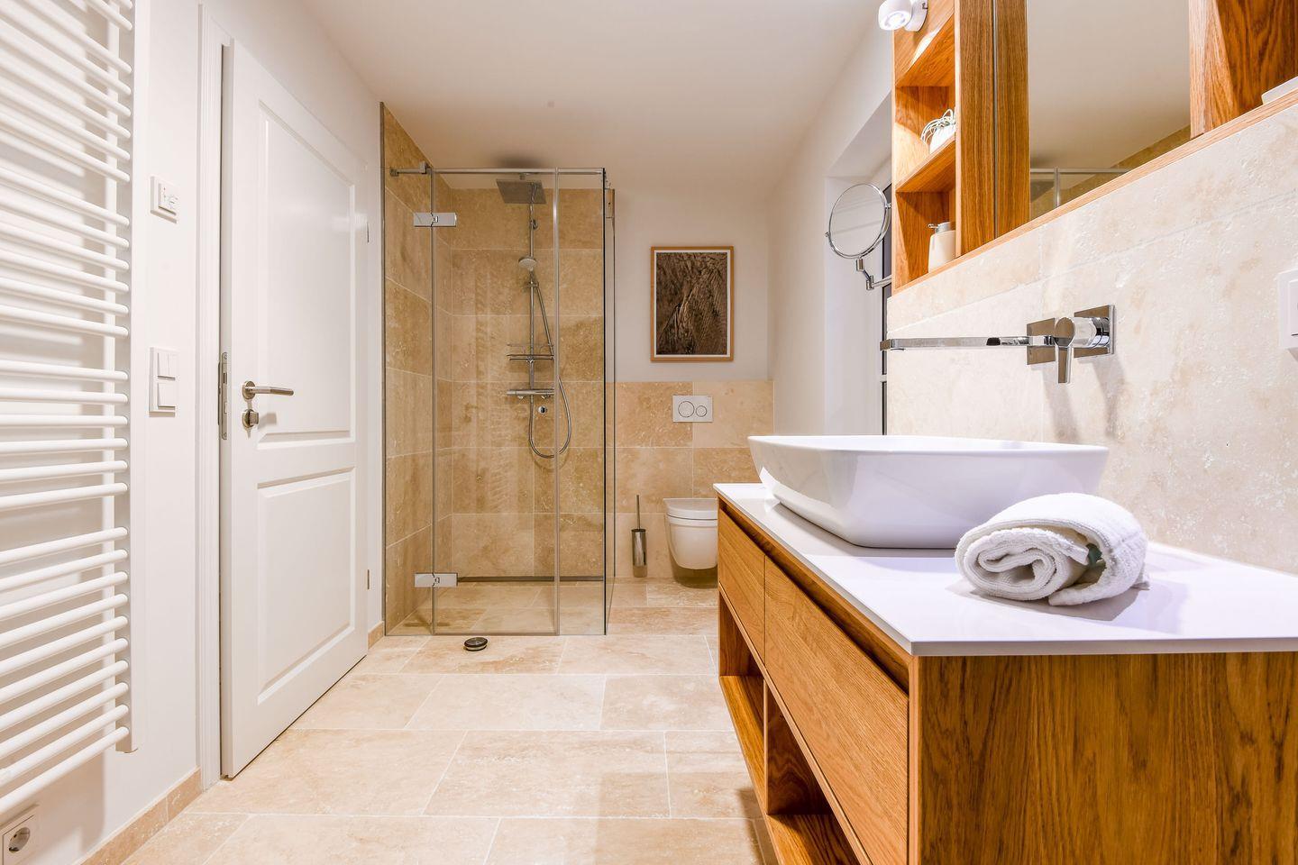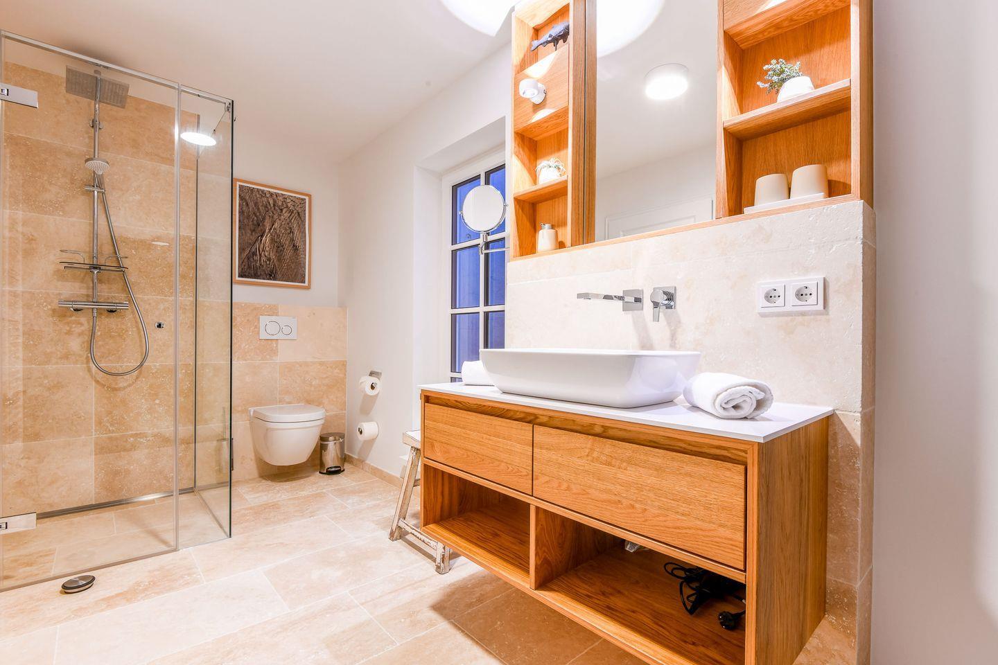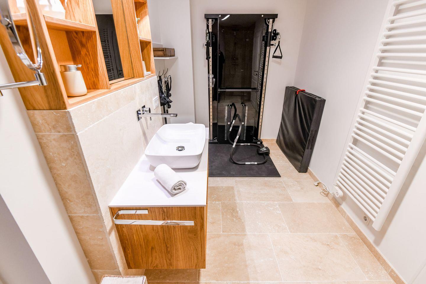 Die zwei modernen Badezimmer bieten höchsten Komfort: Das erste Duschbad besticht durch eine ebenerdige Dusche, Tageslicht, Fußbodenheizung und einen Fön. Ein Wellnessbad im Untergeschoss verwöhnt Sie mit einer großzügigen Regendusche, Fußbodenheizung und einem kleinen Fitnessbereich, ideal zum Entspannen nach einem ereignisreichen Tag auf der Insel.