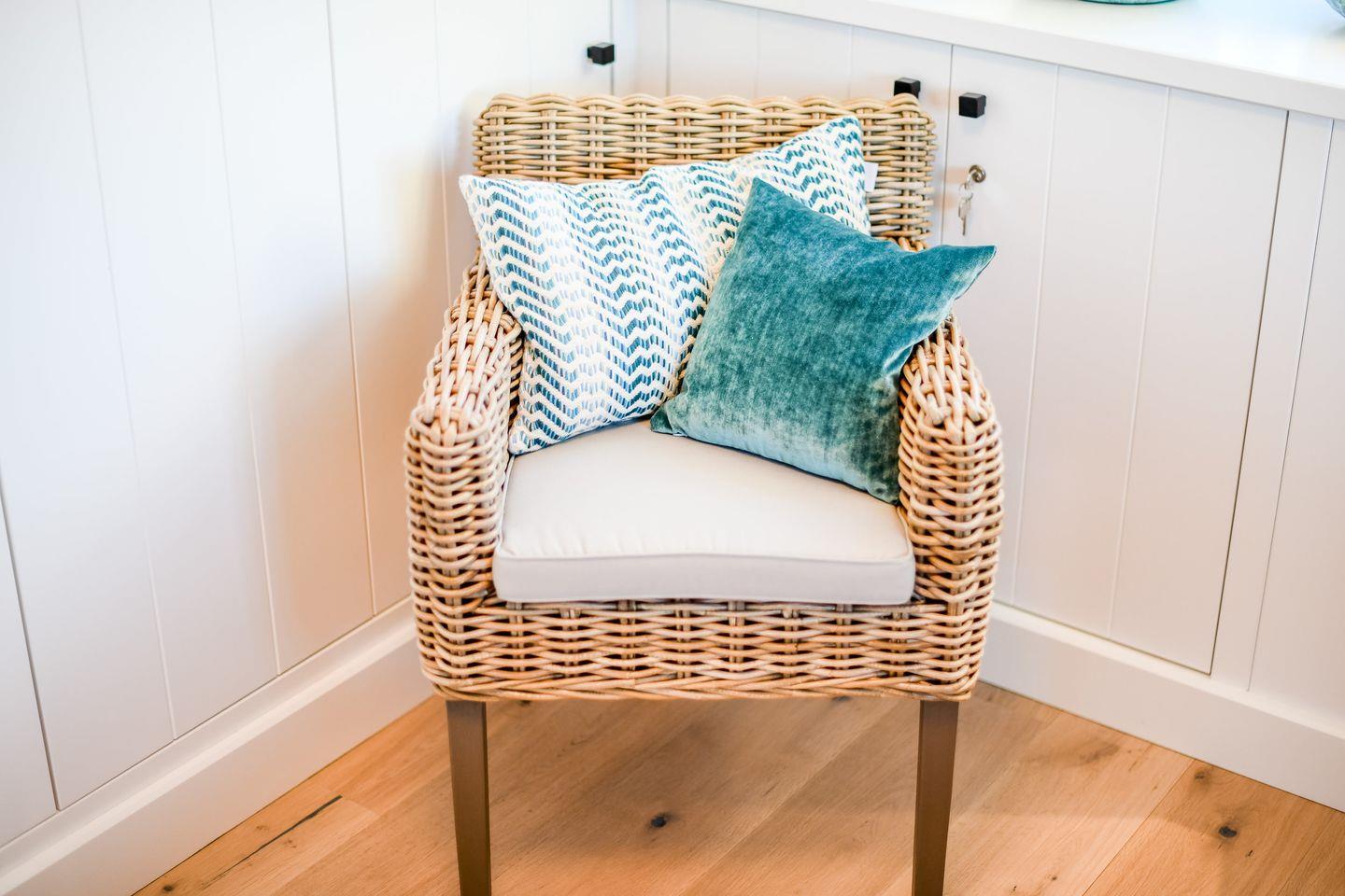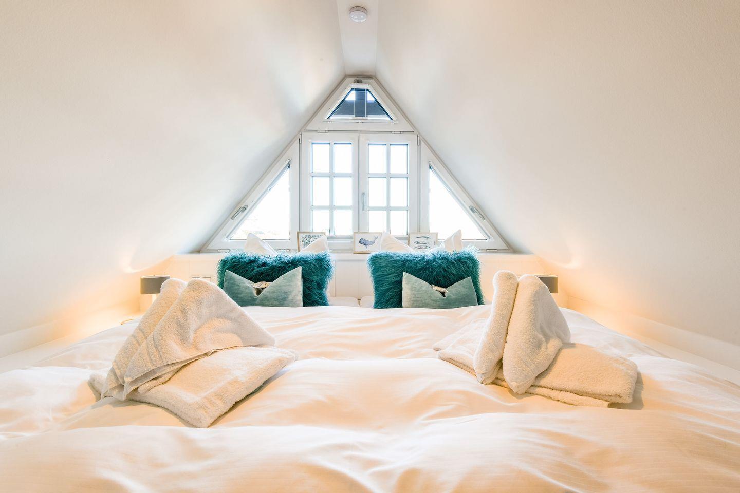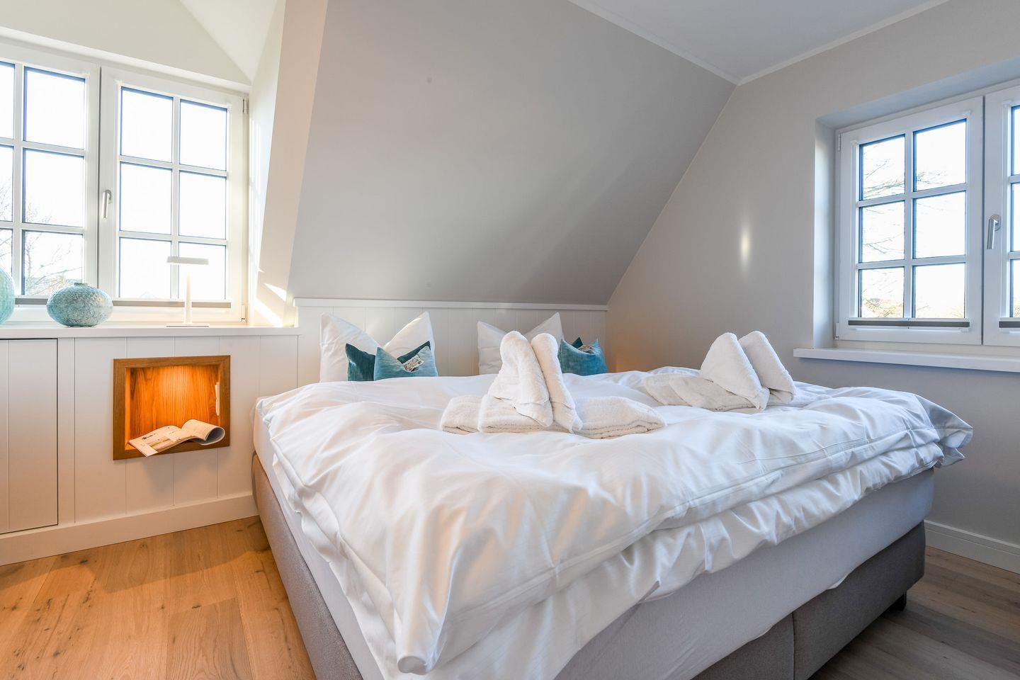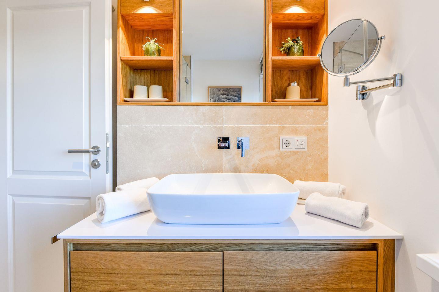 Die zwei modernen Badezimmer bieten höchsten Komfort: Das erste Duschbad besticht durch eine ebenerdige Dusche, Tageslicht, Fußbodenheizung und einen Fön. Ein Wellnessbad im Untergeschoss verwöhnt Sie mit einer großzügigen Regendusche, Fußbodenheizung und einem kleinen Fitnessbereich, ideal zum Entspannen nach einem ereignisreichen Tag auf der Insel.