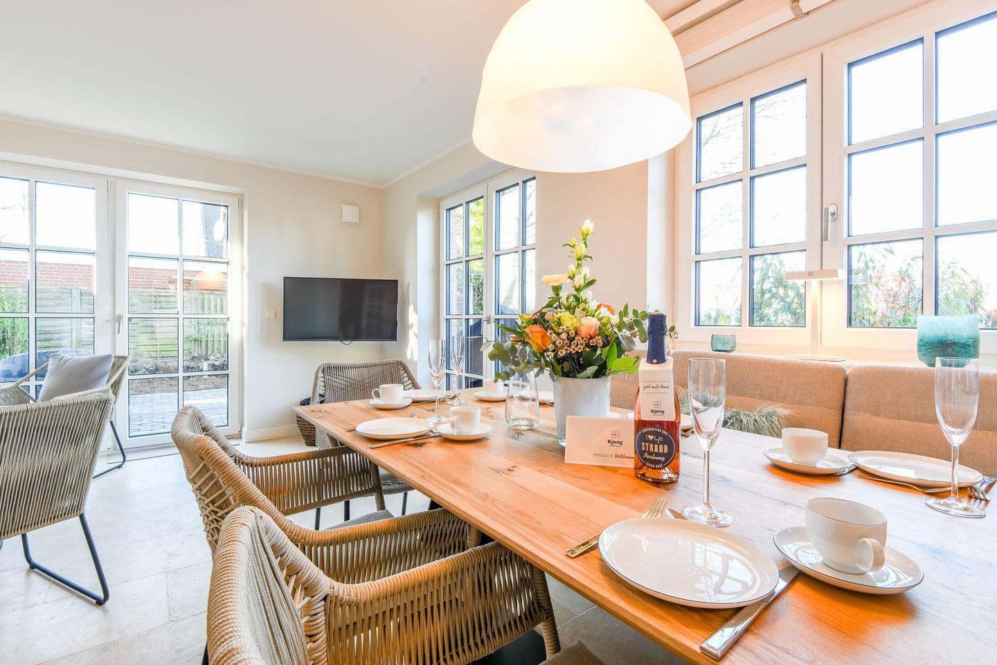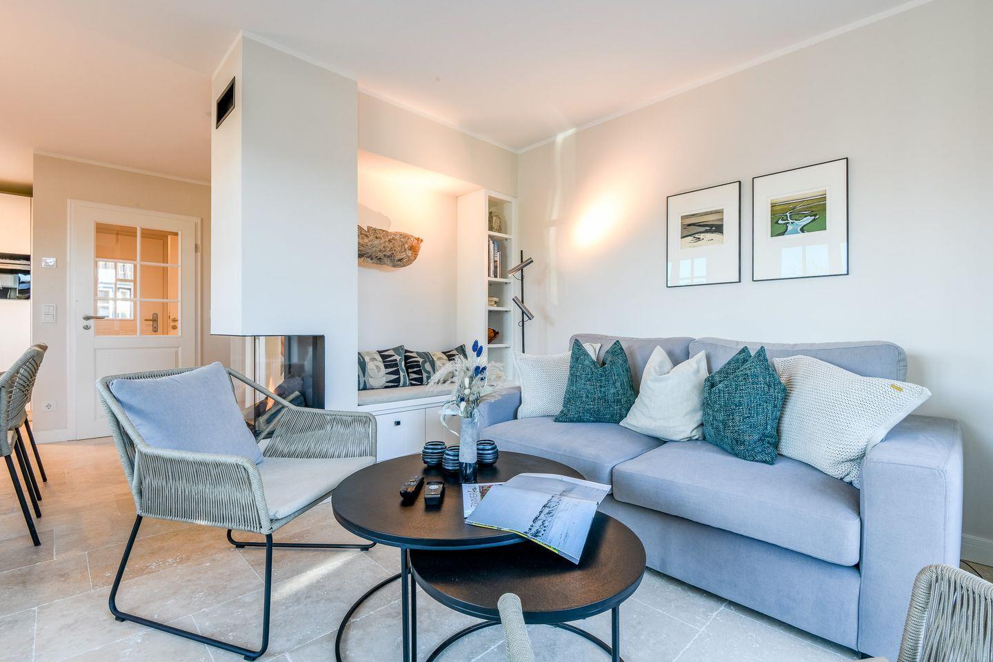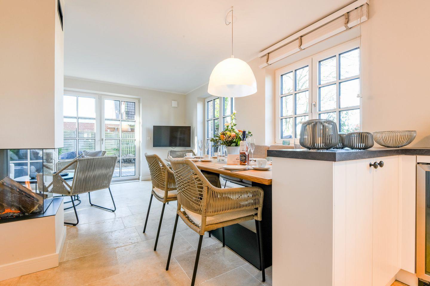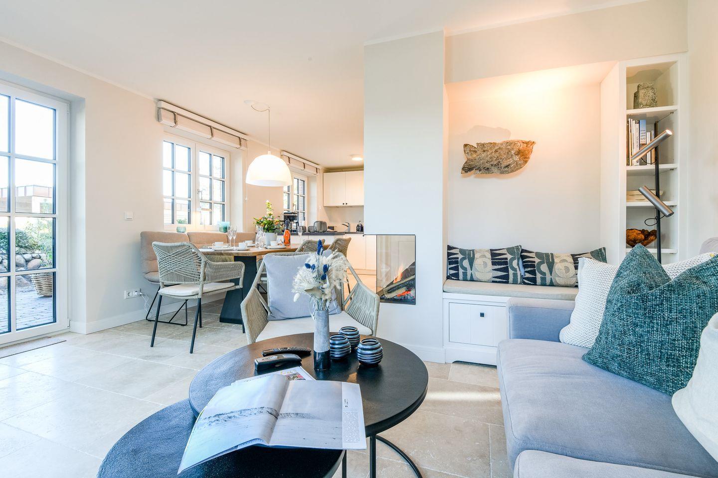 Das lichtdurchflutete Wohnzimmer lädt mit seiner gemütlichen Sofaecke und dem Gaskamin zum Entspannen ein. Hier schließt sich der Essbereich an, der direkt mit der hochwertig ausgestatteten Küche verbunden ist und für gemeinsame Mahlzeiten der perfekte Ort ist. Von hier gelangen Sie auf die sonnige Westterrasse mit Loungemöbeln und einer praktischen Überdachung. Eine zweite Terrasse bietet Platz für bis zu sechs Personen an einem großen Tisch und verfügt über eine Sonnenliege, die flexibel aufgestellt werden kann – ideal für entspannte Sommerabende im Freien.