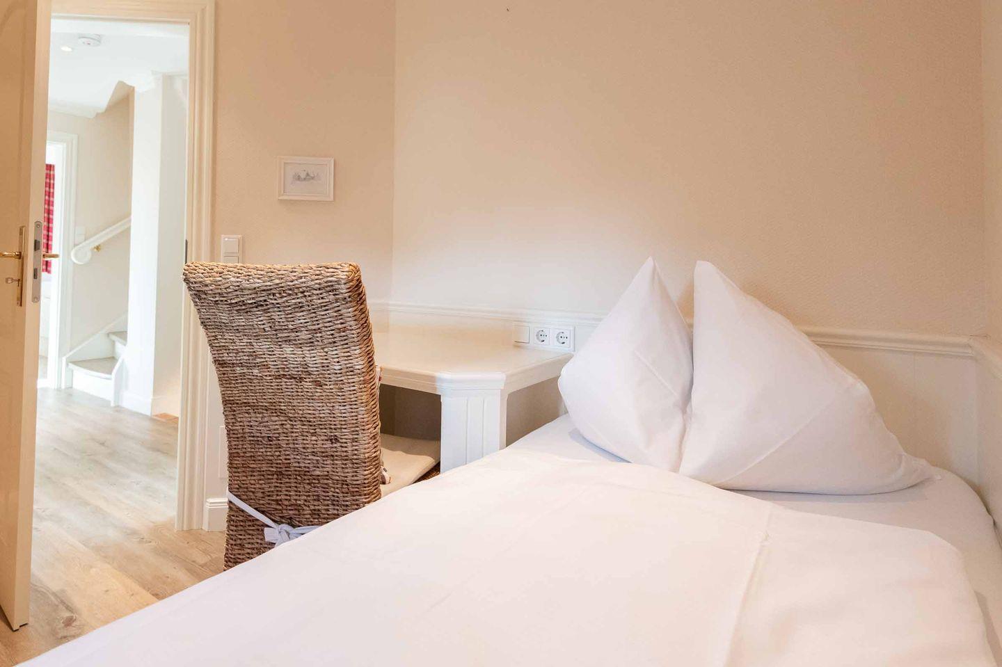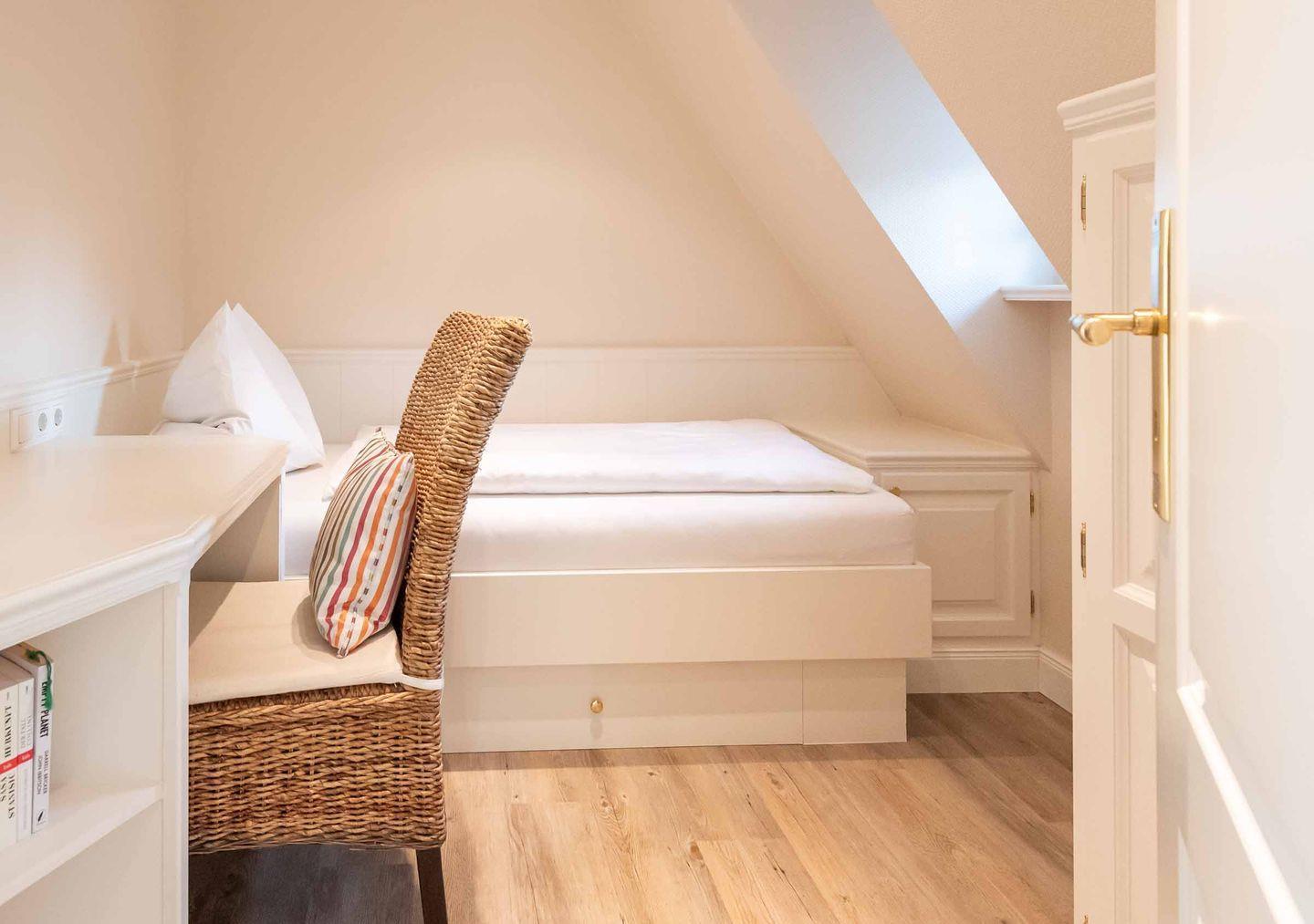 Schlafzimmer 3: Gemütliches Schlafzimmer mit Einzelbett. In diesem Schlafzimmer befindet sich ein Schreibtisch, der auch mobiles Arbeiten im Urlaub ermöglicht