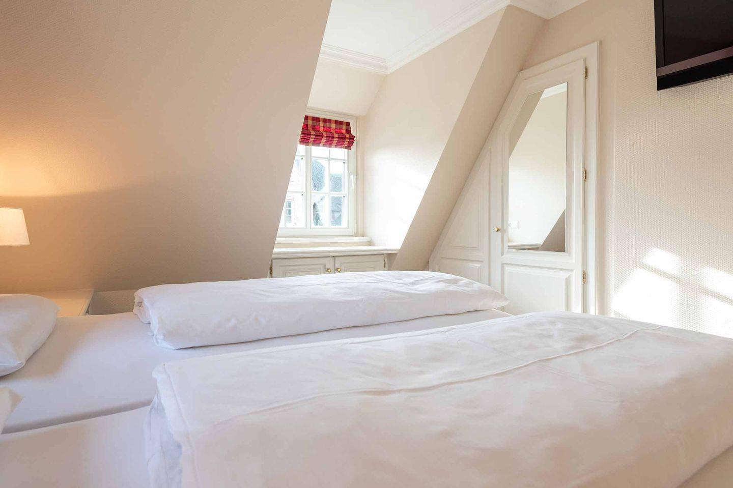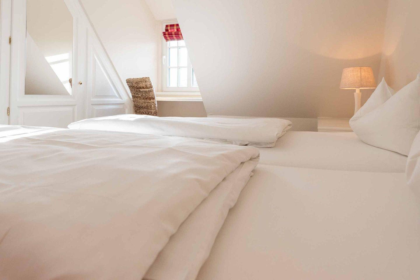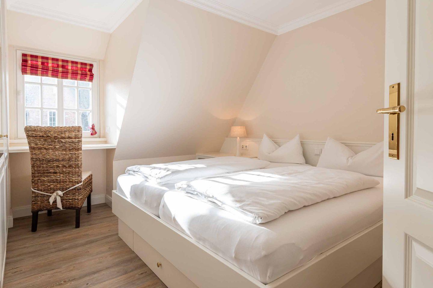 Schlafzimmer 2: Doppelbett, Kleiderschrank, ein kleiner Schreibbereich, der auch mobiles Arbeiten im Urlaub ermöglicht