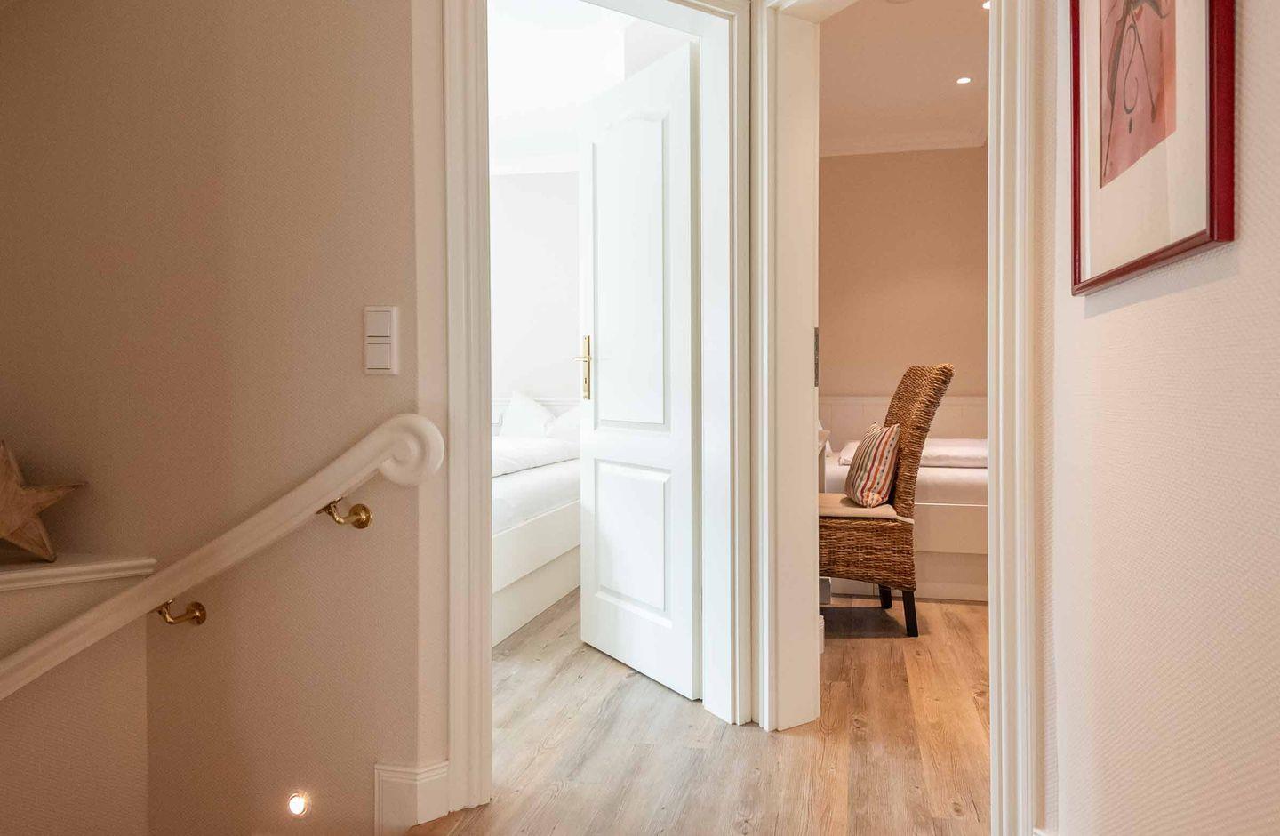 Eine gut begehbare Treppe mit Handlauf führt in das Obergeschoss: