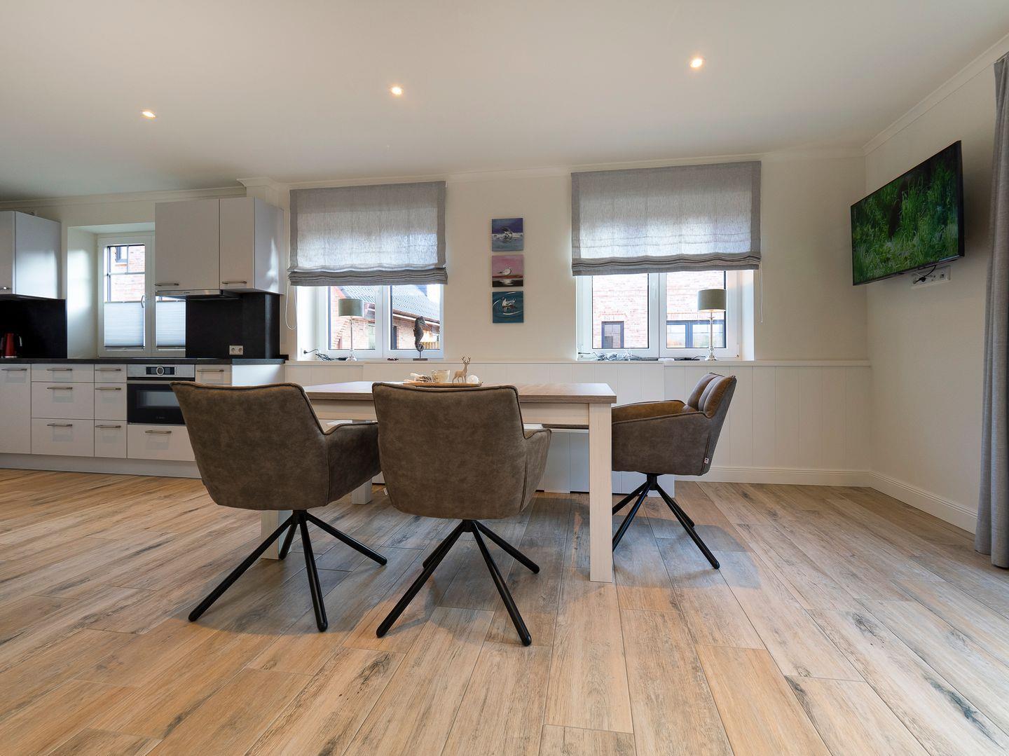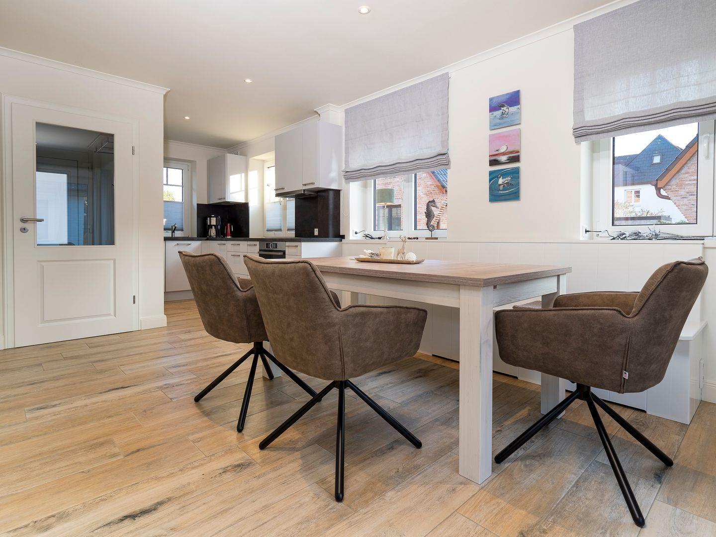 Wohn-/Essbereich: Angrenzend zur offenen Küche befindet sich der gemütliche Essbereich mit hochwertiger Tischlerbank und Blick in den grünen Garten. Der helle Wohnraum mit bequemer Sofaecke und TV lädt zum Verweilen ein. Von hier haben Sie direkten Zugang zur schönen Südterrasse mit Saisonstrandkorb (ca. April bis Oktober) und Gartenmöbeln.