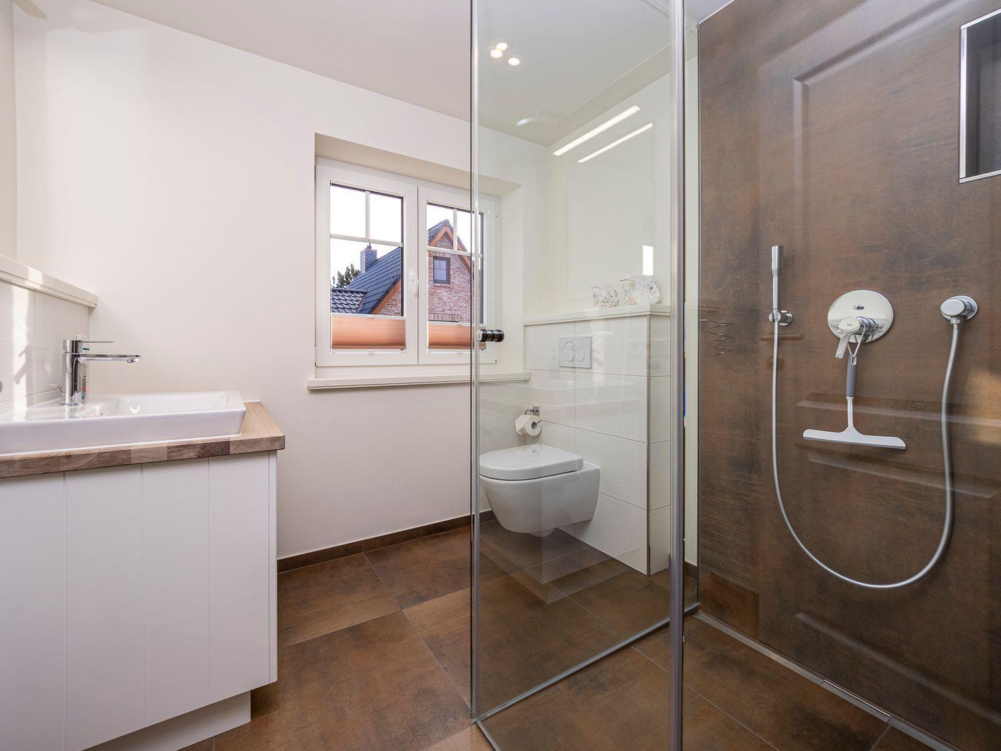 Gäste-WC: Gäste-WC mit Dusche und Fenster auf Wohnebene