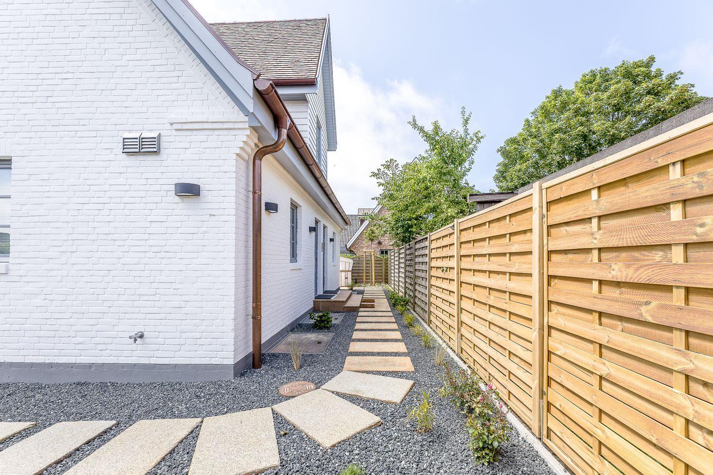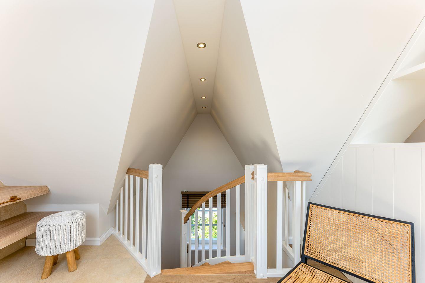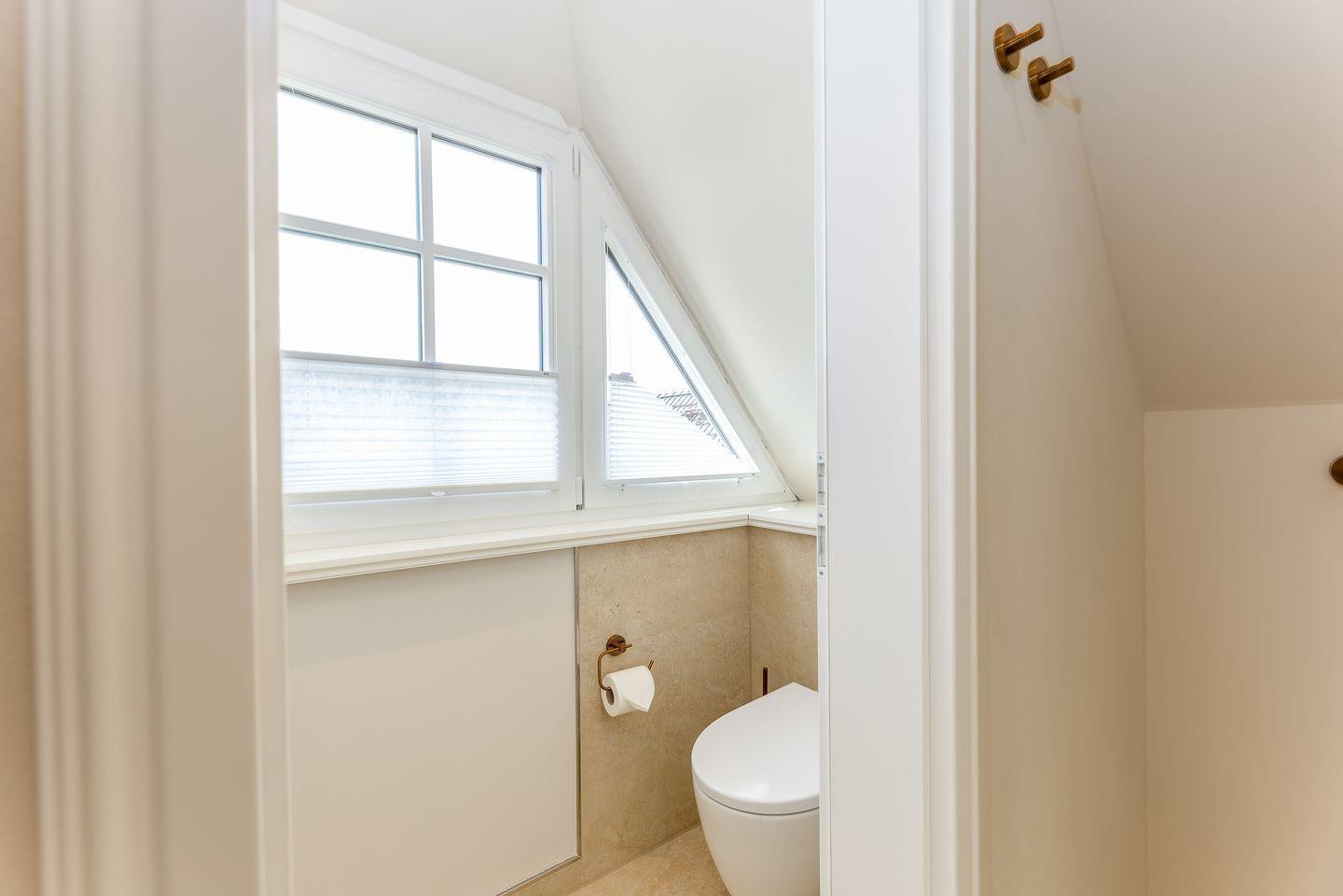 Ebenfalls im Obergeschoss befindet sich auch eins der beiden Schlafzimmer. Hier ist alles auf schöne Träume ausgerichtet: verantwortlich dafür sind das hochwertige und kuschelige Boxspringbett, harmonische Farben sowie ein kluges Lichtkonzept. Das Badezimmer auf dieser Etage trumpft nicht nur durch seine große Walk-in-Dusche, sondern auch durch einen stillvollen Holzwaschtisch und Armaturen sowie Accessoires in Messing auf.