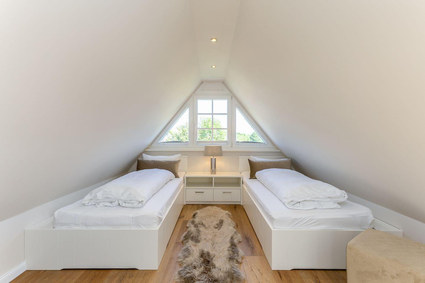 Eine Treppe höher geht es genauso schön weiter. In den beiden Einzelbetten schlummert es sich herrlich, und beim Aufwachen ist der erste Gedanke: himmlisch! Hier hat sich offene das Bad klug geteilt. Ein offener Waschtisch und dahinter gleich die Dusche. Einzig die Toilette hat einen eigen kleinen Raum bekommen.