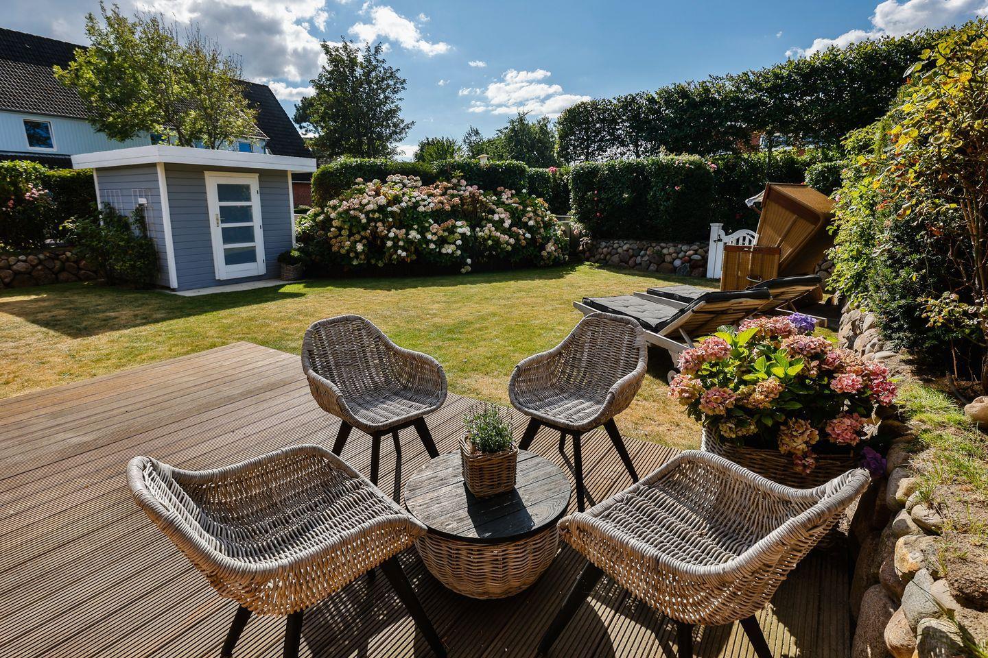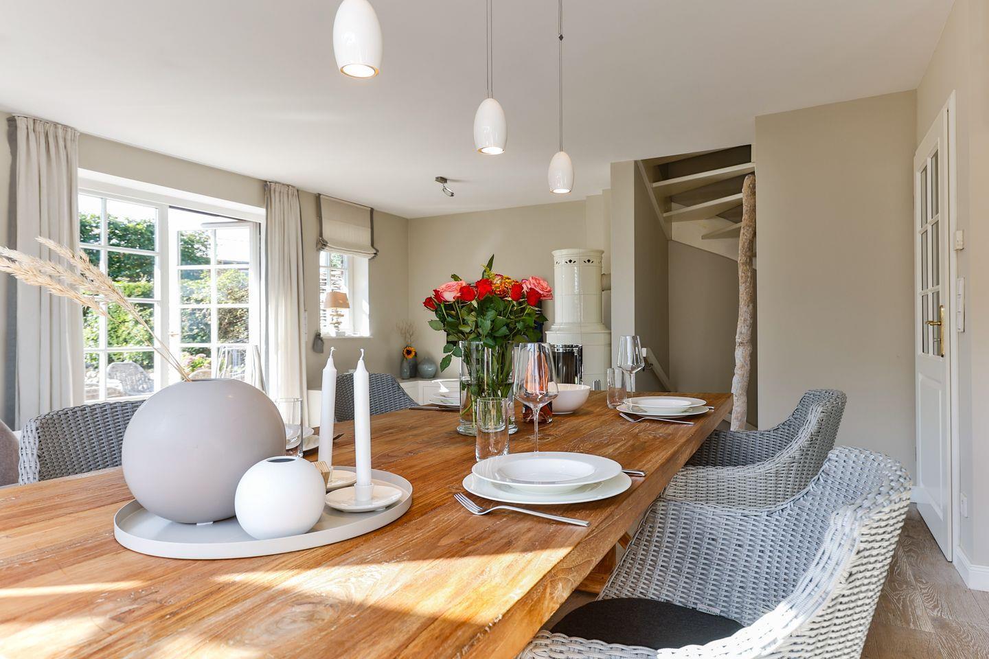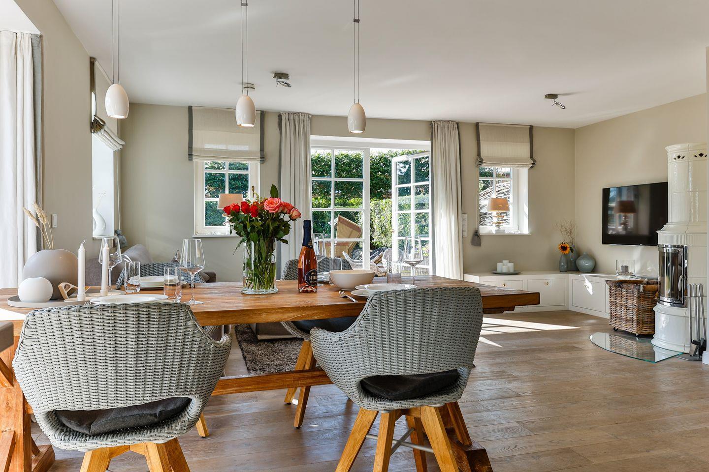 Das helle Wohn- und Esszimmer lädt mit einem gemütlichen Sofa, einem großen Esstisch und einem modernen TV zum Entspannen ein. Von hier aus haben Sie direkten Zugang zur Westterrasse und zur sonnigen Südterrasse, die beide in den schön angelegten Garten führen. Hier können Sie die frische Meeresluft in vollen Zügen genießen und entspannte Stunden im Freien verbringen.