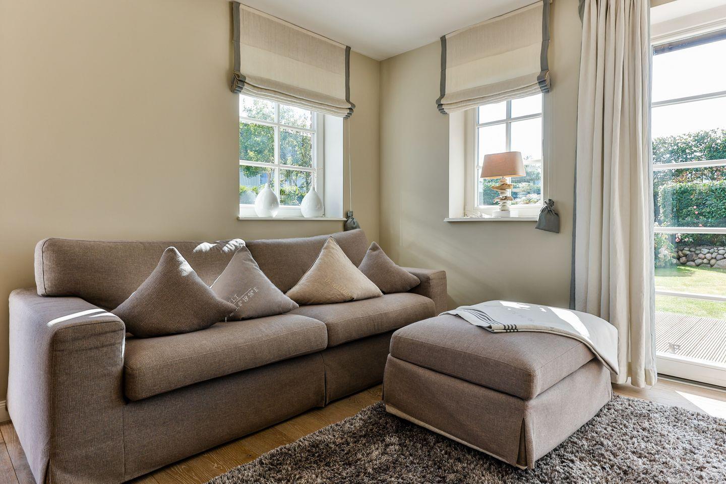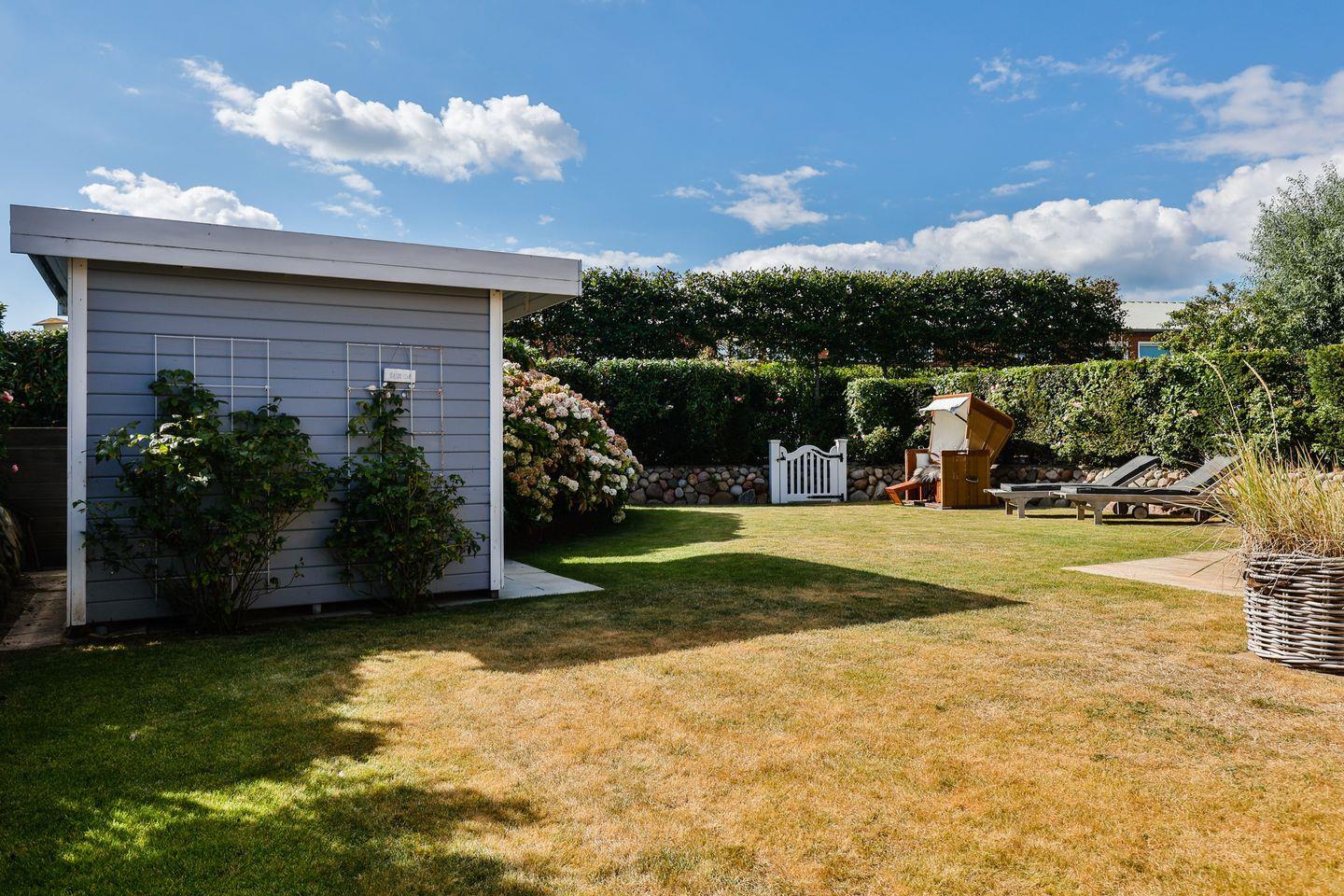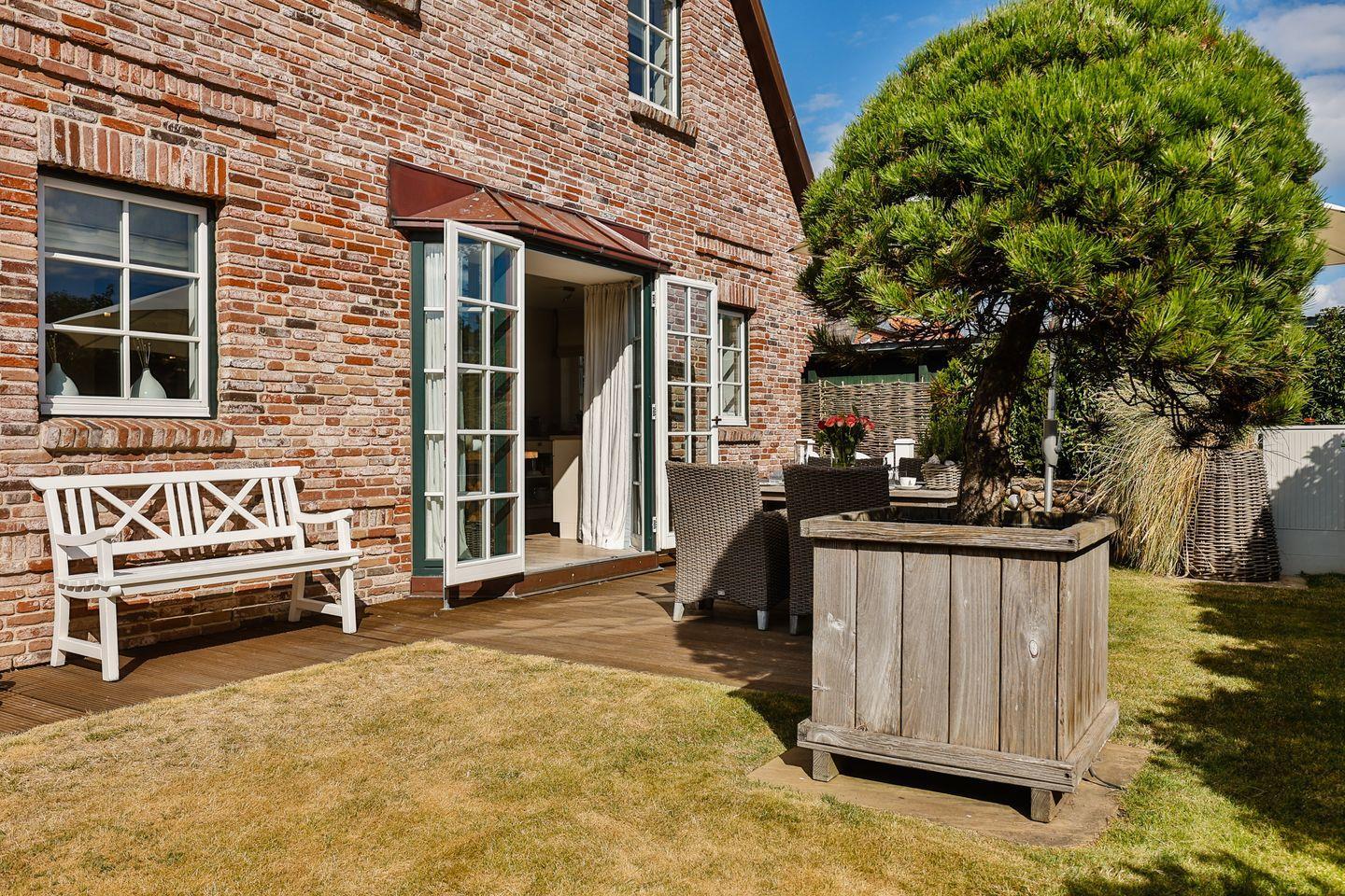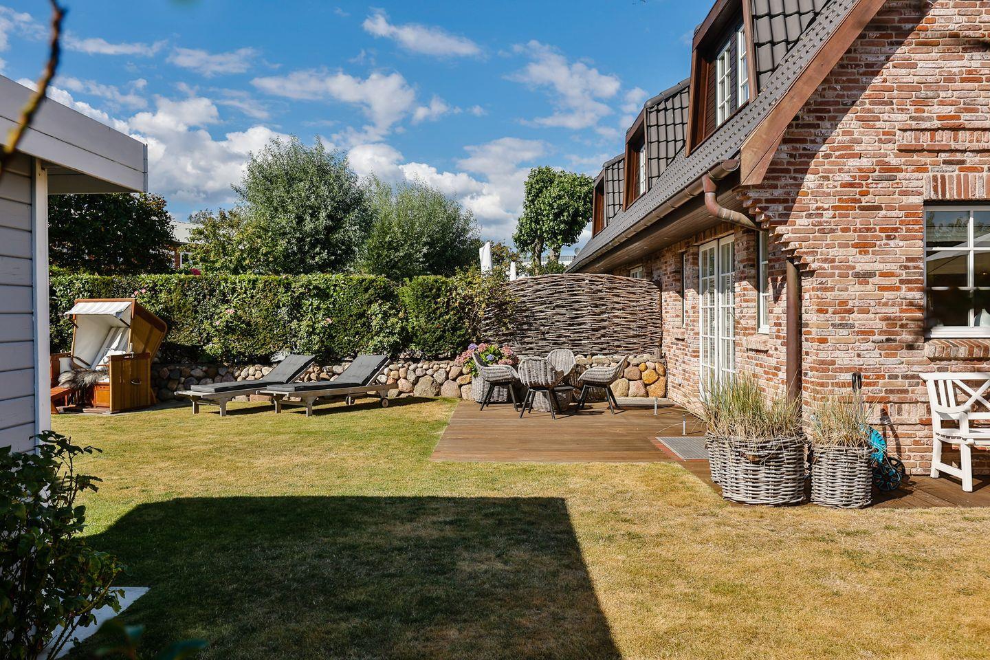 Das helle Wohn- und Esszimmer lädt mit einem gemütlichen Sofa, einem großen Esstisch und einem modernen TV zum Entspannen ein. Von hier aus haben Sie direkten Zugang zur Westterrasse und zur sonnigen Südterrasse, die beide in den schön angelegten Garten führen. Hier können Sie die frische Meeresluft in vollen Zügen genießen und entspannte Stunden im Freien verbringen.