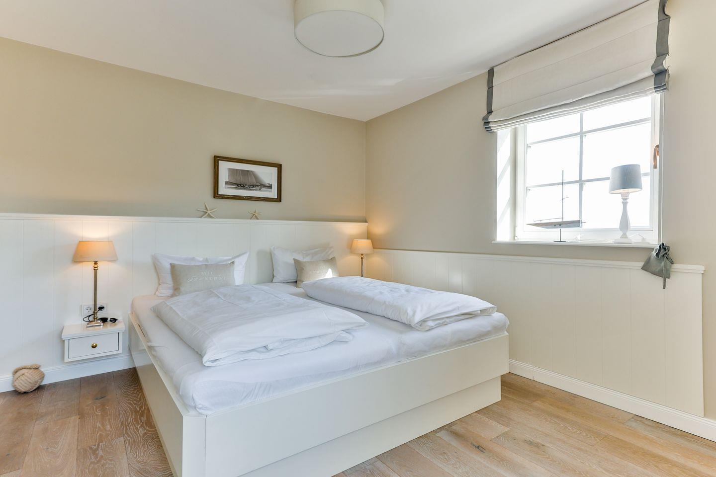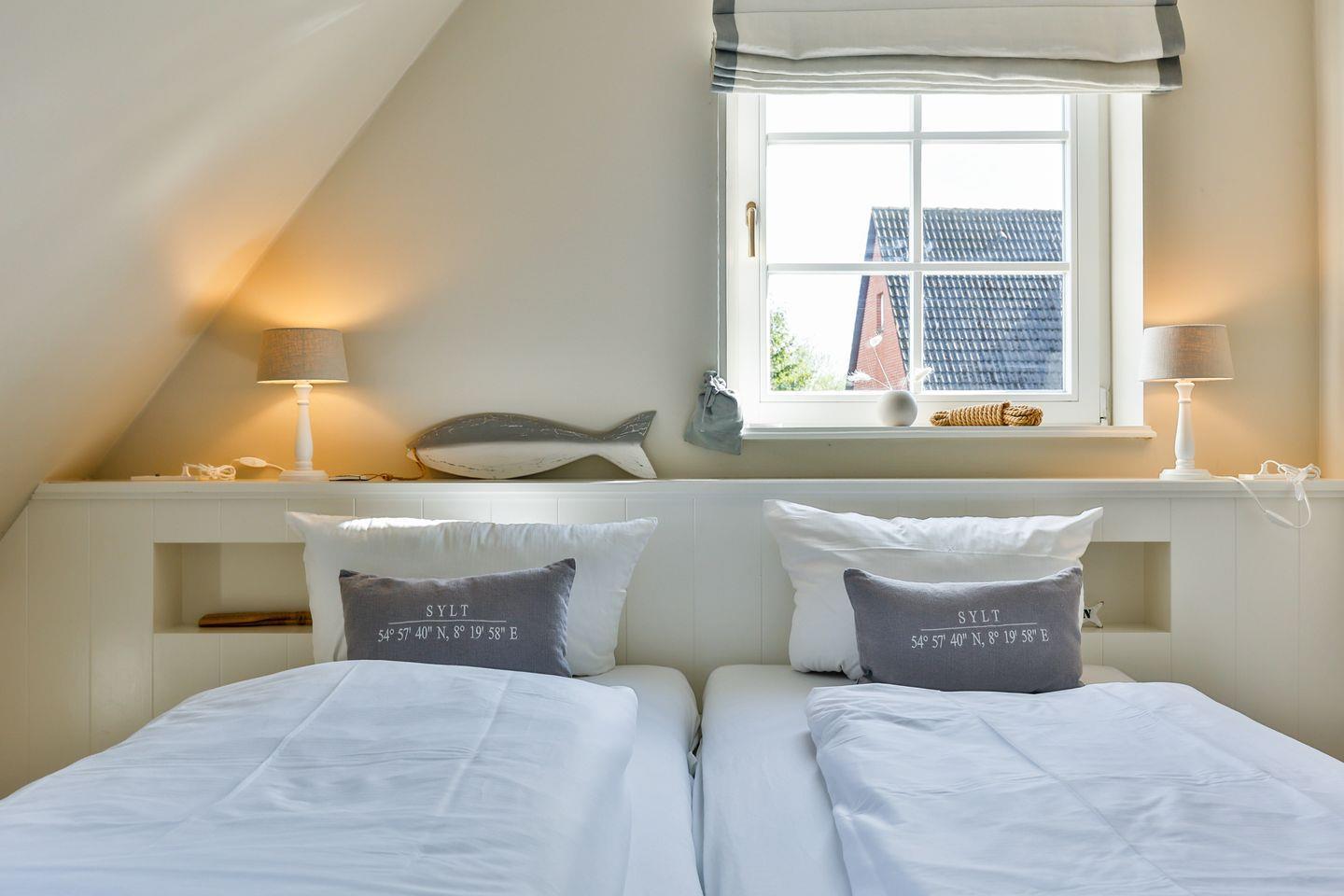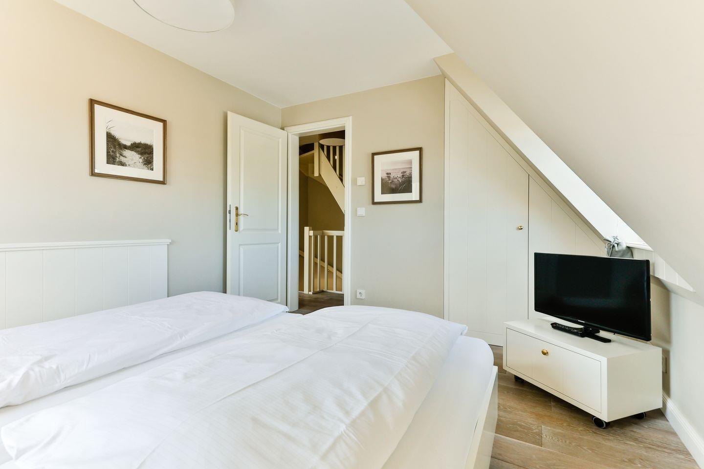 Die beiden Schlafzimmer sind ideal für erholsame Nächte. Das Hauptschlafzimmer, nach Südwesten ausgerichtet, verfügt über ein Doppelbett (2x 90x200 cm) und einen TV. Das zweite Schlafzimmer ist nach Südosten ausgerichtet und bietet zwei Einzelbetten (je 90x200 cm) sowie ebenfalls einen TV – perfekt für Gäste oder Familienmitglieder.