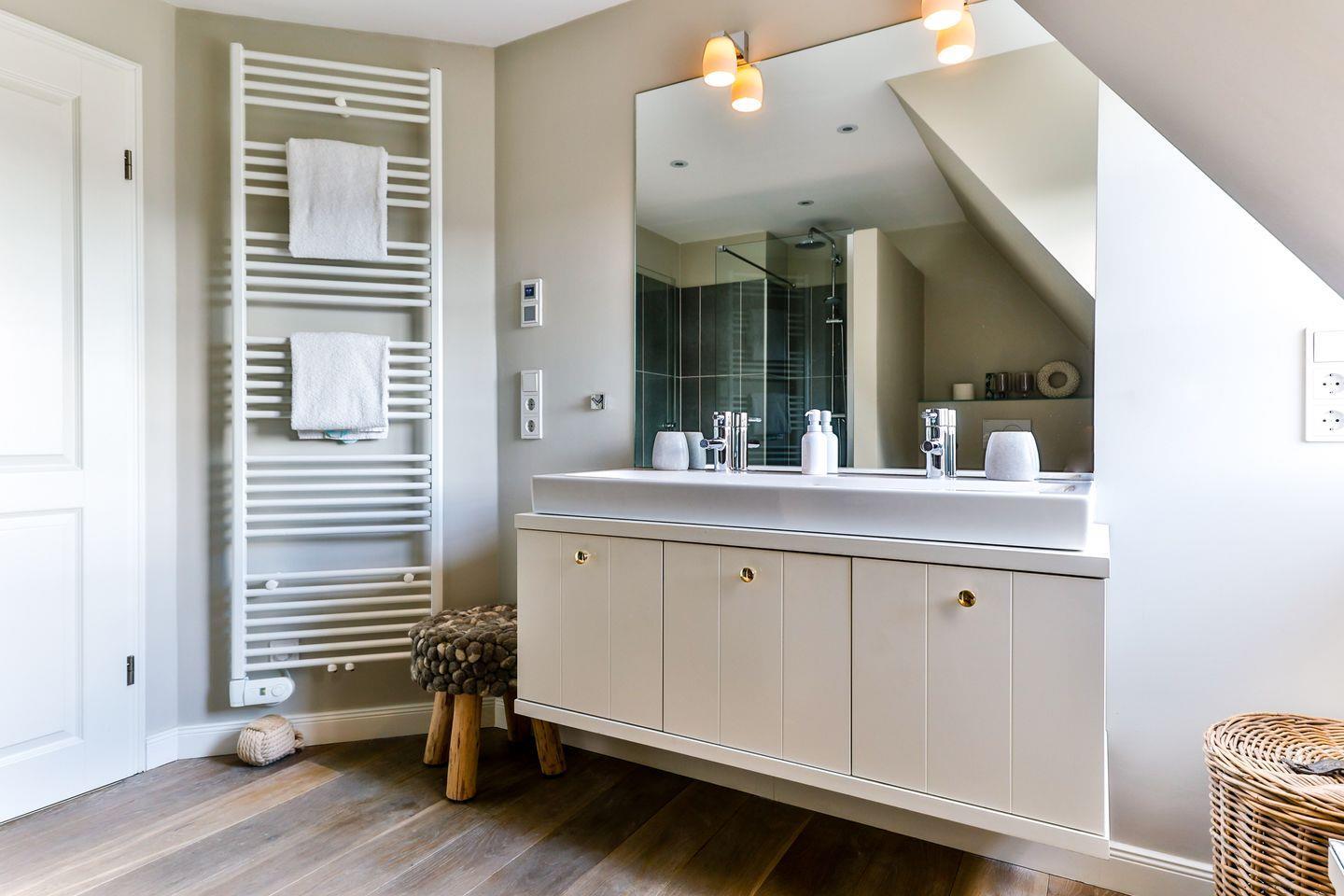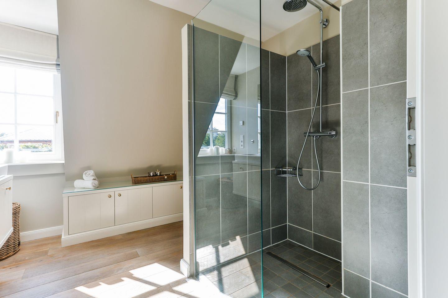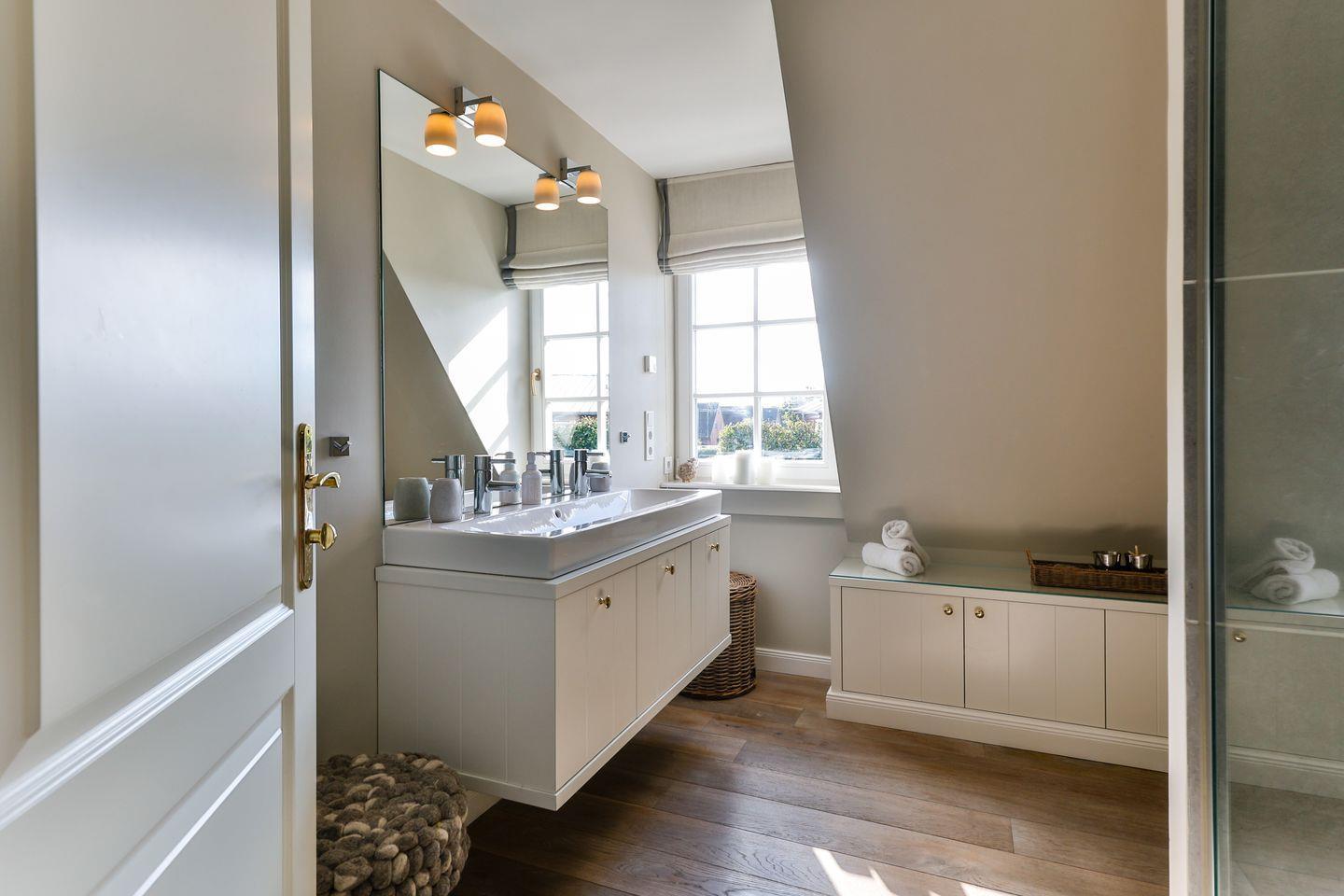 Die zwei stilvoll eingerichteten Badezimmer, jeweils mit Regendusche, WC, Tageslicht und Föhn ausgestattet, sorgen für einen entspannten Start in den Tag. Ein zusätzliches Gäste-WC bietet weiteren Komfort für alle Gäste.